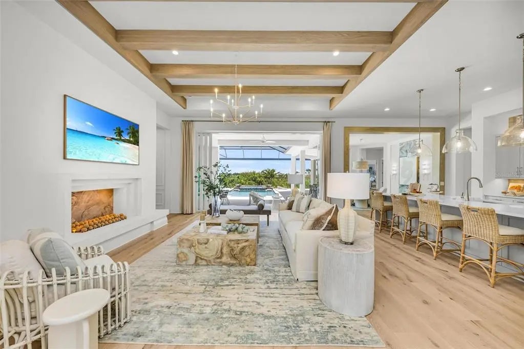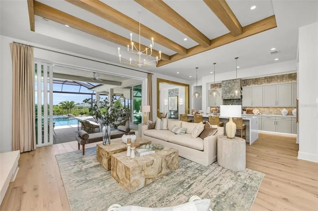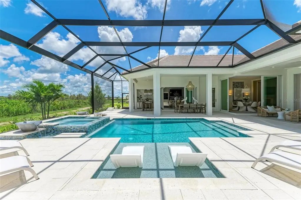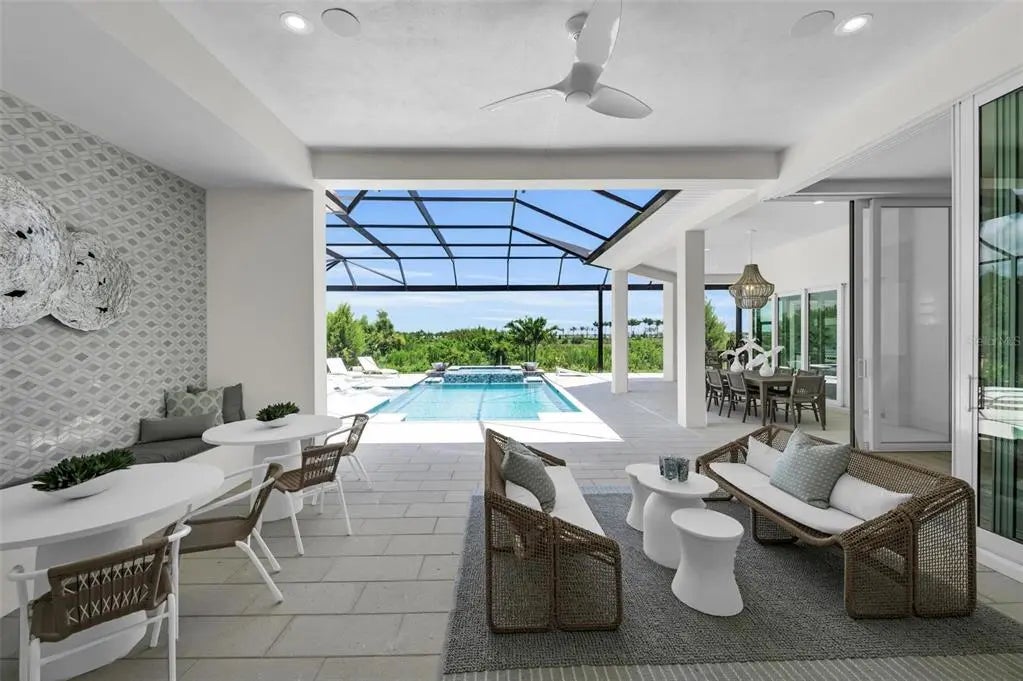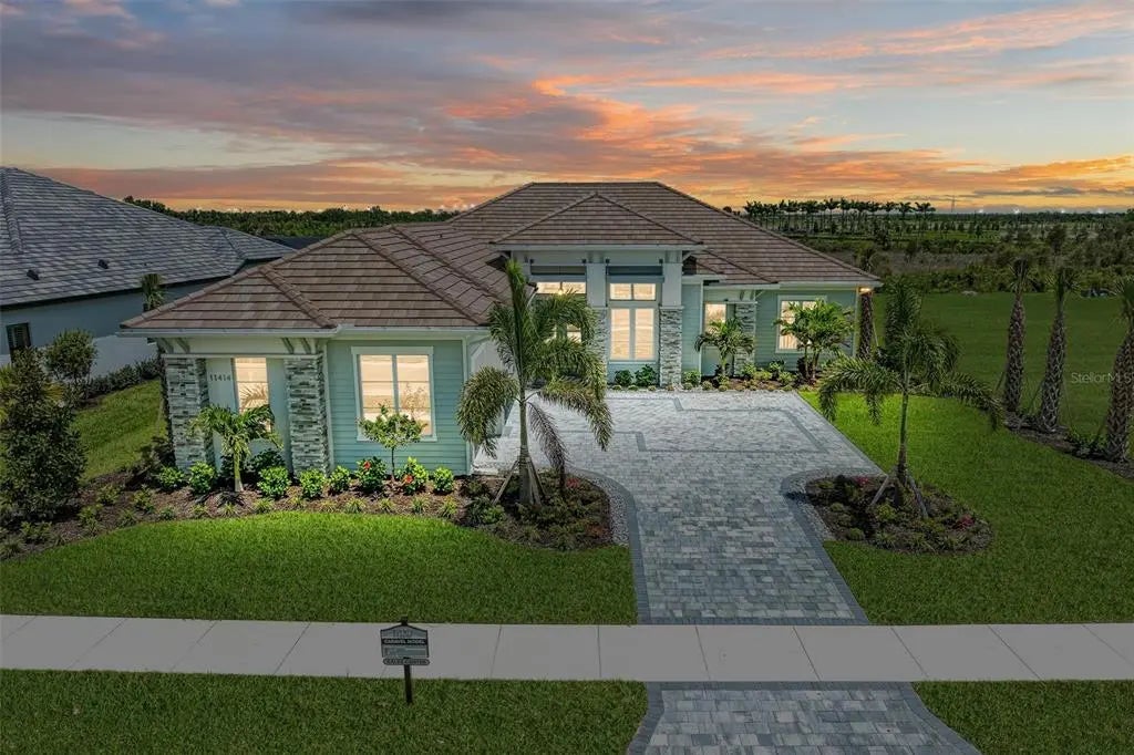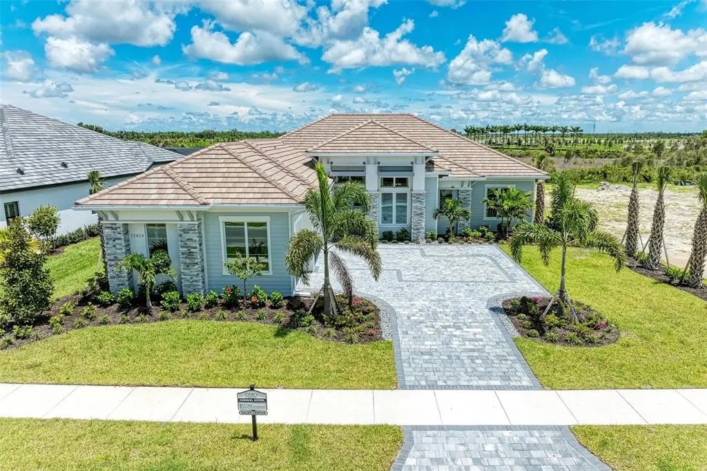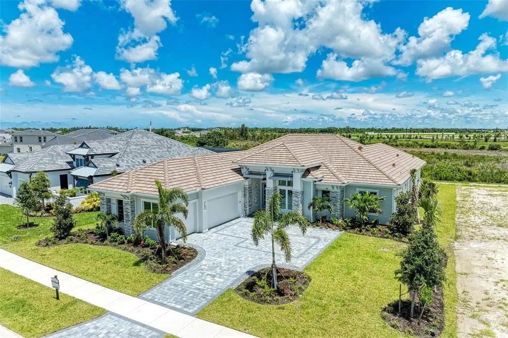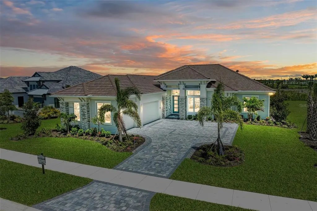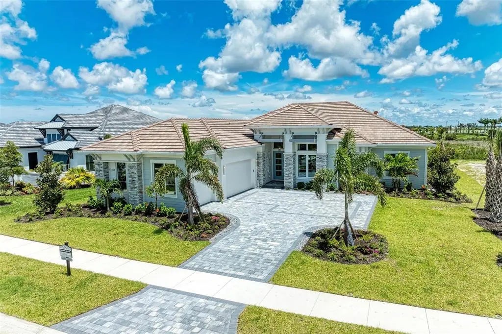 Lee Wetherington Homes gorgeous Caravel Model Home in Everly at Wellen Park is now available - fully furnished - for purchase with leaseback. This stunning custom home is styled with an inviting, sophisticated palette of soft blues and greys mixed with blonde wood tones. Luxurious details greet you as you enter through the double door entry: wood flooring with tile inlay, modern architectural elements, cast stone fireplace, and stunning 10ft sliders that pocket for easy access to over 750 s/f of covered outdoor living space. Spacious kitchen island with waterfall-edge quartz countertop, custom range hood, natural gas cook-top, and even a built-in coffee station in the pantry. Primary bedroom suite showcases elegant design details with LED accent lighting, custom built-in closets, and ensuite bathroom complete with marble tile shower and floors, free-standing tub & Venetian plaster ceiling detail. Outdoor living is accentuated with a stunning pool & spa overlooking a natural conservation area. Entertaining is a breeze with a flex-room outfitted as a wine bar that opens seamlessly to the outdoor kitchen/dining area. Everly is just minutes from the glorious Gulf Coast beaches that span from Venice to Boca Grande. Everly residents will enjoy exclusive use of the amenity center that includes a clubhouse for social gatherings, state-of-the-art fitness center, resort style pool with spa & private cabanas, chip & putt golf, four pickleball courts, and a gathering lawn for catching stunning sunsets with friends. Residents enjoy miles of connected walking trails, bike & golf cart paths, and numerous dining and social events hosted in Downtown Wellen Park. HOA fees include highspeed internet service and irrigation. List price includes all furnishings, electronics and artwork and 12 months leaseback.