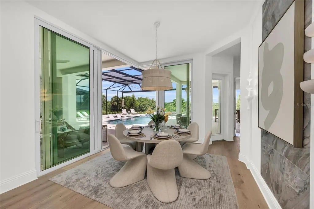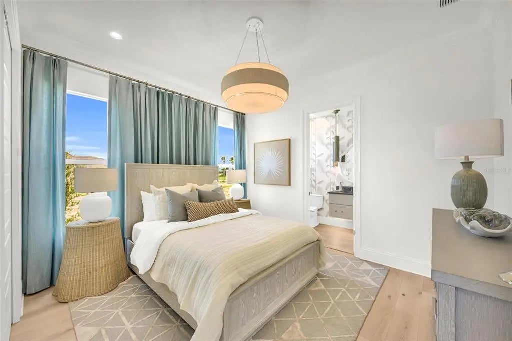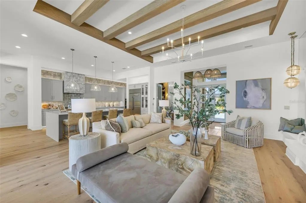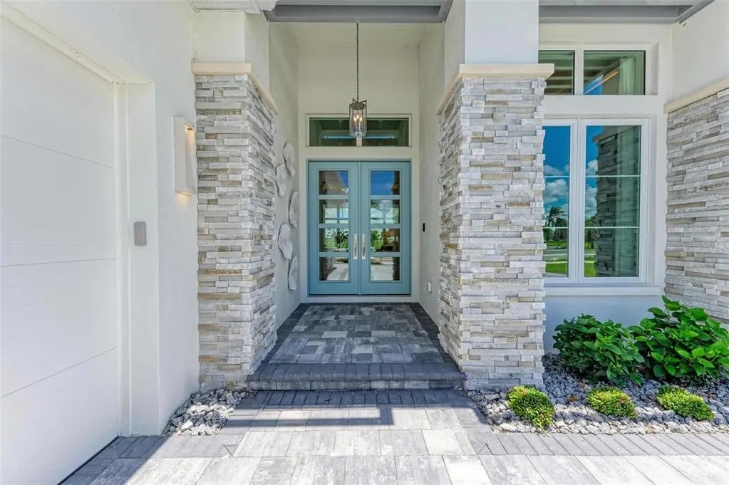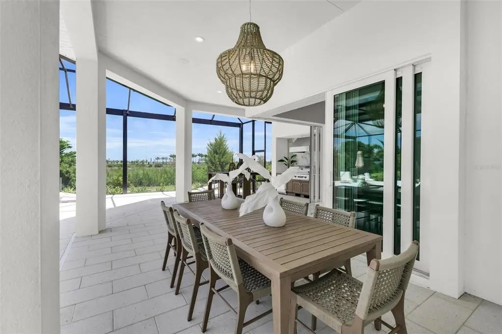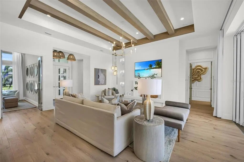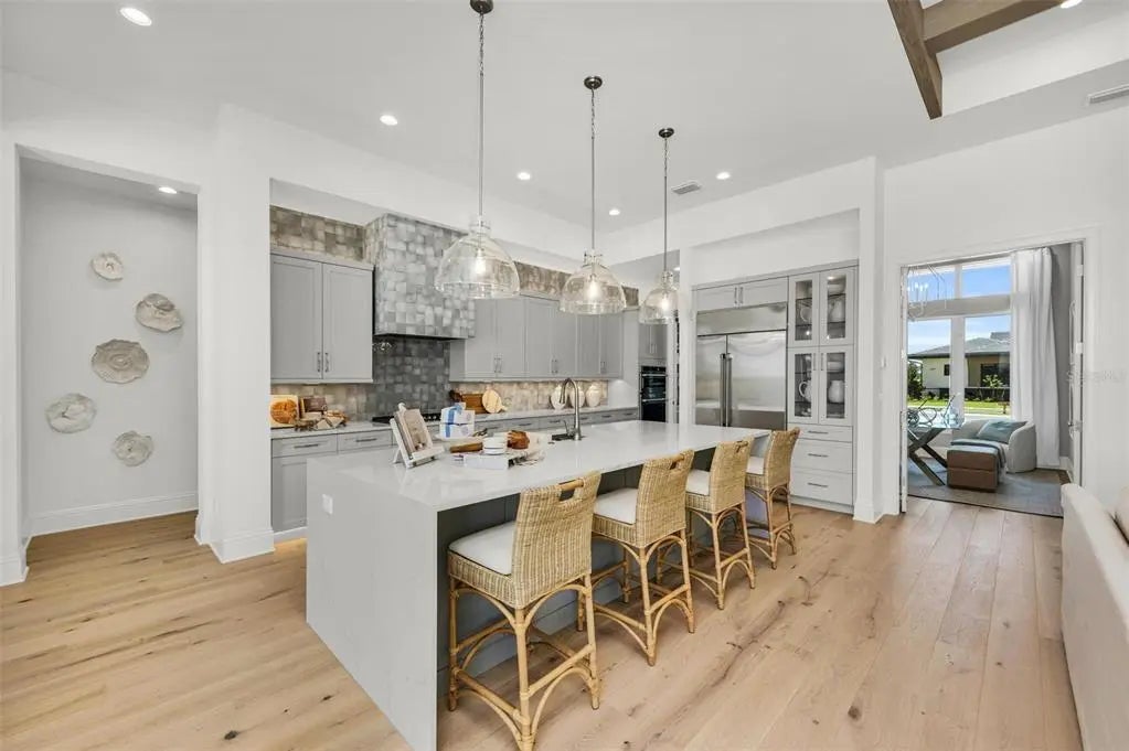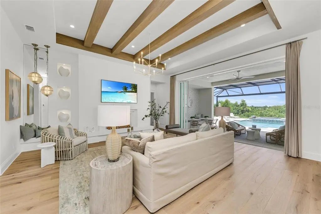 Lee Wetherington Homes gorgeous Caravel Model Home in Everly at Wellen Park is now available - fully furnished - for purchase with leaseback. This stunning custom home is styled with an inviting, sophisticated palette of soft blues and greys mixed with blonde wood tones. Luxurious details greet you as you enter through the double door entry: wood flooring with tile inlay, modern architectural elements, cast stone fireplace, and stunning 10ft sliders that pocket for easy access to over 750 s/f of covered outdoor living space. Spacious kitchen island with waterfall-edge quartz countertop, custom range hood, natural gas cook-top, and even a built-in coffee station in the pantry. Primary bedroom suite showcases elegant design details with LED accent lighting, custom built-in closets, and ensuite bathroom complete with marble tile shower and floors, free-standing tub & Venetian plaster ceiling detail. Outdoor living is accentuated with a stunning pool & spa overlooking a natural conservation area. Entertaining is a breeze with a flex-room outfitted as a wine bar that opens seamlessly to the outdoor kitchen/dining area. Everly is just minutes from the glorious Gulf Coast beaches that span from Venice to Boca Grande. Everly residents will enjoy exclusive use of the amenity center that includes a clubhouse for social gatherings, state-of-the-art fitness center, resort style pool with spa & private cabanas, chip & putt golf, four pickleball courts, and a gathering lawn for catching stunning sunsets with friends. Residents enjoy miles of connected walking trails, bike & golf cart paths, and numerous dining and social events hosted in Downtown Wellen Park. HOA fees include highspeed internet service and irrigation. List price includes all furnishings, electronics and artwork and 12 months leaseback.