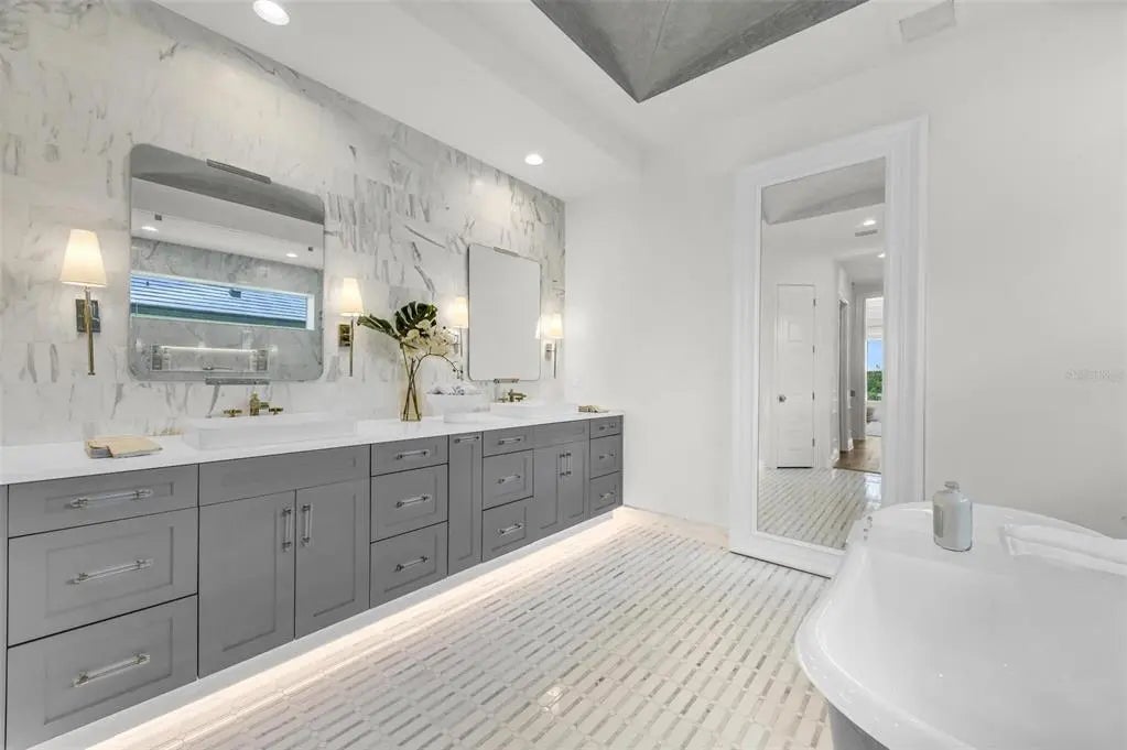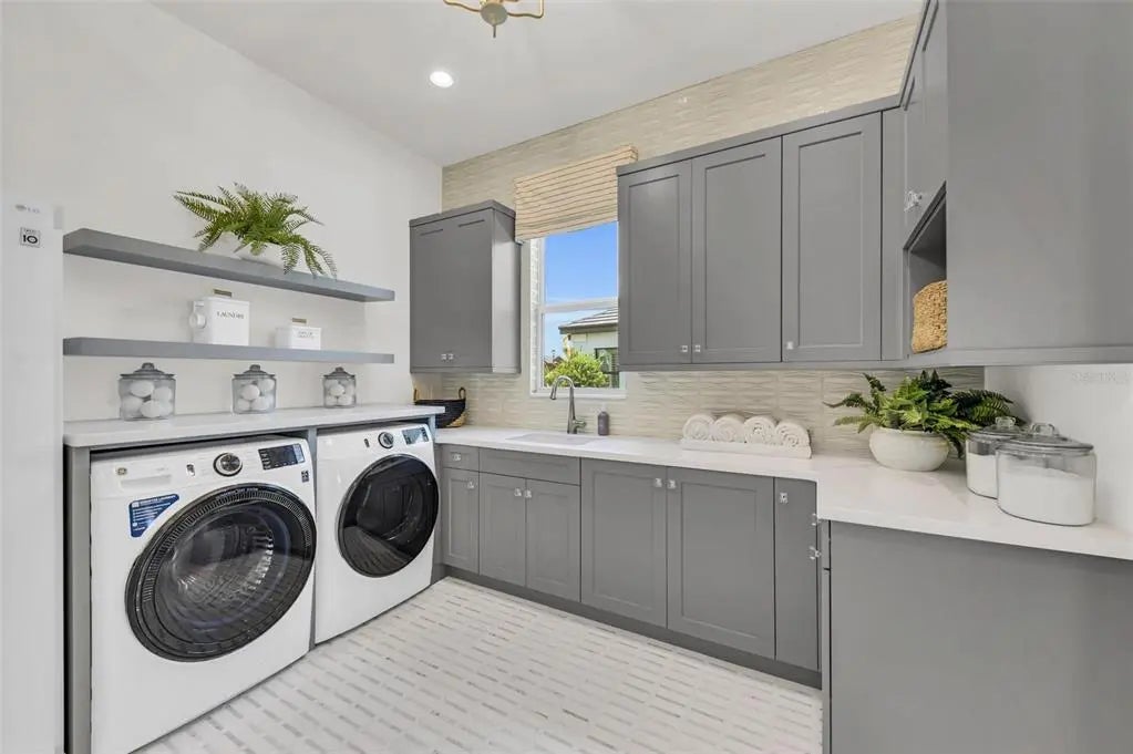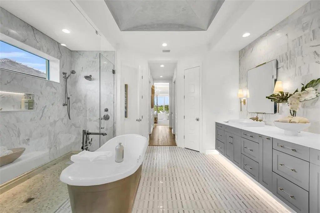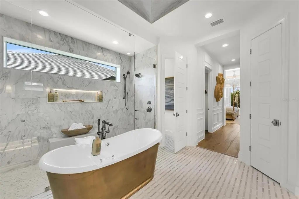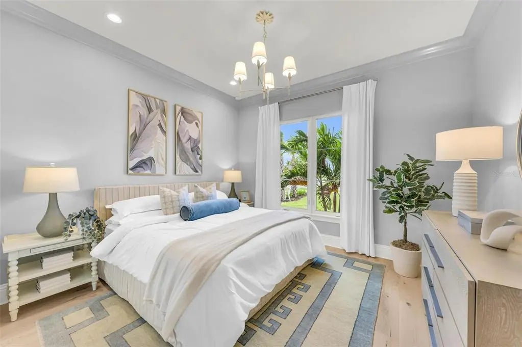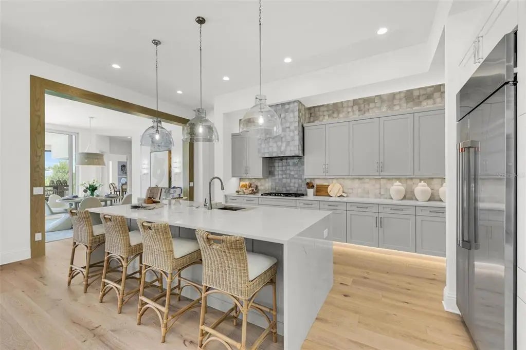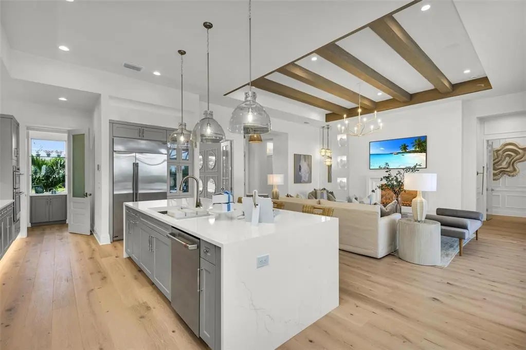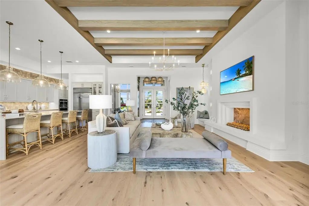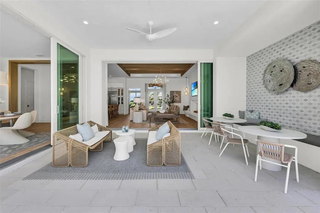 Lee Wetherington Homes gorgeous Caravel Model Home in Everly at Wellen Park is now available - fully furnished - for purchase with leaseback. This stunning custom home is styled with an inviting, sophisticated palette of soft blues and greys mixed with blonde wood tones. Luxurious details greet you as you enter through the double door entry: wood flooring with tile inlay, modern architectural elements, cast stone fireplace, and stunning 10ft sliders that pocket for easy access to over 750 s/f of covered outdoor living space. Spacious kitchen island with waterfall-edge quartz countertop, custom range hood, natural gas cook-top, and even a built-in coffee station in the pantry. Primary bedroom suite showcases elegant design details with LED accent lighting, custom built-in closets, and ensuite bathroom complete with marble tile shower and floors, free-standing tub & Venetian plaster ceiling detail. Outdoor living is accentuated with a stunning pool & spa overlooking a natural conservation area. Entertaining is a breeze with a flex-room outfitted as a wine bar that opens seamlessly to the outdoor kitchen/dining area. Everly is just minutes from the glorious Gulf Coast beaches that span from Venice to Boca Grande. Everly residents will enjoy exclusive use of the amenity center that includes a clubhouse for social gatherings, state-of-the-art fitness center, resort style pool with spa & private cabanas, chip & putt golf, four pickleball courts, and a gathering lawn for catching stunning sunsets with friends. Residents enjoy miles of connected walking trails, bike & golf cart paths, and numerous dining and social events hosted in Downtown Wellen Park. HOA fees include highspeed internet service and irrigation. List price includes all furnishings, electronics and artwork and 12 months leaseback.