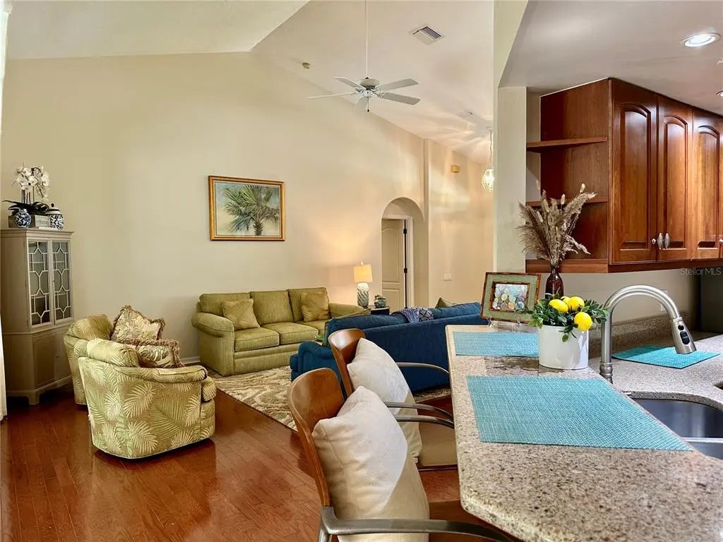 - Interior FeaturesBuilt-in Features, Ceiling Fan(s), Eating Space In Kitchen, High Ceilings, Living Room/Dining Room Combo, Open Floorplan, Primary Bedroom Main Floor, Solid Surface Counters, Stone Counters, Vaulted Ceiling(s), Walk-In Closet(s)