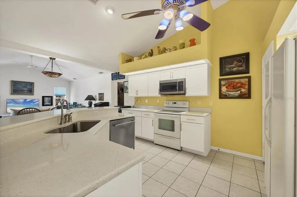 - Interior FeaturesCathedral Ceiling(s), Ceiling Fan(s), High Ceilings, Kitchen/Family Room Combo, Living Room/Dining Room Combo, Open Floorplan, Primary Bedroom Main Floor, Solid Wood Cabinets, Stone Counters, Thermostat, Tray Ceiling(s), Vaulted Ceiling(s), Walk-In Closet(s)
