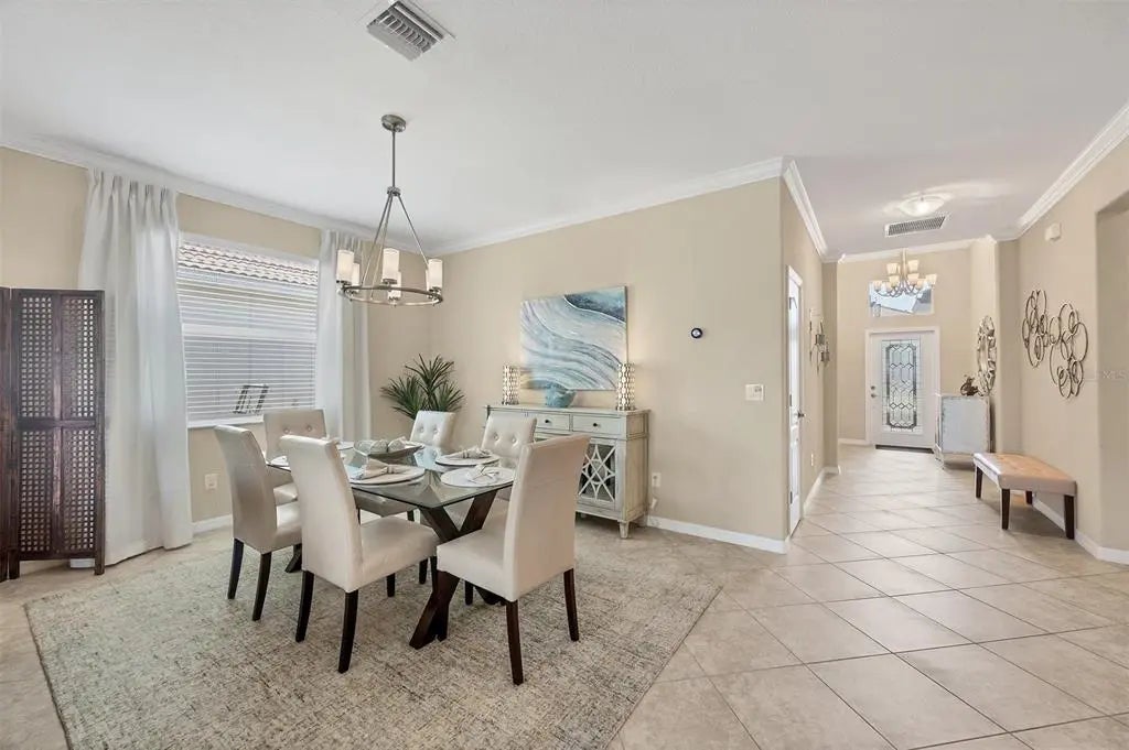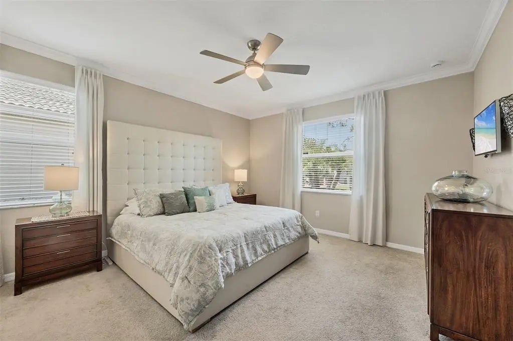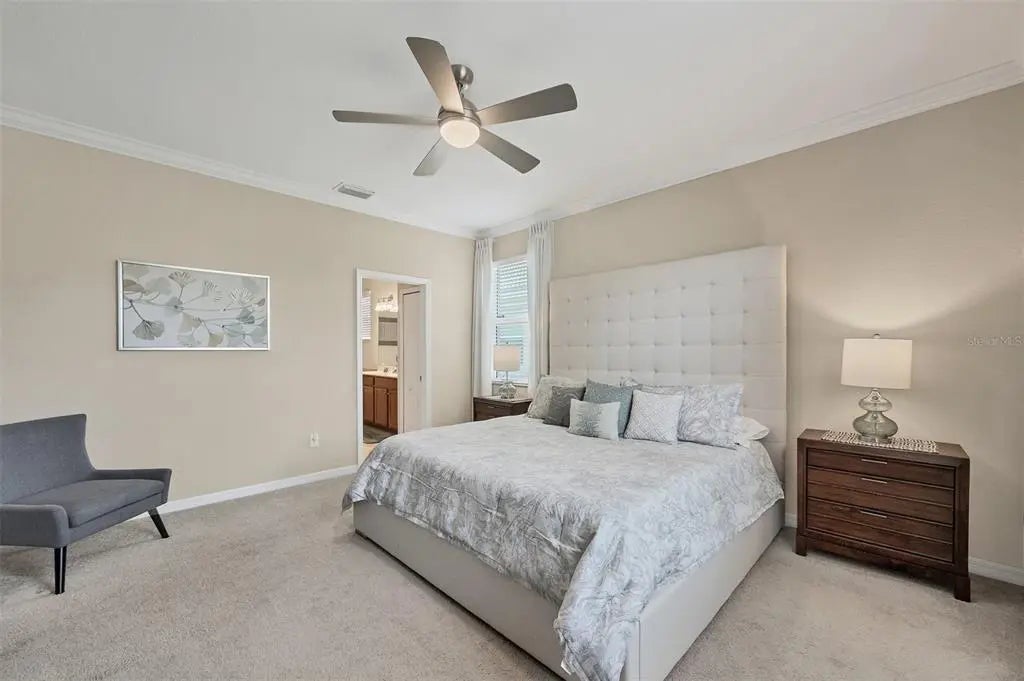 - Interior FeaturesCeiling Fan(s), Crown Molding, High Ceilings, Living Room/Dining Room Combo, Primary Bedroom Main Floor, Solid Wood Cabinets, Split Bedroom, Stone Counters, Thermostat, Walk-In Closet(s), Window Treatments