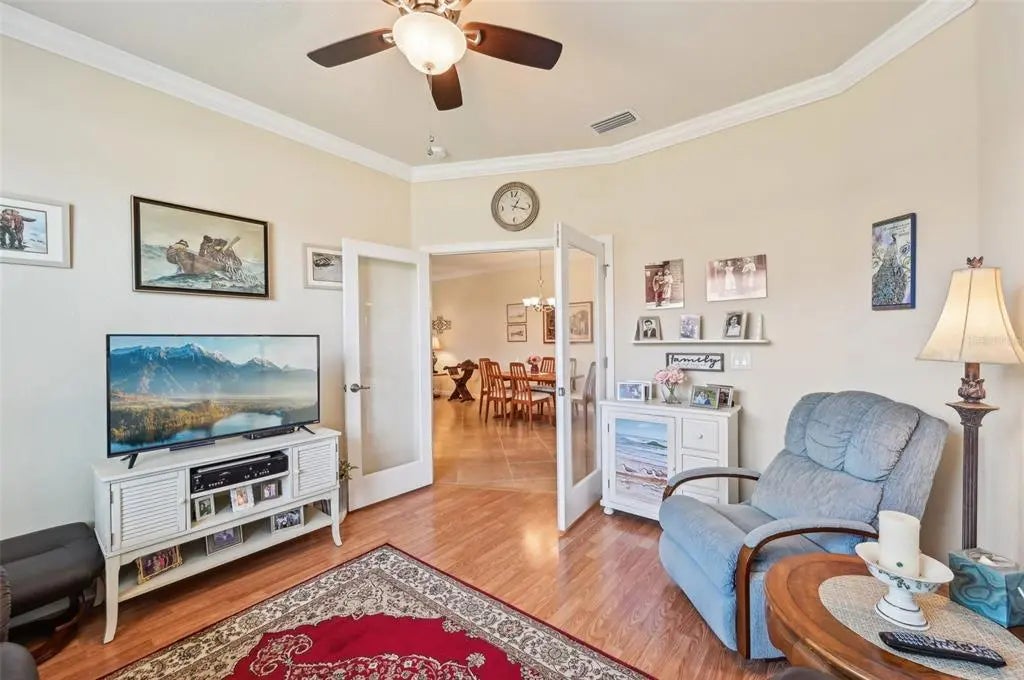 - Interior FeaturesCeiling Fan(s), Crown Molding, High Ceilings, In Wall Pest System, Kitchen/Family Room Combo, Living Room/Dining Room Combo, Open Floorplan, Solid Wood Cabinets, Split Bedroom, Stone Counters, Thermostat, Walk-In Closet(s), Window Treatments
