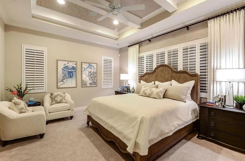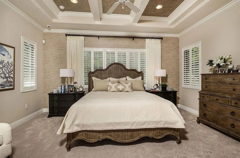 - Interior FeaturesCeiling Fan(s), Coffered Ceiling(s), Open Floorplan, Primary Bedroom Main Floor, Thermostat, Walk-In Closet(s), Window Treatments