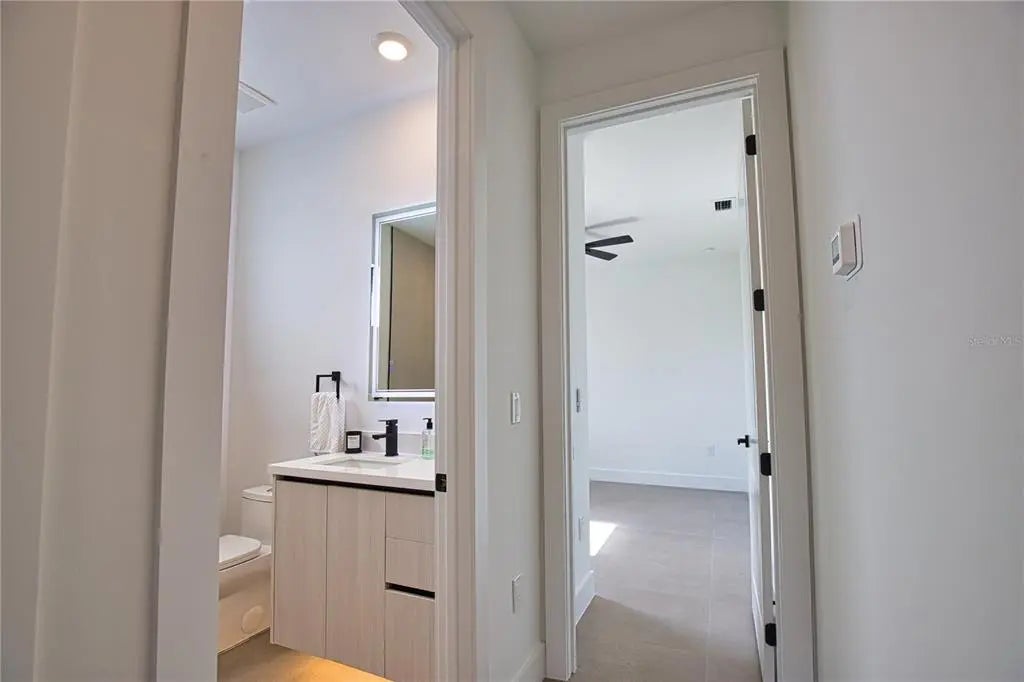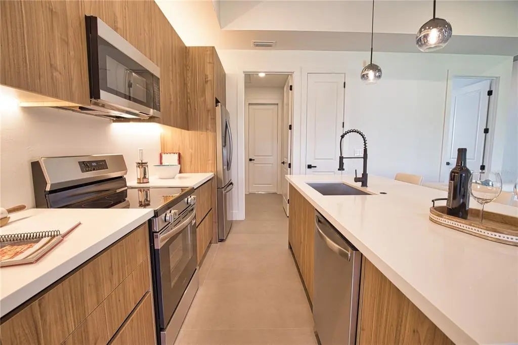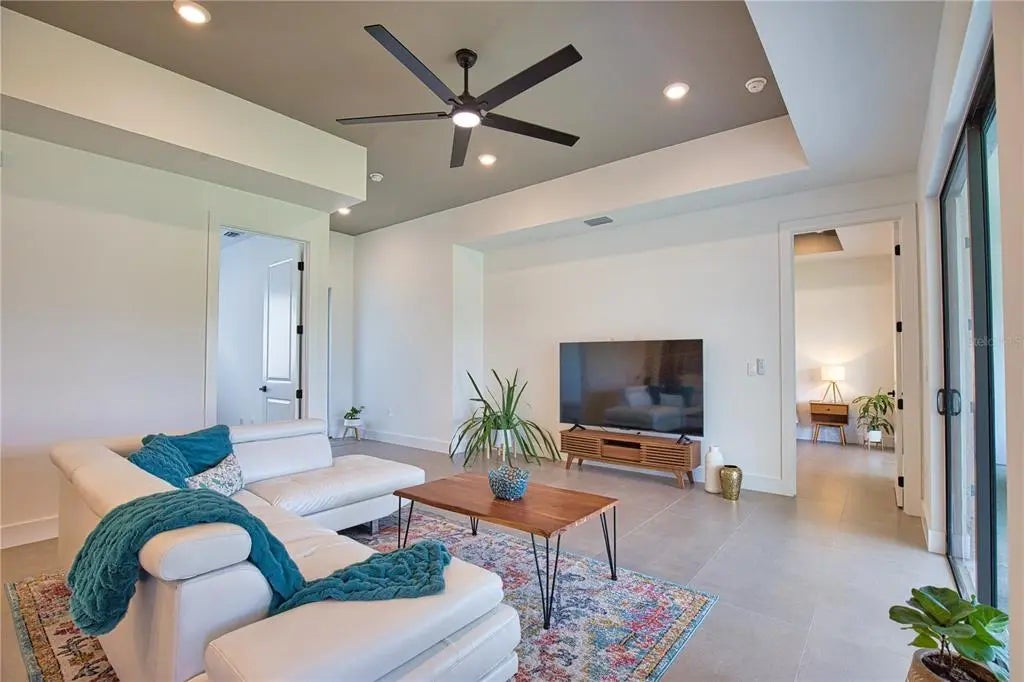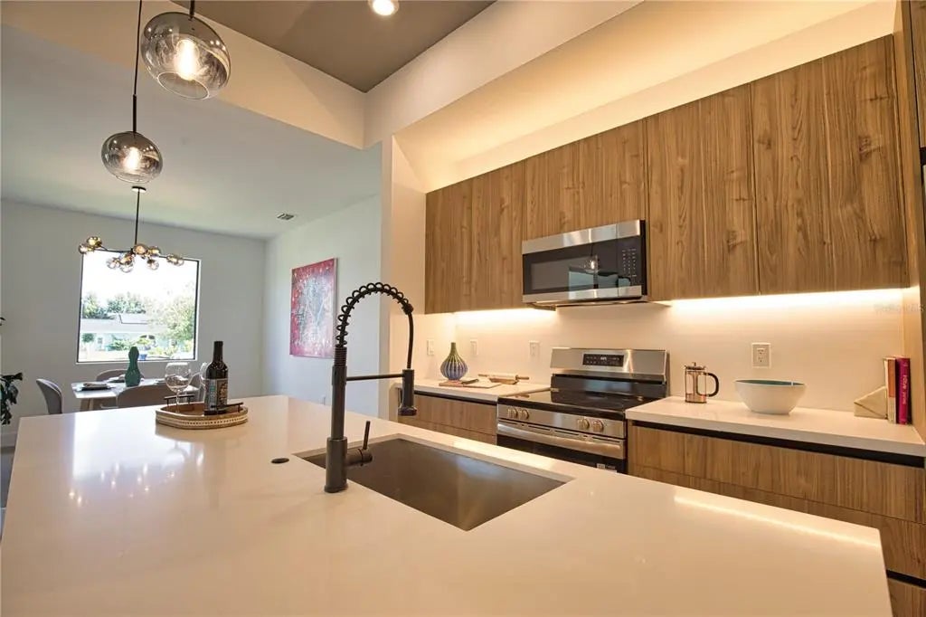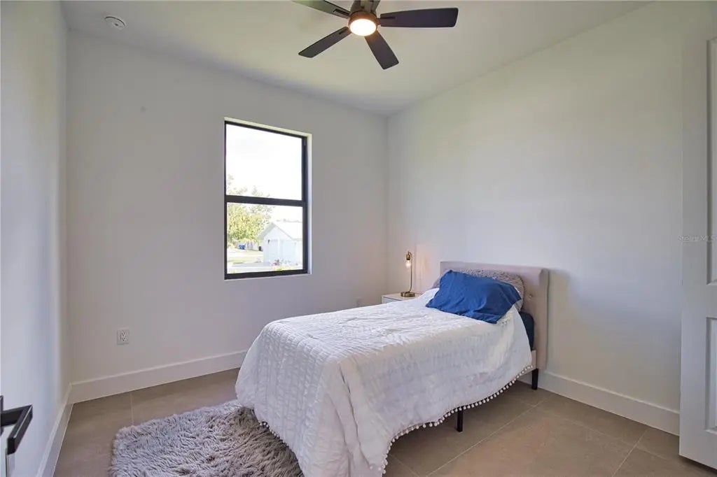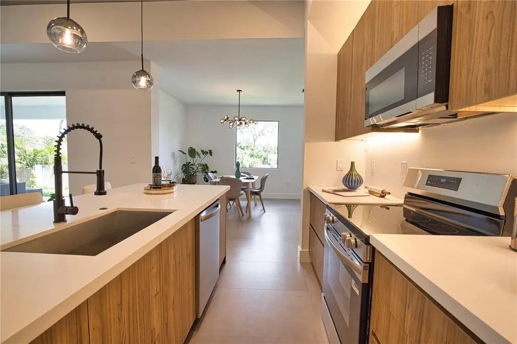 This GREAT VALUE, new-construction 4/2 home provides a modern and peaceful living space in the thriving community of Venice. The NO HOA, NO FLOOD ZONE, 1 YEAR BUILDER'S WARRANTY and LOCATION make this home a real find! As a SOUTH VENICE resident, you can take advantage of the SOUTH VENICE BEACH FERRY, transporting you to your own PRIVATE BEACH on Manasota Key and gain access to the resident BOAT LAUNCH. This serene neighborhood is close to many unique activities such as several nature parks, Legacy Trail, Historic Downtown Venice, Warm Mineral Springs, Venice Fishing Pier and is a 6 minute drive to Manasota Beach, a 15 minute drive Venice beach! The 4th bedroom gives the flexibility of use for an office, gym or craft room to suit your needs. The home's exterior is welcoming and stylish with modern lighting and landscaping along with the peace of mind of hurricane impact windows and a high elevation. The open floor plan allows you to enjoy the main living areas simultaneously. The living room, dining area, and kitchen flow together perfectly, providing the ideal space for entertaining or family gatherings. The high tray ceiling, ceiling fan and large windows flood the main area with natural light and create a cheerful and inviting atmosphere. The neutral color palate allows you to add your personal touches and customize your look. The heart of this home is the sleek, modern kitchen. The quartz countertop and breakfast bar are perfect for casual dining and gathering. Soft close cabinets with gola profile and drawers with a modern, stylish and clean look. Stainless steel appliances, ample cabinet storage space and pantry complete the wish list for a perfect kitchen. The spacious dining area is designed for serving family meals or entertaining and includes a beautiful chandelier that contributes to this home's unique charm. Sliding glass doors provide access to the large covered porch off the main living area creating a seamless transition from indoor to outdoor living space. The master suite is a TRANQUIL RETREAT elevated by gorgeous tray ceiling, ceiling fan and sliding door to back yard. The en-suite bathroom feels like a PRIVATE SPA with a gorgeous OVERSIZED SHOWER, rain shower head, upgraded LED mirrors and soft LED lighting under the vanity to provide you a peaceful haven. 3 additional bedrooms with ample closet space and ceiling fans share a well-designed bathroom with a tub and the same upgraded rain shower head, LED mirrors and LED lighting. Laundry will be less of a chore in this spacious and neat laundry room featuring a convenient utility sink with cabinet. The 2 car garage conveniently leads to the laundry room for the perfect transition upon your arrival home. This property is staged and easy to show! It's features, proximity to beaches, S Venice resident perks and unique outdoor/shopping activities make this house the ideal place to call home.