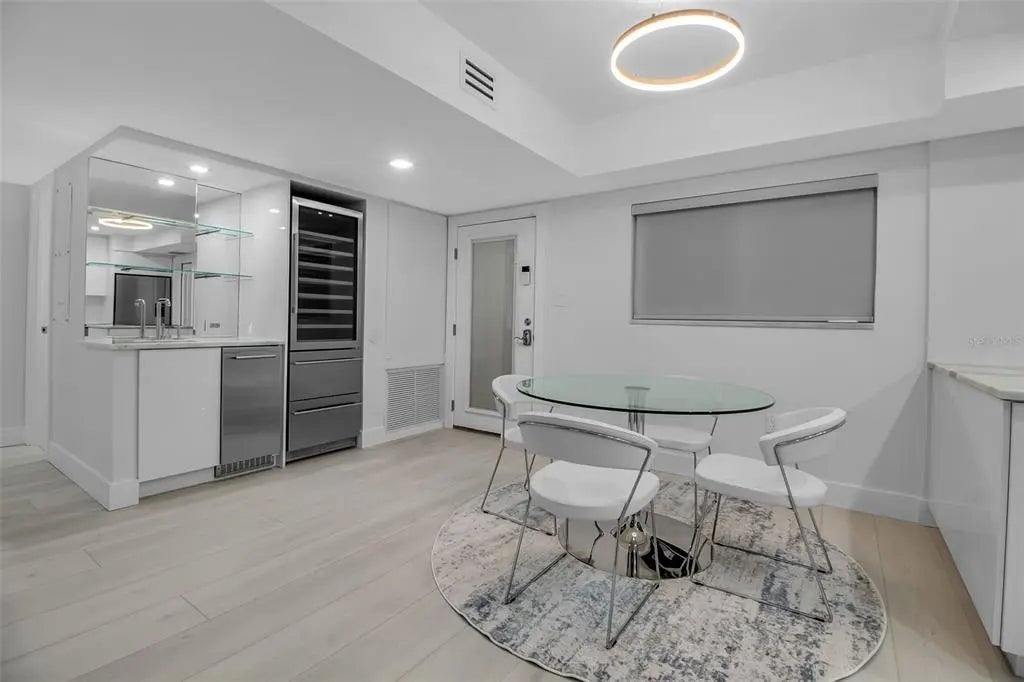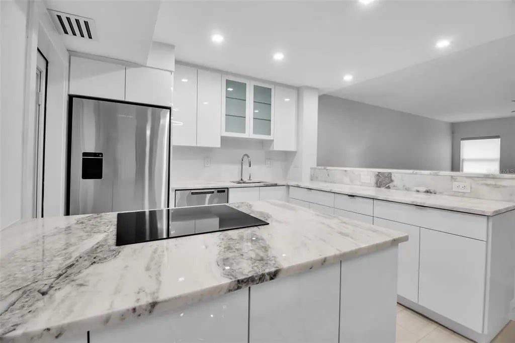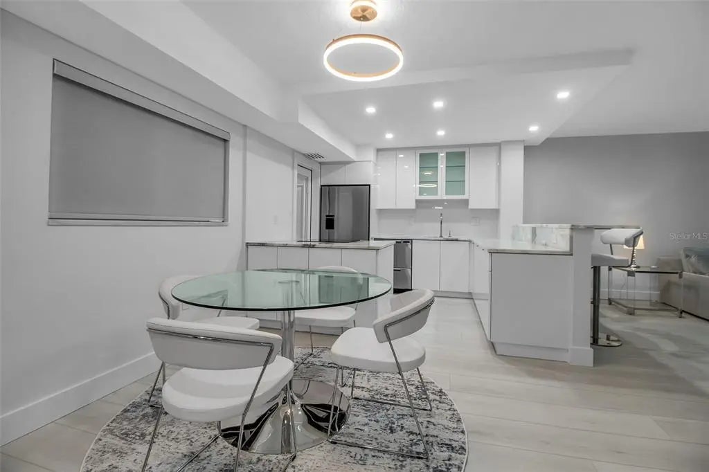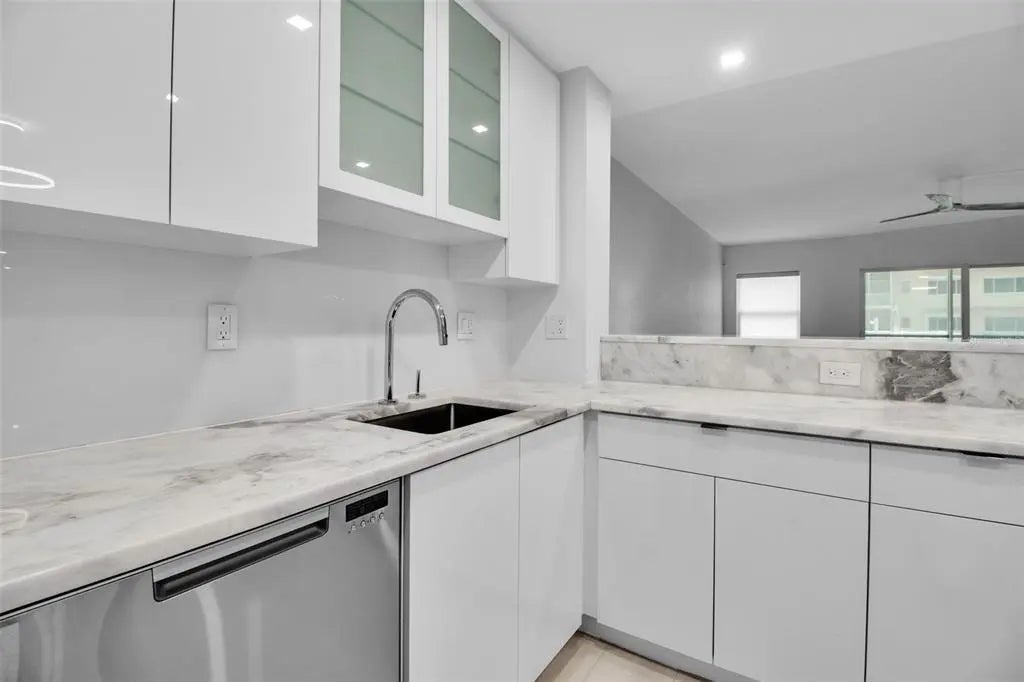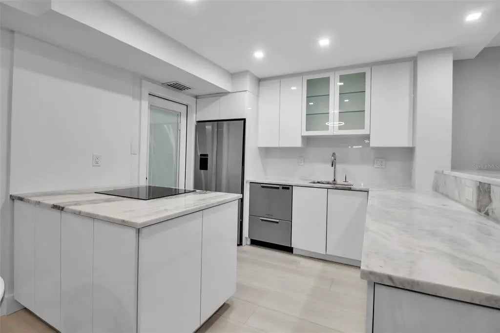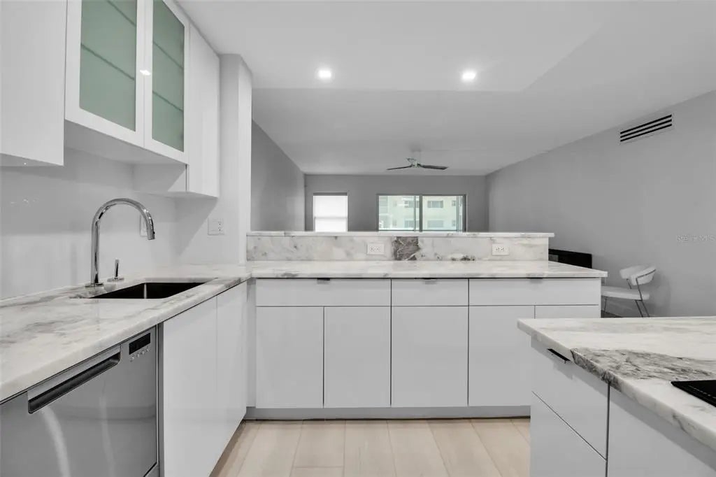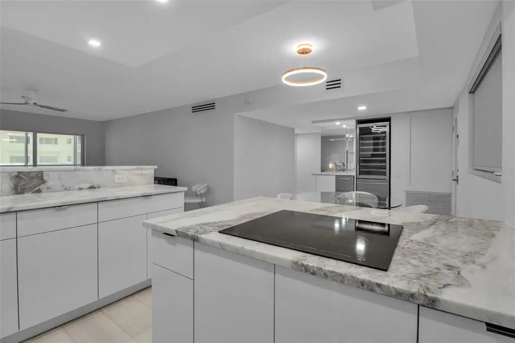 Experience beachfront living at its finest in this beautifully renovated first-floor condo at The Towers on Venice Beach. Blending modern luxury, convenience, and direct Gulf-front access, this coastal retreat offers 1,205 sqft of living space with partial furnishings included. One of the few pet-friendly complexes on Venice Beach, The Towers allows up to two dogs or cats. Fully remodeled in 2022 and enhanced in 2025, the home features an open, island-inspired design with Nuvelle Grandeur vinyl plank flooring and an airy, open-concept kitchen with Euro-style soft-close cabinetry, white glass backsplash, granite countertops, and Fisher & Paykel appliances. The bar area includes a wine cooler, ice maker, and bar sink. Both bathrooms exude spa-like comfort with Coralina Perla tile, wall-mounted vanities, glass showers, and designer Kohler Kallista fixtures. Impact-rated windows and doors, remote-controlled fans and shades, and Jeld-Wen solid-core doors add to the home’s quality and comfort. Enjoy direct access to the beach, pool, and community room, plus one reserved parking space and ample guest parking. Just minutes from historic downtown Venice, shopping, and dining. All condo dues and assessments are paid through December 2025.