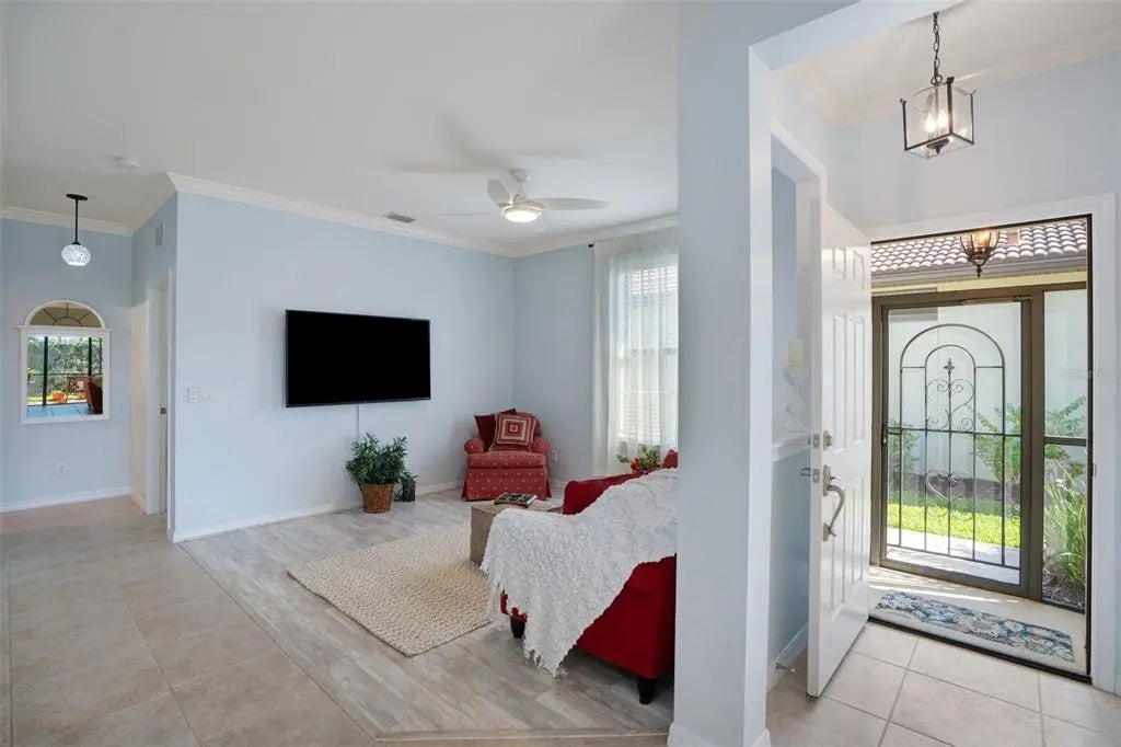 Rarely Available Michelangelo Model in Venetian Falls – A True Florida Gem. Welcome to the sought-after Michelangelo model by Centex Homes, located in the vibrant 55+ community of Venetian Falls. Designed with the Florida lifestyle in mind, this beautifully updated villa blends comfort, style, and functionality. Inside, you’ll find modern finishes throughout—including designer-selected wall colors, custom light fixtures and ceiling fans, crown molding, and remote-controlled blinds. The split-bedroom floor plan offers ideal privacy, with spacious bedrooms on opposite ends of the home. The oversized primary suite is large enough to include a cozy sitting or lounging area. What sets this home apart? Two separate family rooms provide flexible living and entertaining space. The large kitchen features an eat-in dining nook and breakfast bar, combining practicality with modern flair. For more social gatherings, an open dining room space adds to the home's entertaining appeal. Step out onto the extended, screened lanai and relax in your personal garden oasis. Surrounded by lush landscaping, flowering plants, and mature oaks, it’s the perfect place to enjoy Florida’s natural beauty—and there's plenty of space to indulge your green thumb. Venetian Falls offers an array of resort-style amenities, including a heated lap pool and spa, resistance walking pool, state-of-the-art fitness center, billiards room, bocce courts, and a full-time activities director. Located just minutes from the Gulf Coast beaches and charming downtown Venice, you'll enjoy the best of coastal living. Experience relaxed, elegant living in one of Venice’s most desirable communities—schedule your showing today!