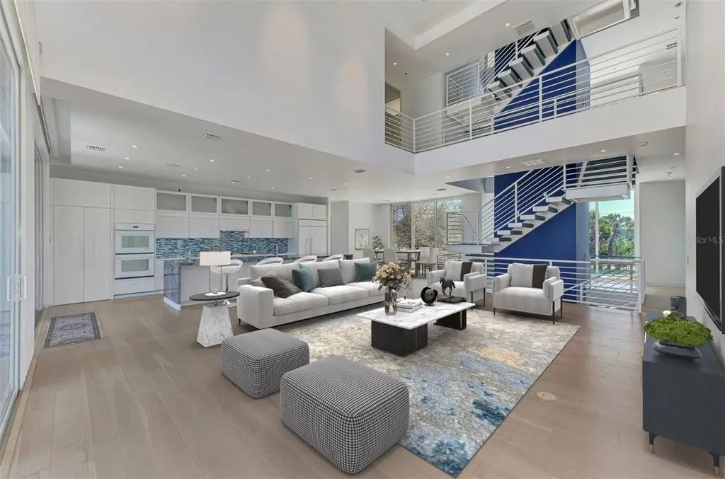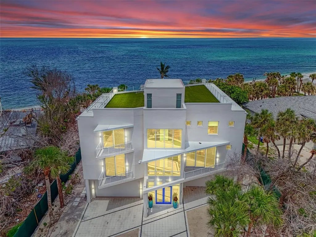 One or more photo(s) has been virtually staged. Experience the pinnacle of modern coastal living at 7410 Manasota Key Road - a striking beachfront retreat designed by award-winning DSDG Architects. Nestled on over half an acre behind a gated entry, this fine residence offers more than 100 feet of private Gulf frontage, with panoramic views of turquoise waters and sand just steps away. This is where elegant design meets relaxed luxury—crafted for those who expect the very best. Every detail of this over 4,500-square-foot residence reflects thoughtful planning and refined craftsmanship. Four spacious bedrooms, each with its own private en-suite bath and walk-in closet, provide ultimate privacy and comfort for residents and guests alike. Engineered wood and bamboo flooring runs throughout the home, setting a warm, modern tone. The chef’s kitchen has top-line appliances, including two dishwashers, gas cooking, a spacious walk-in pantry and a striking Blue Bahia granite waterfall island making this a true showpiece for entertaining and everyday living. Smart home features with a Crestron system provide effortless control and convenience. An elevator from the garage level offers access to every floor, including the spectacular roof top deck, while laundry rooms on both levels add to practicality. The heart of the home is a light-filled, open-concept living space framed by dramatic walls of hurricane resistant glass that showcase unobstructed Gulf views from nearly every angle. The primary suite is a private sanctuary, offering everything you would expect in a fine home: a luxurious steam shower, whirlpool tub, dual vanities, extensive closet space, and a wet bar—all opening to a private terrace with sweeping views of the Gulf. It's a retreat within a retreat, designed for relaxation and indulgence. Crowning the residence is a breathtaking rooftop terrace with 270-degree+ views of the Gulf of Mexico and Lemon Bay—perfect for sunrise yoga, sunset cocktails, or evening stargazing. A convenient half bath on this level ensures comfort while enjoying the space. Adding to its appeal, the property includes deeded bay access—offering the best of both worlds: tranquil Gulf-front living with the ability to launch kayaks or paddleboards into Lemon Bay. A testament to the design and construction quality, this home stood strong through recent storms—with no damage to its elevated living spaces—the landscaping reflects the natural impact of the unprecedented coastal weather. The grounds are a blank canvas, ready for the next owner to reimagine and restore with their own vision of tropical beauty. With the structure and interiors entirely intact, and the home’s systems fully operational, this is a rare opportunity to own a resilient beachfront residence that has weathered the elements and awaits your personal touch to complete its coastal perfection. Located on unspoiled and relaxing Manasota Key, this exceptional home is just minutes from waterfront dining, boutique shopping, and endless opportunities for boating, kayaking, and exploring the beauty of Lemon Bay. Whether you’re seeking a luxurious full-time residence or an exquisite vacation escape, 7410 Manasota Key Road invites you to experience beachfront living at its most refined.