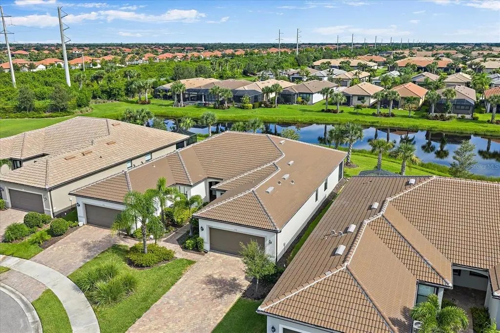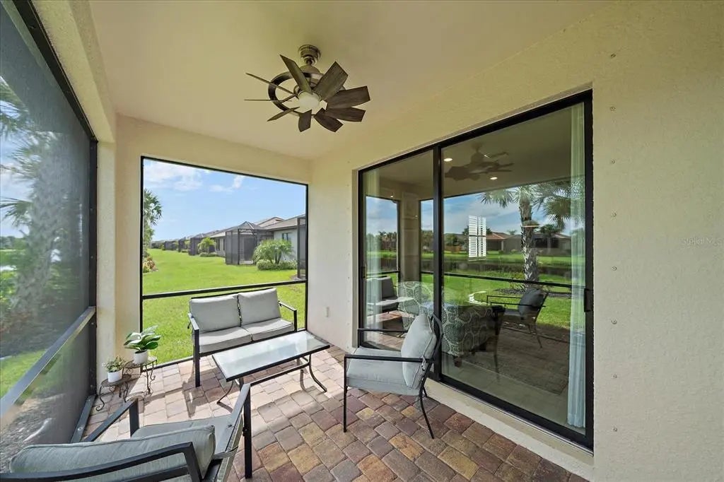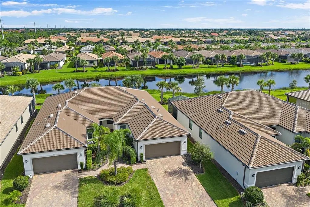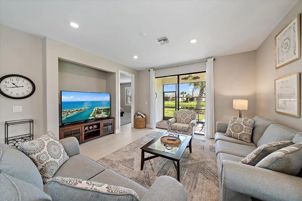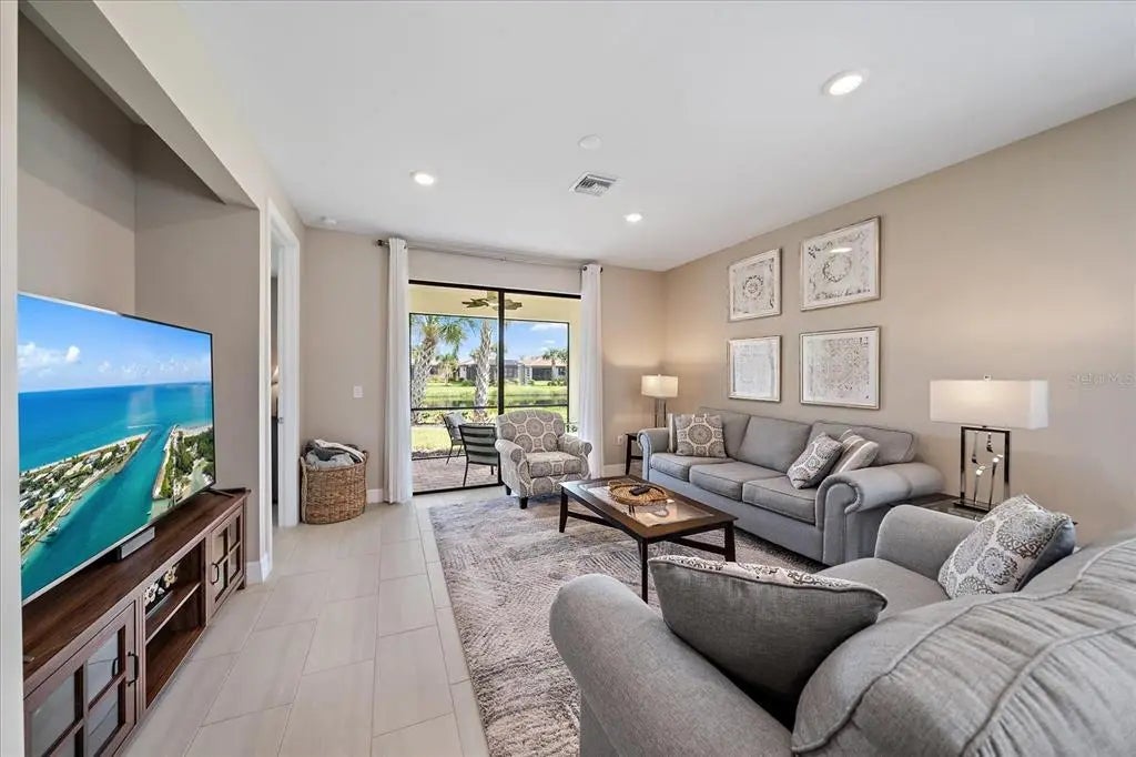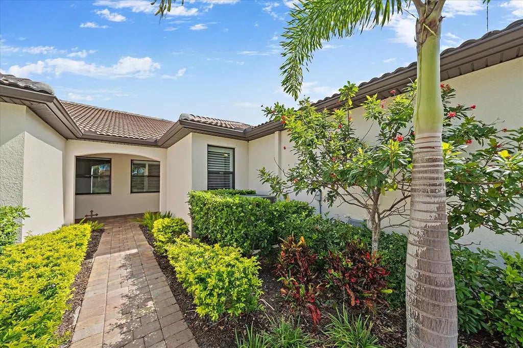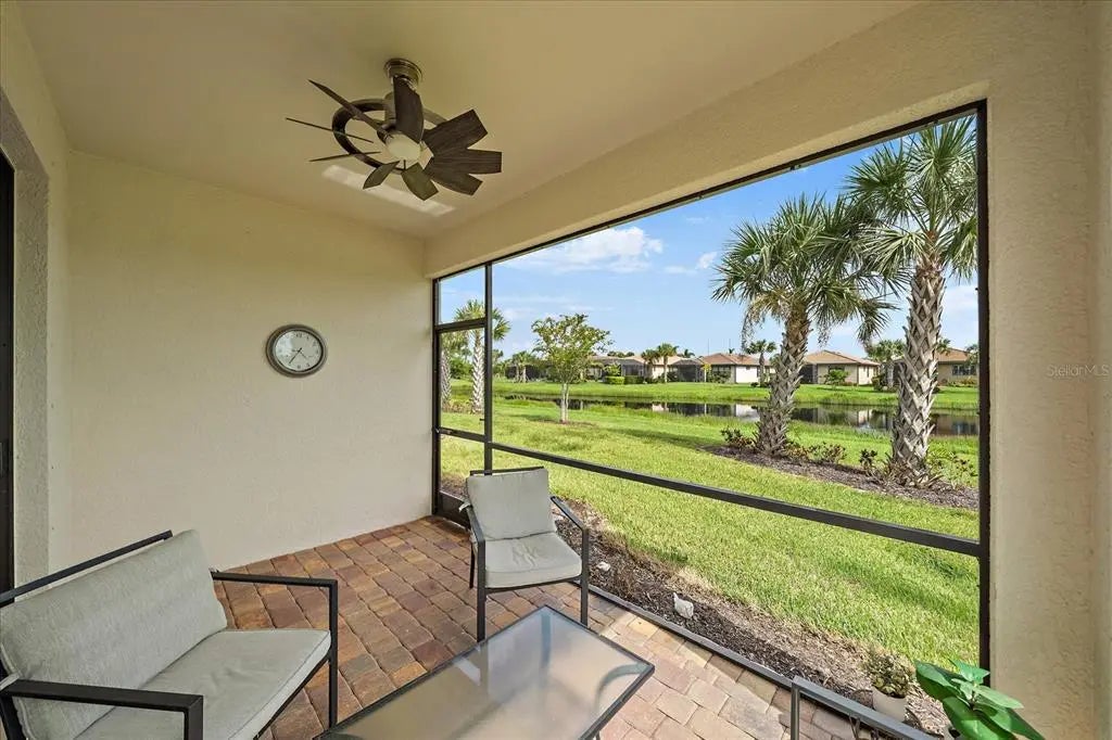 Welcome to this beautifully designed villa home offering 2 bedrooms, 2 bathrooms, and a versatile den. With 10-foot ceilings and 8-foot doors throughout, the interior feels open and inviting. Plantation shutters accent the hurricane-impact windows, adding both style and functionality, while additional hurricane shutters provide peace of mind. A 2021 roof, HVAC & water heater and 2021 appliances ensure lasting value and reliability. Offered fully furnished, this residence is move-in ready for its next owner. From the screened-in lanai, enjoy unobstructed views of the water with the option to extend the lanai for even more outdoor living space. The home is ideally situated on a quiet cul-de-sac and features an oversized, extended paver driveway along with an epoxied garage floor. As part of a maintenance-free community, exterior upkeep is handled for you, allowing more time to enjoy the IslandWalk lifestyle. IslandWalk is a gated, resort-style community that offers an extensive array of amenities designed for both relaxation and recreation. Residents enjoy access to two resort pools and spas, a dedicated lap pool, and a clubhouse with multipurpose rooms, a lanai, pavilion, and catering kitchen for social gatherings. The fitness centers and movement rooms support an active lifestyle, while the library, game room with billiards and ping-pong, and arts and crafts studio provide space for creativity and leisure. Outdoor amenities include Har-Tru tennis courts, 12 pickleball courts, bocce courts, basketball, a playground, fire pits, grills, a community garden, and a dog park with separate sections for large and small pets. Scenic walking trails, a boardwalk, and lush landscaped areas create a serene backdrop for daily living.All of this is just minutes from Wellen Park’s shopping, dining, and entertainment, area beaches, and the Atlanta Braves’ spring training stadium. This villa blends modern comfort, water views, and a vibrant, amenity-rich lifestyle in one of Venice’s most sought-after communities.