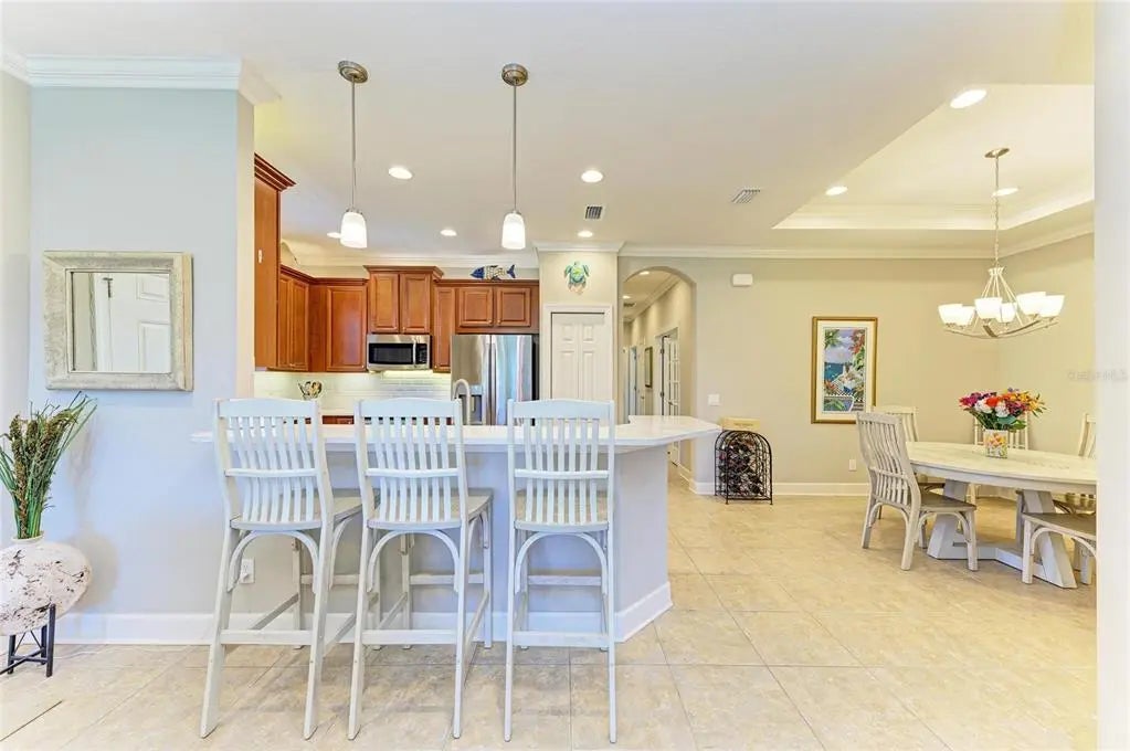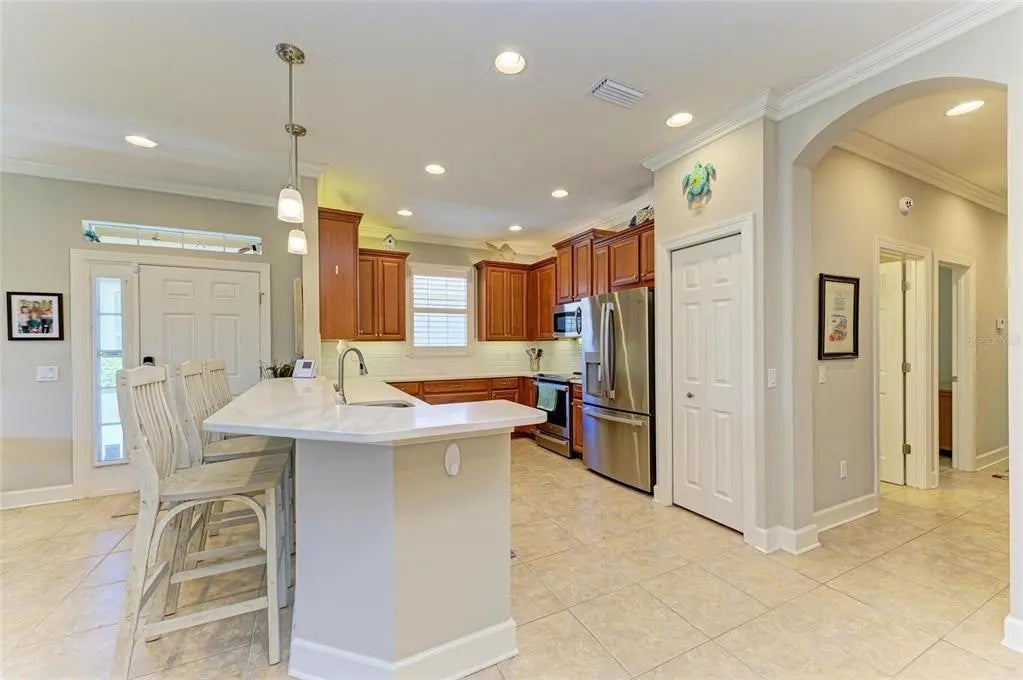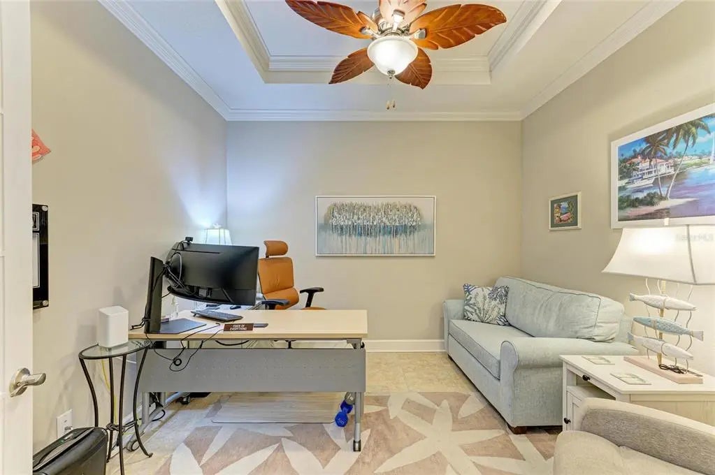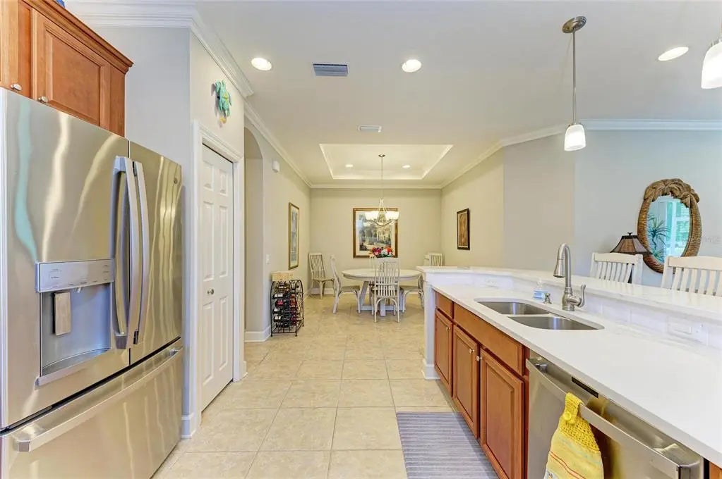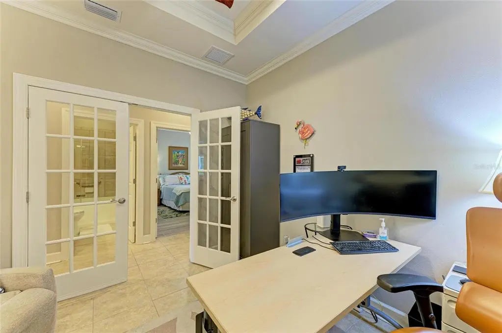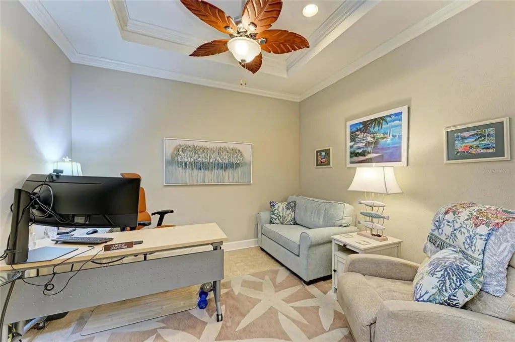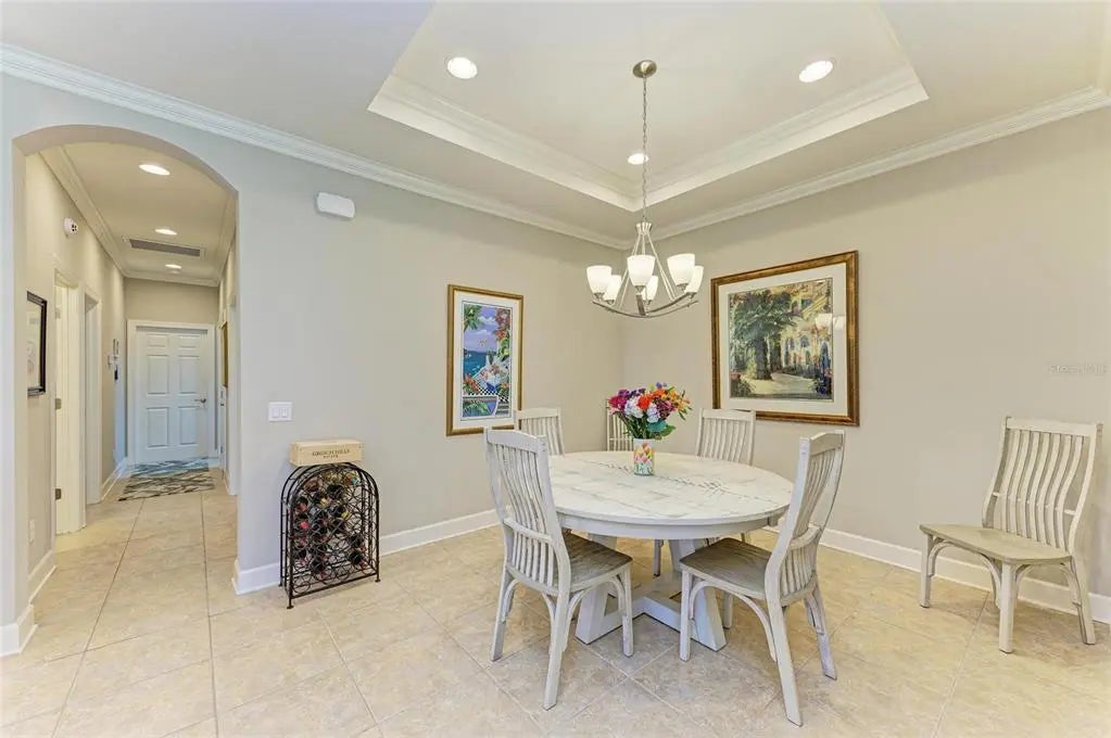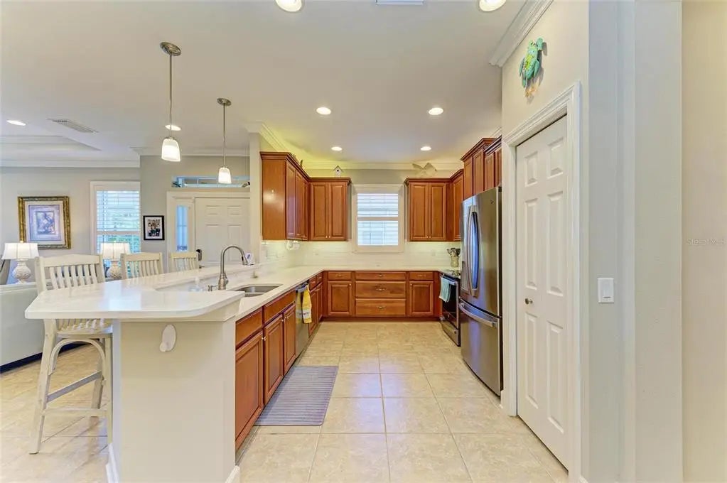 Under contract-accepting backup offers. WOW – PRICED TO SELL! The PERFECT, immaculate Florida maintenance-free villa...NOT in a flood zone, with NO CDD fees, and only a short drive to Venice Beach, has just hit the market! This must-see 2-bedroom, 2-bathroom, 2-car garage plus den/office villa is located in the highly desirable gated community of Verona Reserve in Venice, Florida, and is truly move-in ready. With over $80,000 in designer upgrades already completed, it’s ideal as a seasonal retreat or a year-round residence. Step inside to a bright, open-concept floor plan with split bedrooms for privacy, elegant tray ceilings, crown molding in every room, and beautiful tile flooring throughout. Natural light pours into the main living area through a huge triple-slider and multiple windows. The chef-inspired kitchen is a showstopper with 42-inch crowned cabinetry, modern stainless-steel appliances, under- and over-cabinet lighting, upgraded quartz countertops, a designer tile backsplash, and an extra-long breakfast bar perfect for entertaining. A large pantry with custom pull-out drawers offers exceptional storage, and the dining room just off the kitchen makes hosting effortless. The spacious owner’s suite is a serene retreat with a large walk-in custom closet, triple windows overlooking lush landscaping and a tranquil pond, and a spa-like ensuite bath featuring a beautifully tiled walk-in shower with built-in bench and frameless glass door, a dual-sink vanity with generous storage, and a private water closet. The den/office offers flexibility for remote work or hobbies, with French doors and sound-deadening wall insulation. The guest bedroom includes a walk-in closet and an ensuite bath with a tub/shower combo, also accessible from the hall. The indoor laundry room features wood cabinetry, a laundry sink, and a newer washer and dryer. Step outside to the extended screened lanai with new nonslip porcelain tile, power sunshades, and an overhead heater for cooler evenings. Overlooking the pond, this is the perfect spot for morning coffee or sunset cocktails while enjoying peaceful privacy. This meticulously maintained home also includes upgraded easy-close hurricane shutters, a newer dishwasher, garbage disposal, hot water heater, A/C, washer and dryer, whole-house water softener and filter, epoxy-coated garage floor, new garage opener, extra storage, plantation shutters, and whole-house gutters. Verona Reserve is a peaceful, pet-friendly gated community located just minutes from downtown Venice, shopping, dining, entertainment, healthcare, airports, I-75, and US-41. Amenities include a community pool, dog park, social activities, and neighborhood gatherings. Low HOA fees cover lawn care, roof replacement, exterior painting, and master insurance. This villa is located in Flood Zone X, meaning no flood insurance is required. Don’t miss the rare chance to own a pristine, low-maintenance home in one of Venice’s most sought-after communities — just minutes from the Gulf Coast beaches and the charm of Venice’s historic district!
