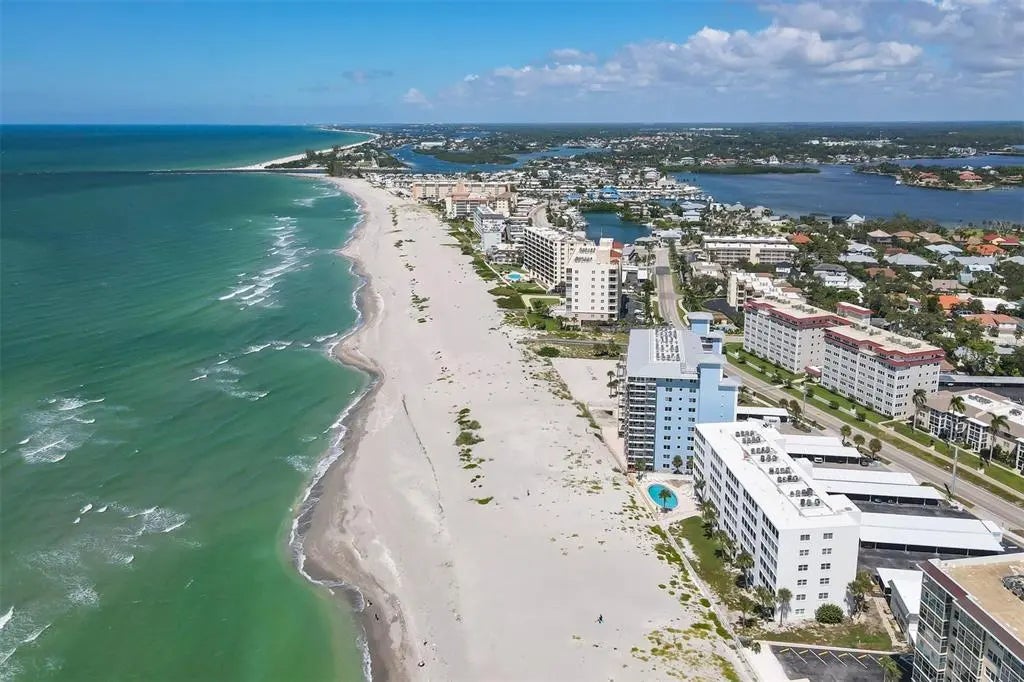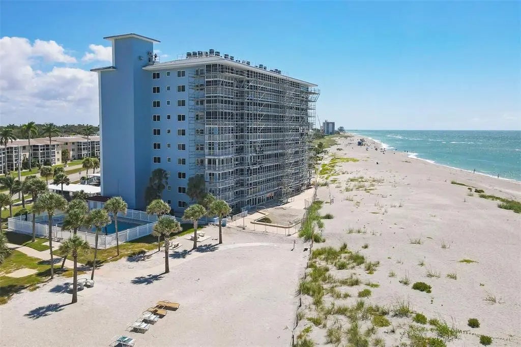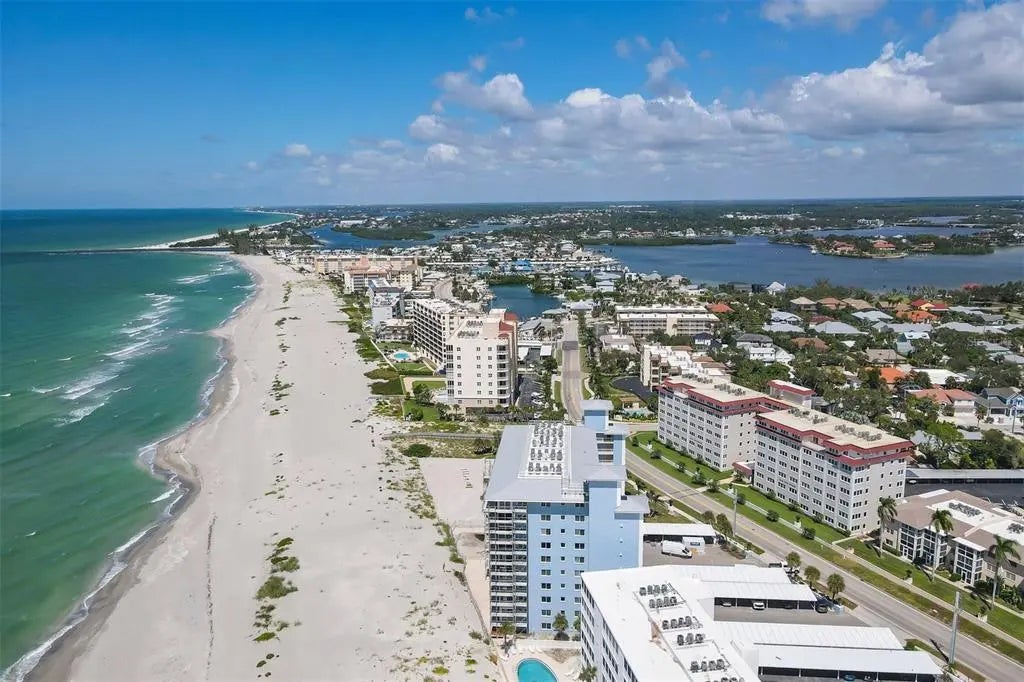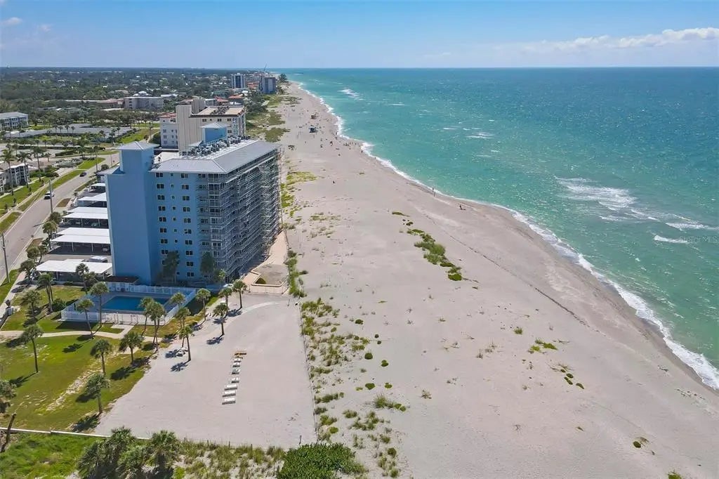 One or more photo(s) has been virtually staged. Live the coastal lifestyle reimagined at Gulf Horizons, a beautifully restored beachfront community on historic Venice Island! This third-floor corner residence at 555 The Esplanade North captures panoramic Gulf of Mexico views and effortless elegance in every detail. Spanning 1,195 square feet, the two-bedroom, two-bath home is infused with light and designed for comfort. Recent interior enhancements include a full suite of Frigidaire kitchen appliances, custom cabinetry, updated countertops and new faucets in both the kitchen and baths. Luxury vinyl plank flooring, new ceiling fans and a York five-ton air-conditioning unit elevate everyday living, while hurricane-impact windows and sliding glass doors provide peace of mind. The building itself has recently completed a full-scale renovation following Hurricane Milton, with modernized systems and refreshed common areas designed to enhance both resilience and visual appeal. Step onto the private balcony and take in uninterrupted sunset vistas or enjoy the direct access to the sandy Gulf shoreline just steps away. Beyond your front door, the boutiques, cafes, restaurants and cultural charm of downtown Venice are just moments away. This is more than a residence. It is a refined retreat where modern luxury meets timeless coastal beauty!