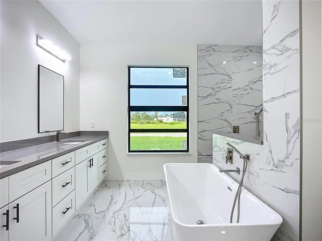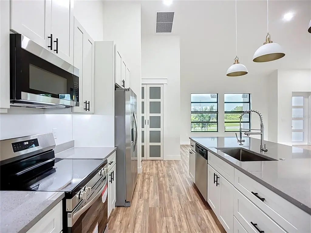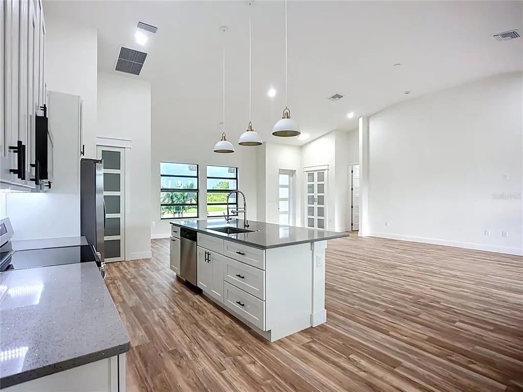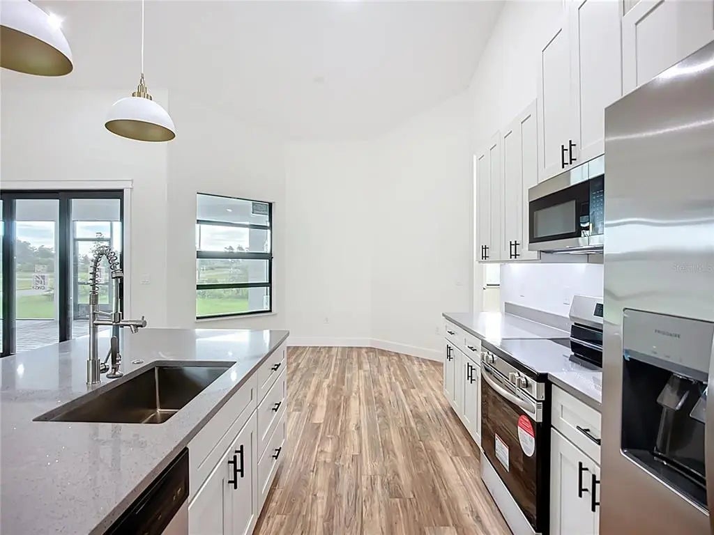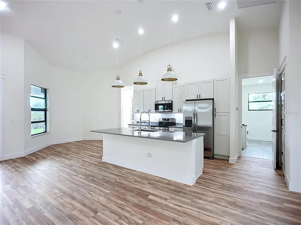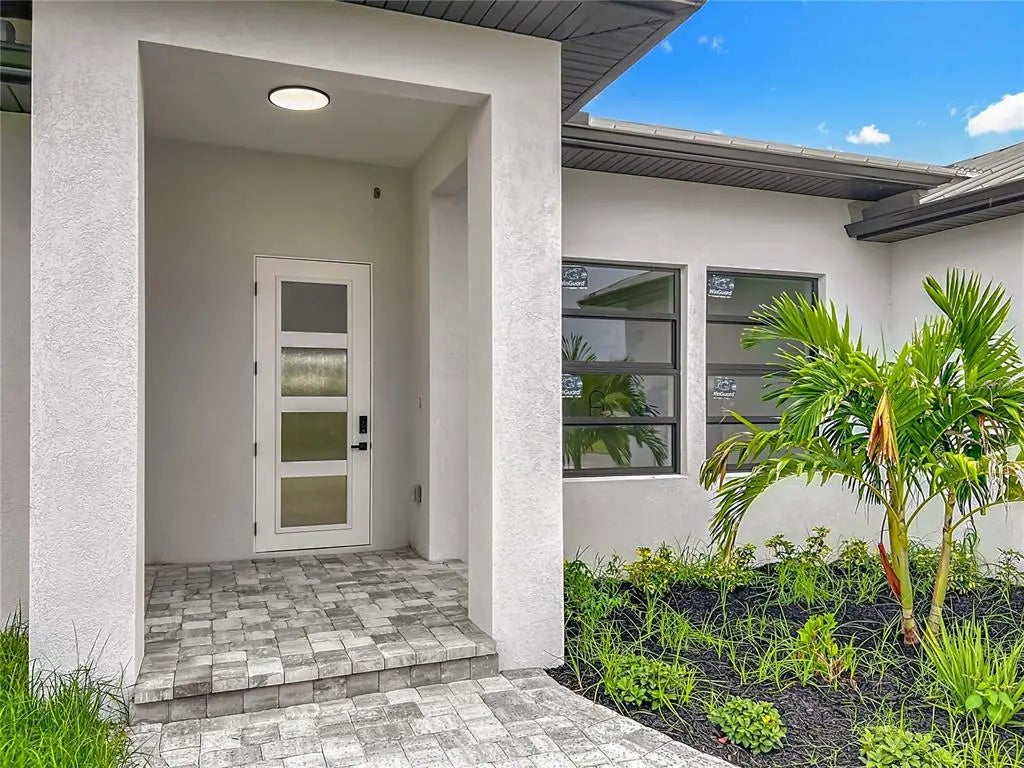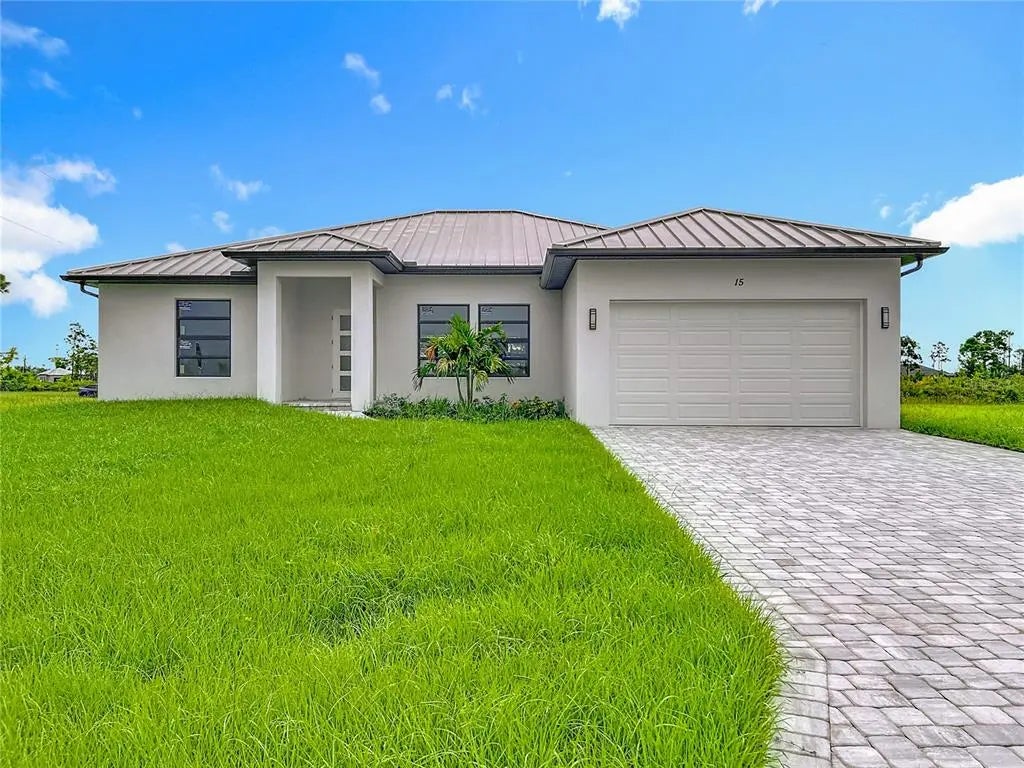 NEW CONSTRUCTION!!! CUSTOM DESIGN!! Welcome to the cozy and green community of Rotonda Sands, a laid-back neighborhood perfect for relaxed Florida living! This beautiful new home offers over 2,000 sq. ft. with 3 bedrooms, 2 bathrooms, open split floor plan, high ceilings ranging from 9 to 13 feet, 8-foot doors throughout, hurricane impact windows and doors, LVP flooring throughout and tile in bathrooms. The kitchen features quartz countertops, pantry closet, stainless steel appliances, over 8-foot long island with farmhouse sink and garbage disposal, and 42-inch cabinets. The master suite includes two walk-in closets and sliding glass doors to the lanai, while the master bath offers double sink vanity, walk-in shower, soaking tub, private toilet area and large window for natural light. Spacious laundry/utility room comes with utility sink and plenty of space for extra storage. Living room area opens to a 39-foot screened lanai finished with pavers, perfect for relaxing while enjoying Florida nature views. Additional features include a durable metal roof and pavers on the driveway. Conveniently located near beaches, parks, schools, shopping, restaurants and more—this brand new home is ready to welcome you!
