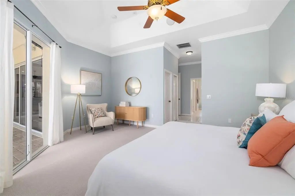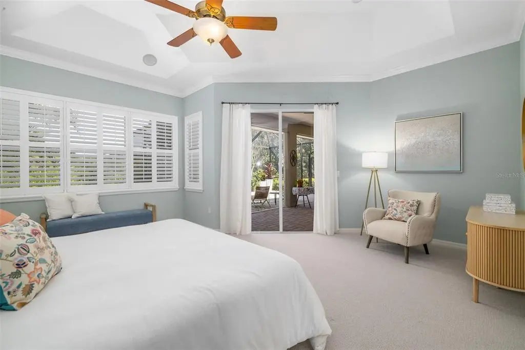 - Interior FeaturesCeiling Fan(s), Crown Molding, Eating Space In Kitchen, High Ceilings, Open Floorplan, Primary Bedroom Main Floor, Solid Wood Cabinets, Split Bedroom, Stone Counters, Thermostat, Walk-In Closet(s)