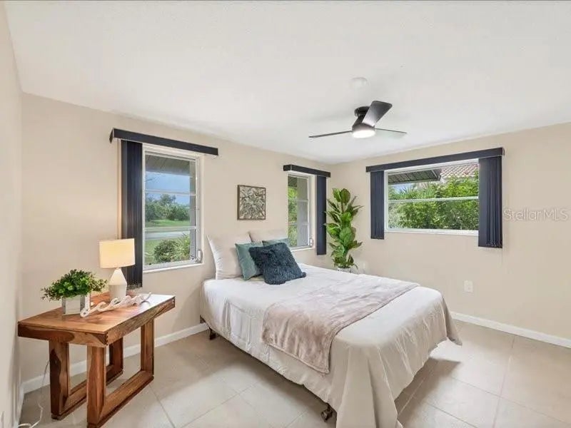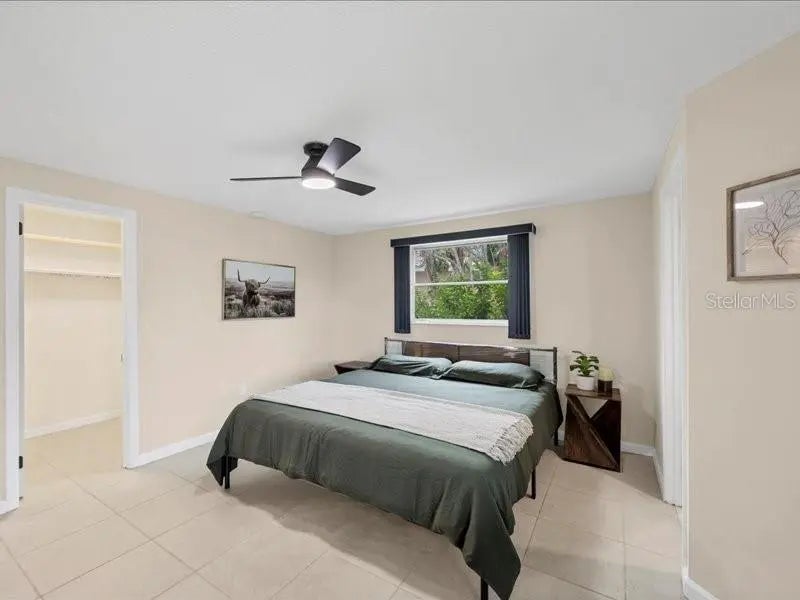 - Interior FeaturesCeiling Fan(s), Solid Surface Counters, Solid Wood Cabinets, Thermostat, Walk-In Closet(s), Window Treatments