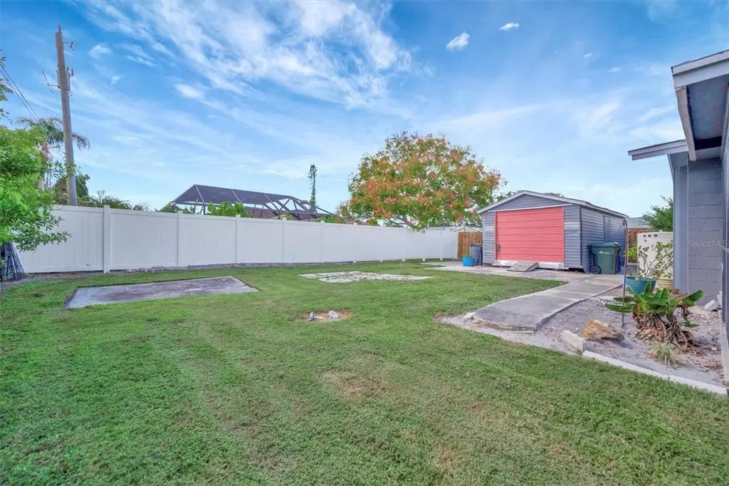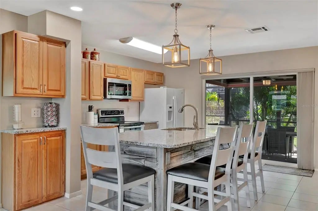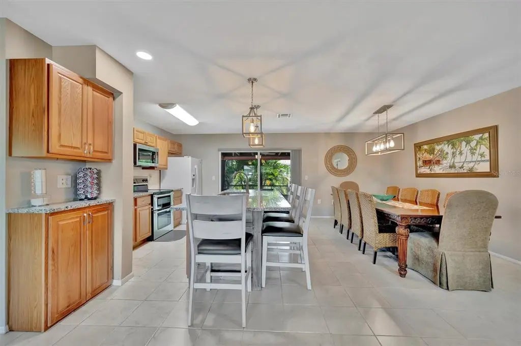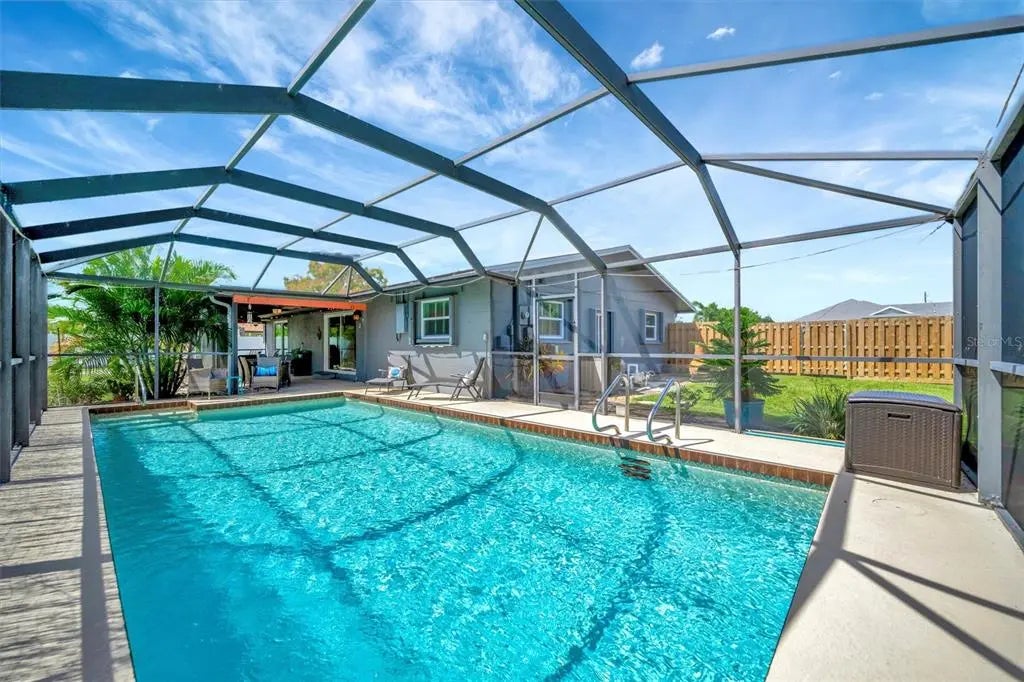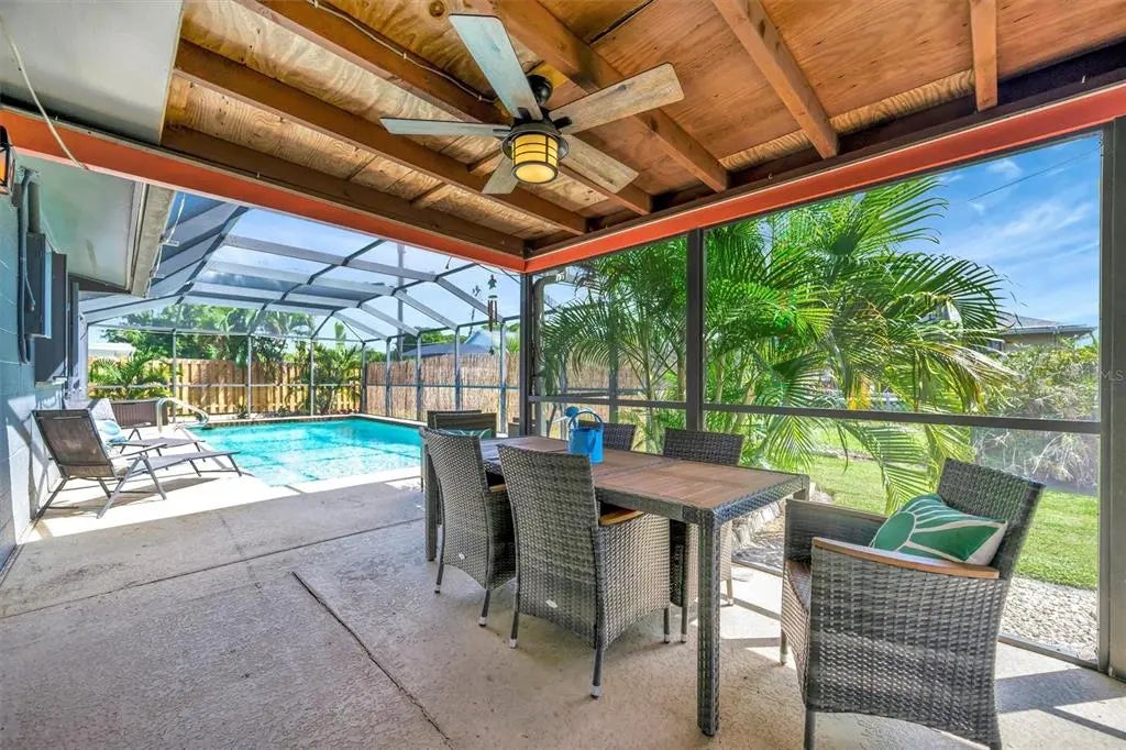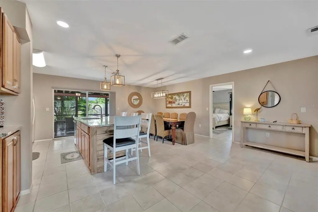 Enjoy the laid-back Florida lifestyle in this turnkey furnished South Venice POOL home on a rare triple lot! With plenty of room for your RV, boat, or extra vehicles, this 3-bedroom, 2-bathroom retreat has no HOA and sits in an X flood zone, so no flood insurance is required. Step inside this coastal-inspired home and discover a bright, open floor plan designed for entertaining. The spacious living room flows effortlessly into the dining area and updated kitchen, featuring wood cabinetry, granite countertops, and newer appliances. Just beyond the hurricane-impact sliding doors, you’ll find your private oasis — a huge screened-in, heated saltwater pool with a covered lanai perfect for outdoor dining and relaxation. The split floor plan offers privacy and comfort, with two guest bedrooms and a full bath on one side, and the primary suite on the other — complete with a walk-in closet, en-suite bath with walk-in shower, and direct access to the pool area. Enjoy peace of mind with impact windows and doors, accordion shutters, a 2020 AC and ductwork replacement, newer pool heater, and a fully fenced backyard. A detached workshop with power adds even more versatility — ideal for storage, hobbies, or your tools and toys. Ideally located within walking distance to Shamrock Park & Nature Center and just minutes from Downtown Venice, Gulf beaches, and the South Venice Boat Ramp & Ferry, where residents can access a private beach through an optional membership — this home truly captures the best of coastal Florida living. Sold turnkey furnished — just bring your suitcase and start enjoying paradise!