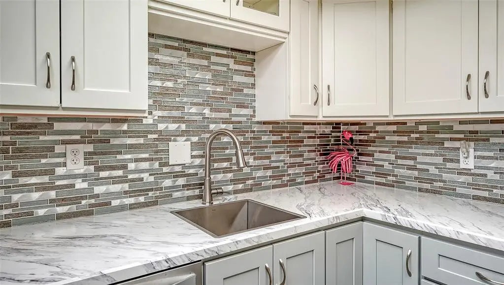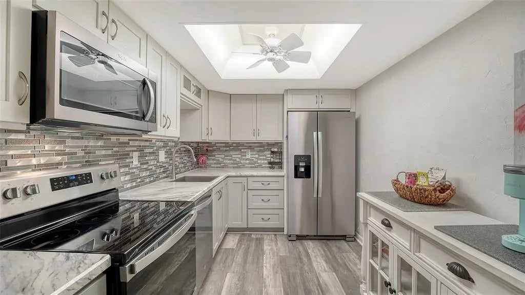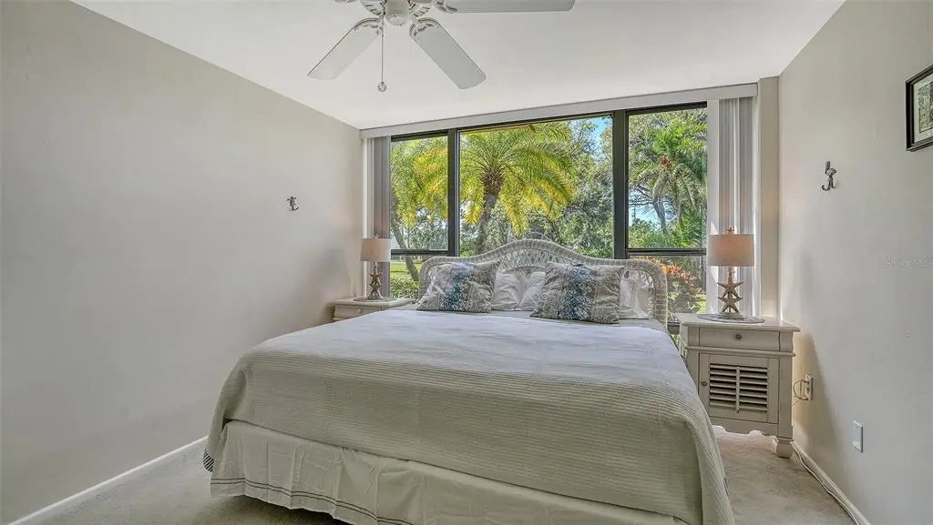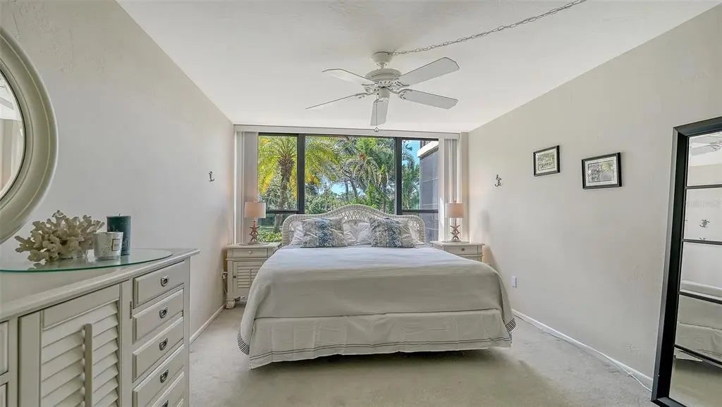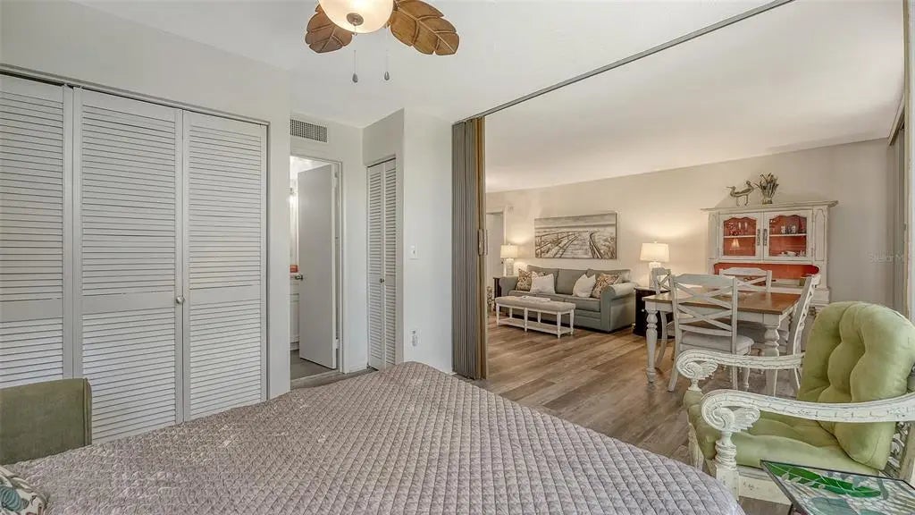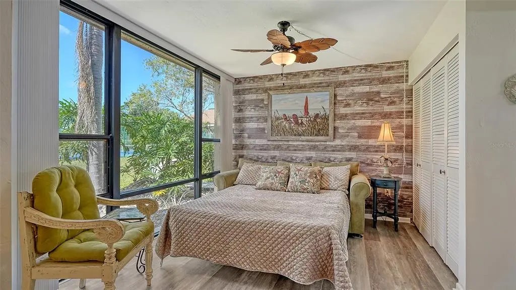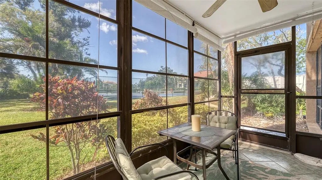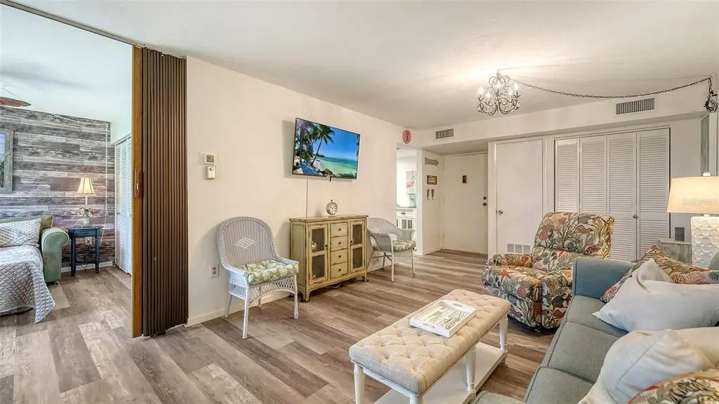 This fully renovated first-floor corner residence offers one of the most desirable locations in the community. The ground-level setting allows direct access without stairs or elevators and provides the shortest distance to the community center, which includes a pool, fitness facility, pickleball and tennis courts. The two-bedroom split floor plan enhances privacy, with each bedroom featuring an en-suite bath. A retractable wall in the guest bedroom allows flexible use of the space. The updated kitchen features solid wood cabinetry, stainless steel appliances, and generous counter space with room for breakfast table. The open great room accommodates dining and living areas and extends to a west-facing covered patio, ideal for morning coffee or evening relaxation. A new HVAC system was installed in 2023. Bird Bay offers resort-style living near downtown Venice. The community amenities include a clubhouse, pool, fitness center and courts for tennis, pickleball, shuffleboard and bocce. Seasonal activities include yoga classes, art shows and social gatherings. Access to the Legacy Trail, a popular destination for cyclists, runners and walkers, is less than a quarter mile away, providing a direct route to Venice Island. Venice Beach and Nokomis Beach are within three miles, offering opportunities for swimming, shell collecting and shoreline walks.