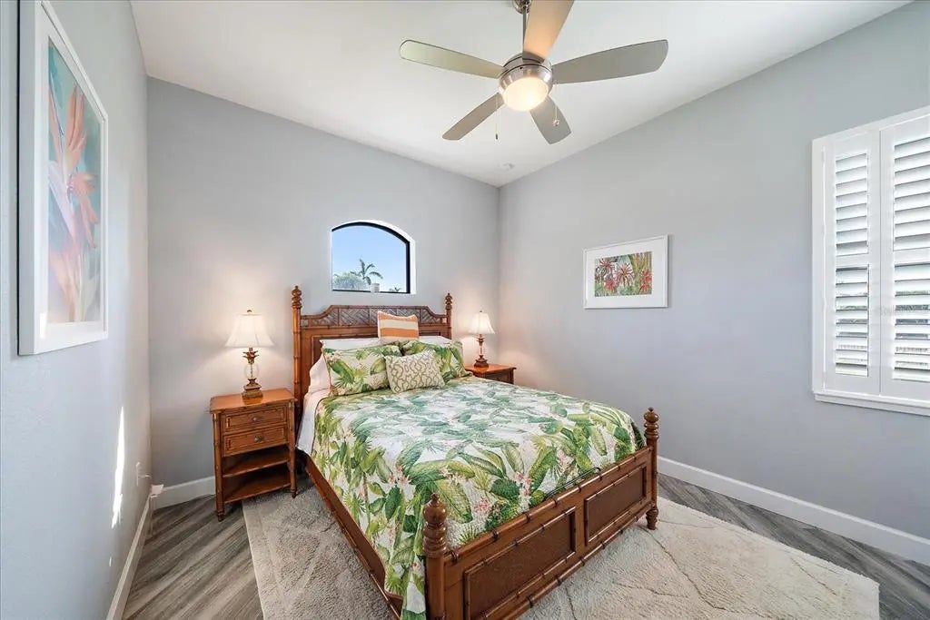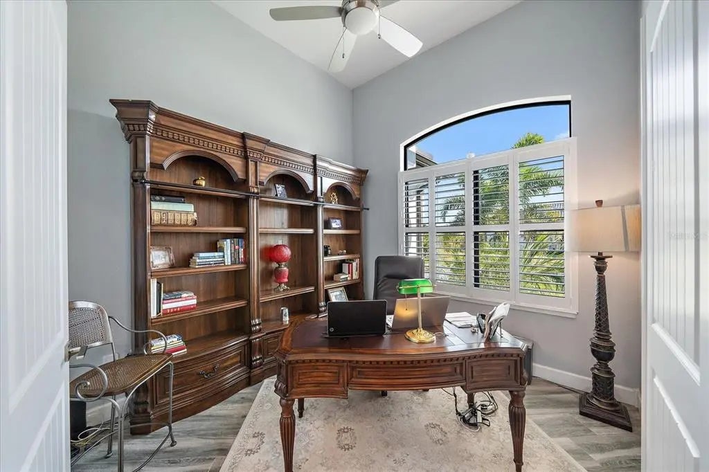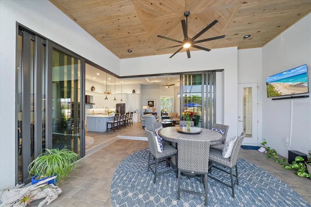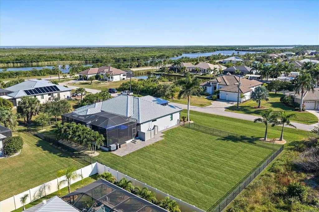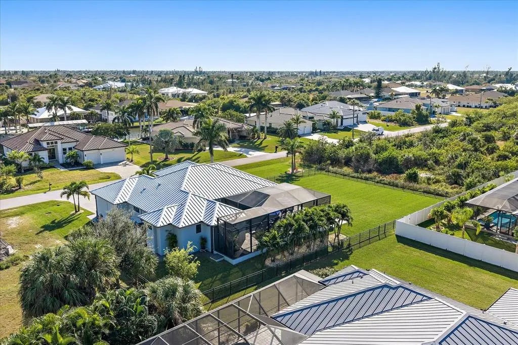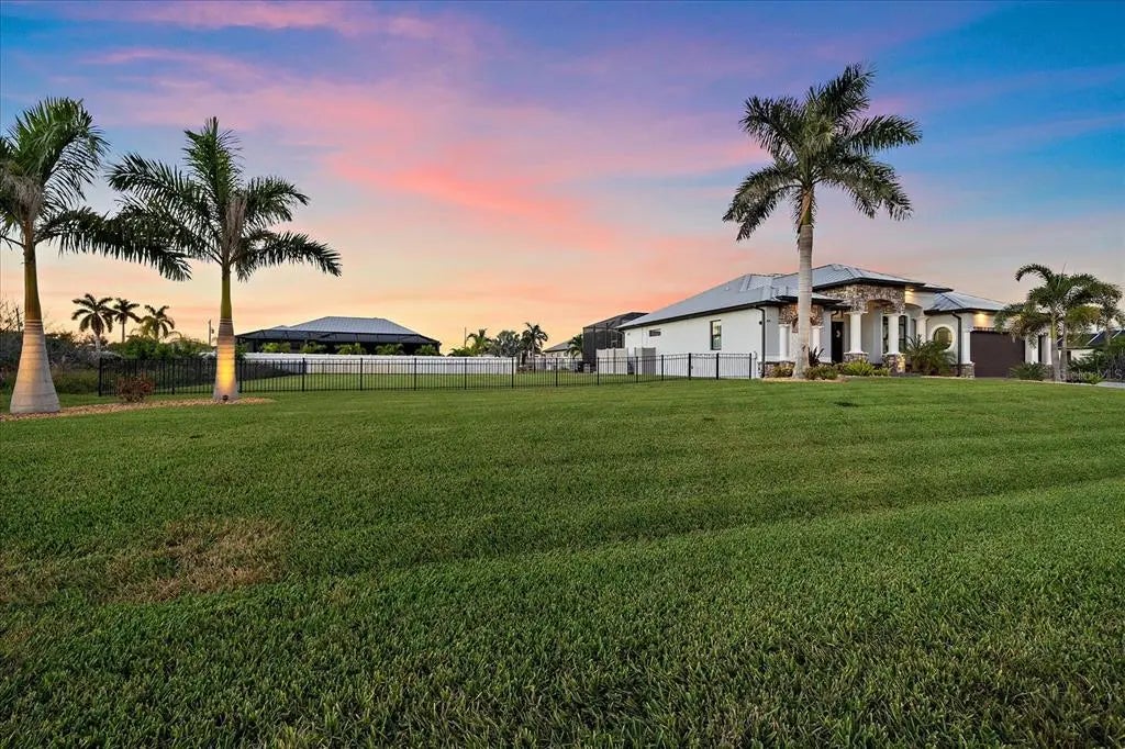 Welcome to this exquisite custom home on a double lot in South Gulf Cove, just minutes from Boca Grande. This upgraded residence features a NEW 2023 standing seam metal roof, impact windows/doors, and beautifully landscaped grounds with a new irrigation well and lighting. Inside, enjoy coffered ceilings, porcelain tile flooring, crown molding, 8' doors, and 10' zero-corner sliders that open to a stunning outdoor living space. The gourmet kitchen offers a grand center island, 42" soft-close cabinetry, granite countertops, glass backsplash, modern farmhouse sink, under/over-cabinet lighting, and high-end appliances including a built-in oven, convection microwave, induction cooktop, and 2024 dishwasher. Custom closets and pantry provide excellent storage. The great room features a custom electric fireplace and shiplap accents. The office with French doors offers private workspace. Outdoors, enjoy a cypress wood lanai ceiling, new fans, and a full outdoor kitchen with grill, mini-fridge, stainless backsplash, and vent hood. The saltwater heated pool includes new LED lighting, 2022 heater, sun shelf, and water features, plus an expanded patio for entertaining. The primary suite includes sliders to the lanai, tray ceiling, dual vanities, a free-standing tub, walk-through shower, and a large custom-built closet. Two guest rooms offer walk-in closets and pool bath access. Fully fenced in backyard. The 3-car garage features epoxy floors, insulated doors, overhead storage, and cabinets. This home combines luxury finishes, thoughtful upgrades, and true Florida indoor-outdoor living.