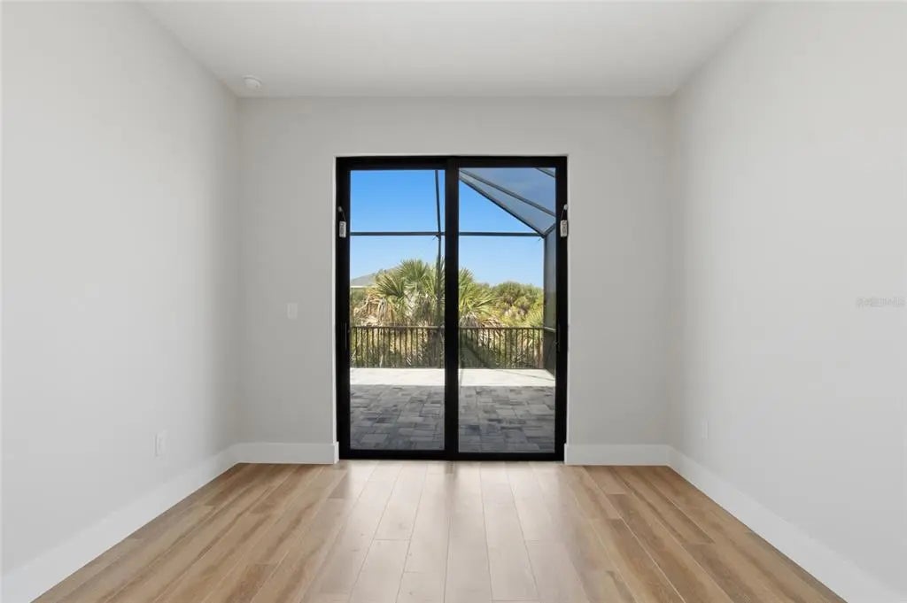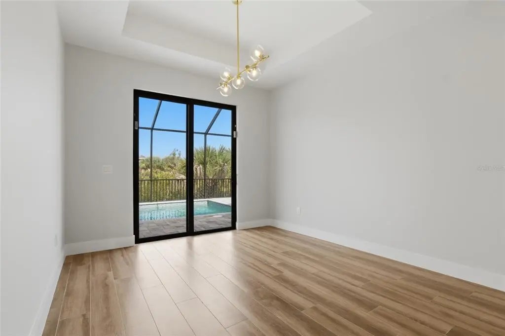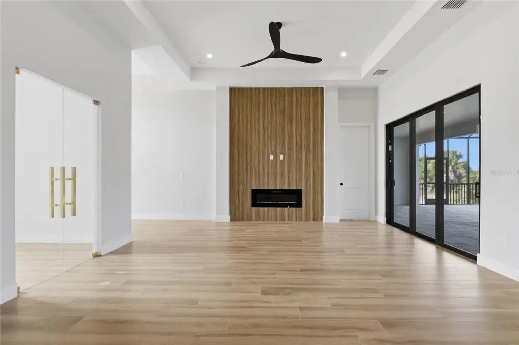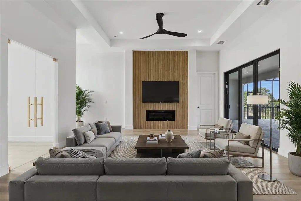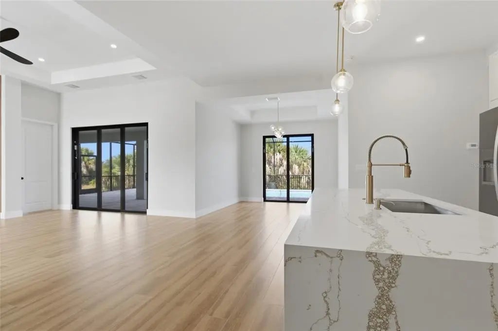 This exceptional brand-new custom-built residence showcases modern elegance and quality craftsmanship throughout. A paver driveway, grand entrance and floor-to-ceiling windows with slatted wood accents introduce the refined design within. Set on a saltwater canal with direct Gulf access in the sought-after South Gulf Cove community, this three-bedroom plus office, three-and-a-half-bathroom home offers elevated living and thoughtful functionality. Inside, soaring volume ceilings, eight-foot doors and designer wood plank tile flooring create a bright, sophisticated atmosphere. The living room features a tray ceiling with recessed lighting and a three-panel sliding glass door that opens to the covered lanai for seamless indoor-outdoor flow. The primary suite offers a serene retreat with lanai access, two walk-in closets and a spa-inspired bathroom with dual vanities, quartz countertops and a tiled shower with dual showerheads. Two additional bedrooms feature private ensuite bathrooms. The chef’s kitchen is appointed with high-end stainless steel appliances, a tile backsplash, walk-in pantry and a waterfall-edge quartz island accented by pendant lighting. Gold hardware throughout adds a refined modern touch. Hurricane-impact windows and sliding glass doors provide year-round peace of mind. Outdoor living is equally impressive, offering a covered lanai, summer kitchen, outdoor shower and a pool and spa with a sundeck. A sixty-foot paver pool deck and upgraded cage complete this exceptional setting. The oversized three-car garage provides abundant storage and additional flexibility. Located minutes from beaches, golf courses, marinas and coastal recreation, this 2,014-square-foot residence lives even larger with its open design and soaring ceilings. South Gulf Cove offers two boat ramps, five parks and convenient golf cart access, creating an ideal waterfront lifestyle. This remarkable home blends luxury, comfort and craftsmanship in a premier coastal location.