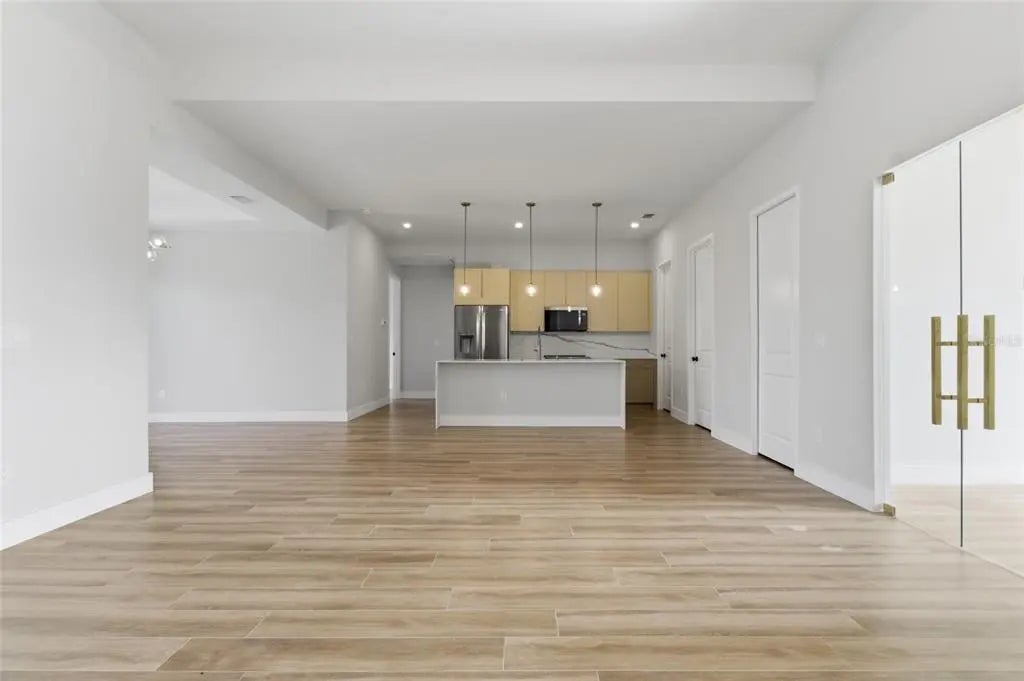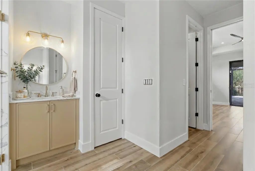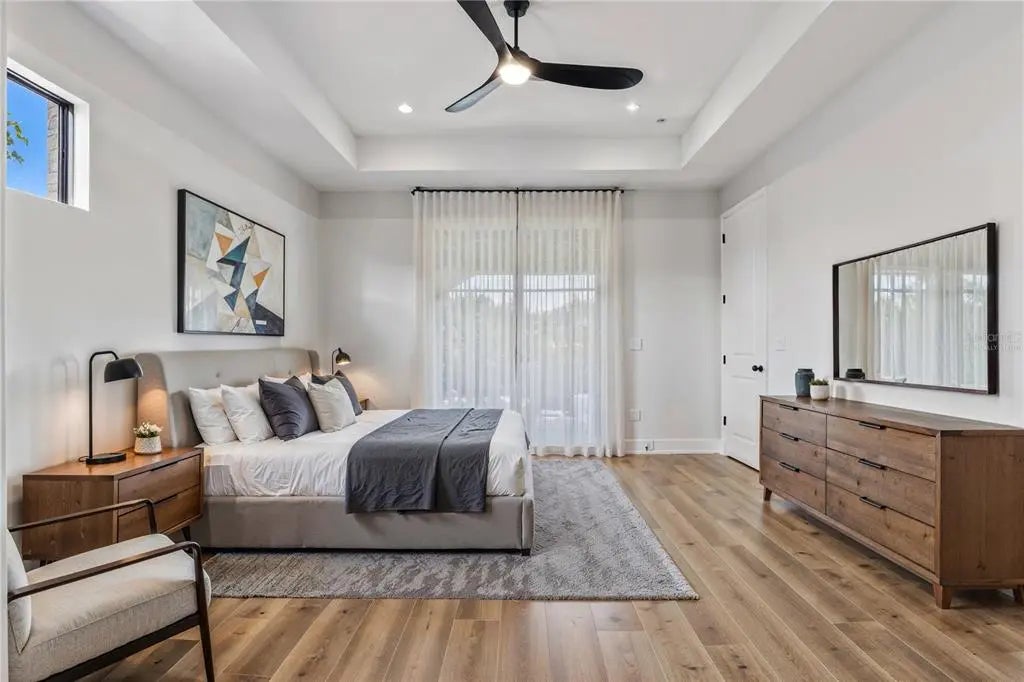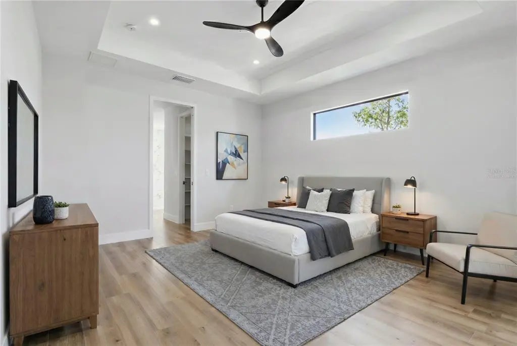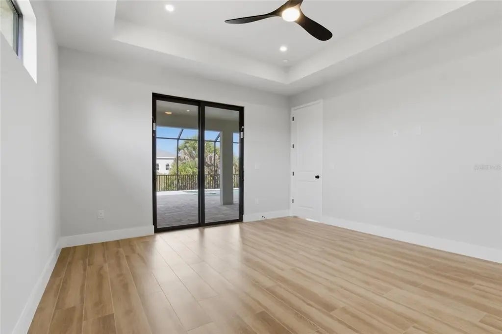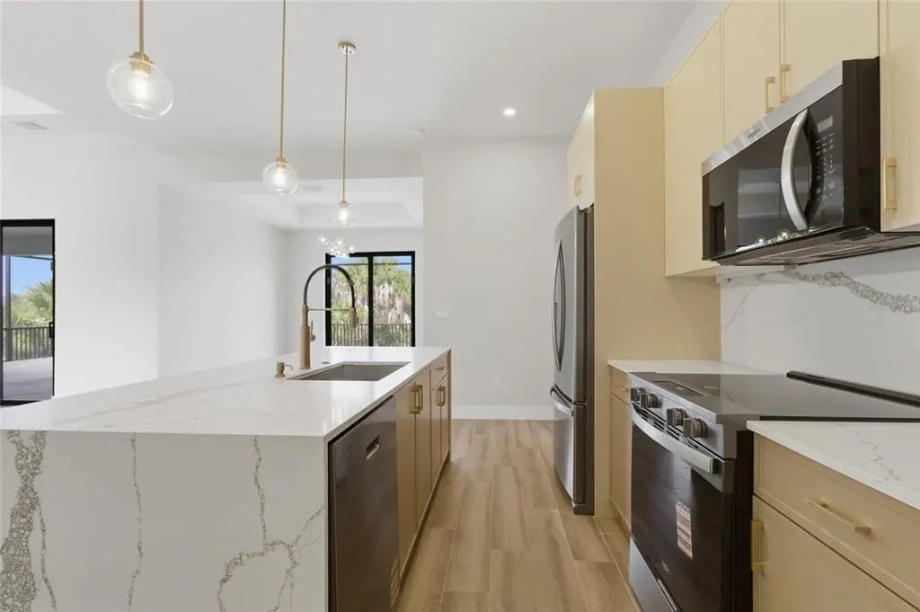 This exceptional brand-new custom-built residence showcases modern elegance and quality craftsmanship throughout. A paver driveway, grand entrance and floor-to-ceiling windows with slatted wood accents introduce the refined design within. Set on a saltwater canal with direct Gulf access in the sought-after South Gulf Cove community, this three-bedroom plus office, three-and-a-half-bathroom home offers elevated living and thoughtful functionality. Inside, soaring volume ceilings, eight-foot doors and designer wood plank tile flooring create a bright, sophisticated atmosphere. The living room features a tray ceiling with recessed lighting and a three-panel sliding glass door that opens to the covered lanai for seamless indoor-outdoor flow. The primary suite offers a serene retreat with lanai access, two walk-in closets and a spa-inspired bathroom with dual vanities, quartz countertops and a tiled shower with dual showerheads. Two additional bedrooms feature private ensuite bathrooms. The chef’s kitchen is appointed with high-end stainless steel appliances, a tile backsplash, walk-in pantry and a waterfall-edge quartz island accented by pendant lighting. Gold hardware throughout adds a refined modern touch. Hurricane-impact windows and sliding glass doors provide year-round peace of mind. Outdoor living is equally impressive, offering a covered lanai, summer kitchen, outdoor shower and a pool and spa with a sundeck. A sixty-foot paver pool deck and upgraded cage complete this exceptional setting. The oversized three-car garage provides abundant storage and additional flexibility. Located minutes from beaches, golf courses, marinas and coastal recreation, this 2,014-square-foot residence lives even larger with its open design and soaring ceilings. South Gulf Cove offers two boat ramps, five parks and convenient golf cart access, creating an ideal waterfront lifestyle. This remarkable home blends luxury, comfort and craftsmanship in a premier coastal location.