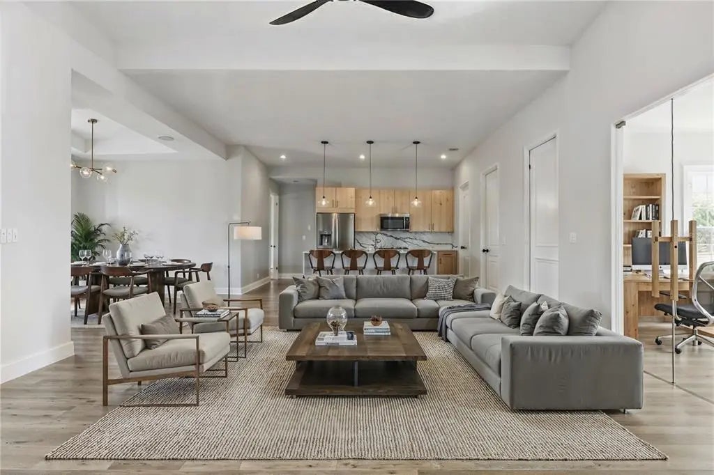 - Interior FeaturesCeiling Fan(s), High Ceilings, Kitchen/Family Room Combo, Living Room/Dining Room Combo, Open Floorplan, Primary Bedroom Main Floor, Solid Surface Counters, Thermostat, Walk-In Closet(s)