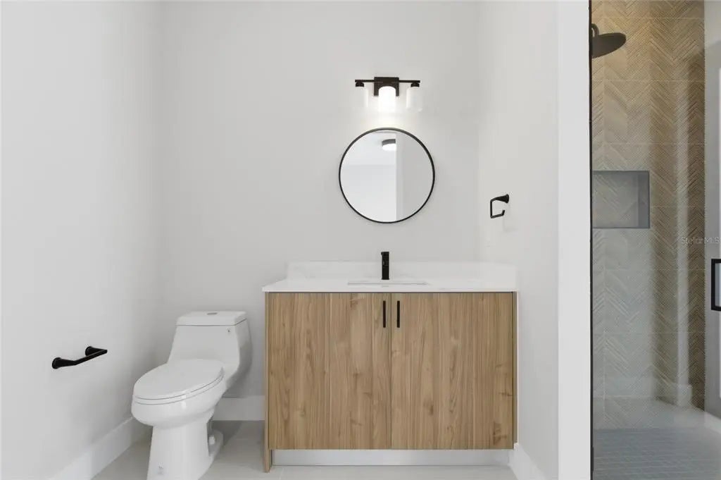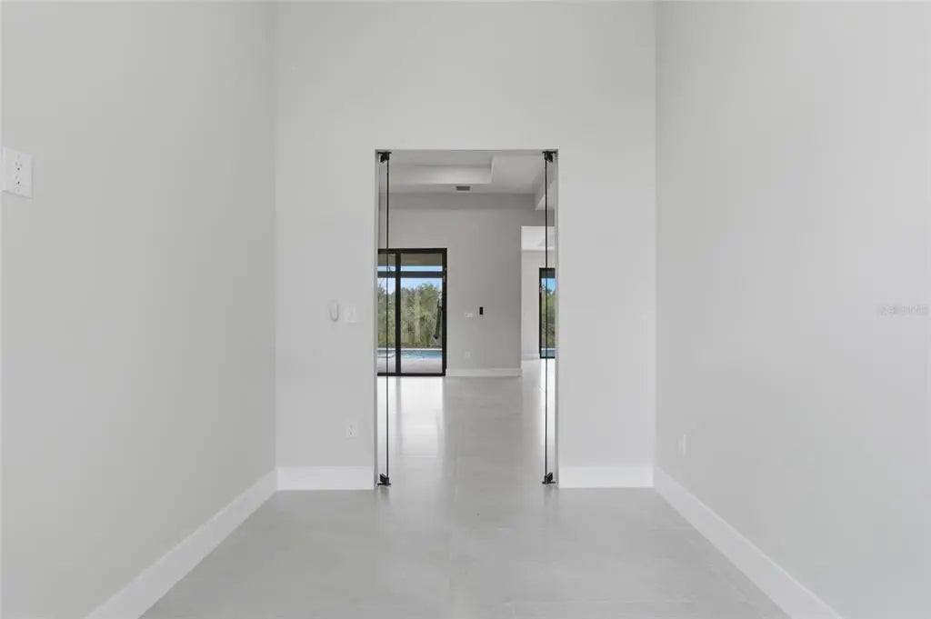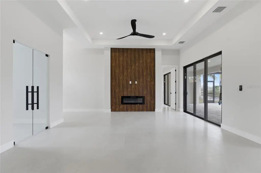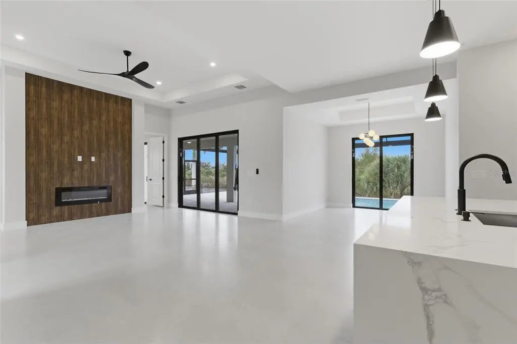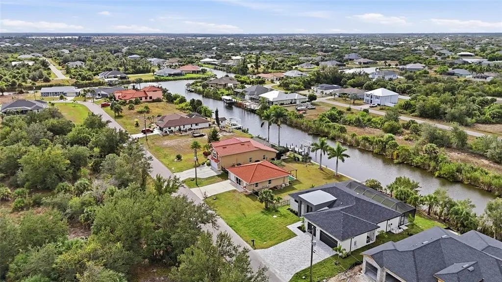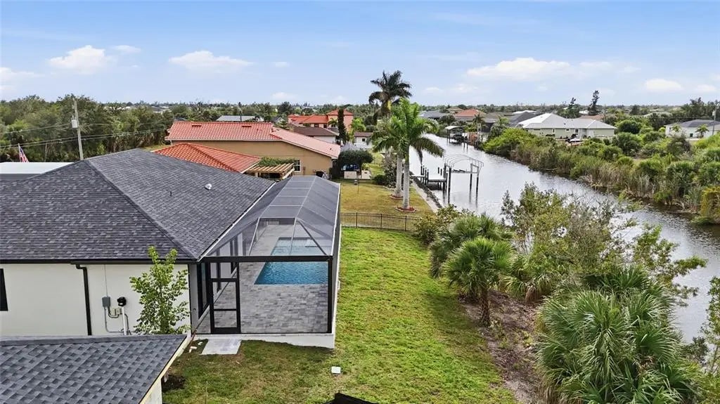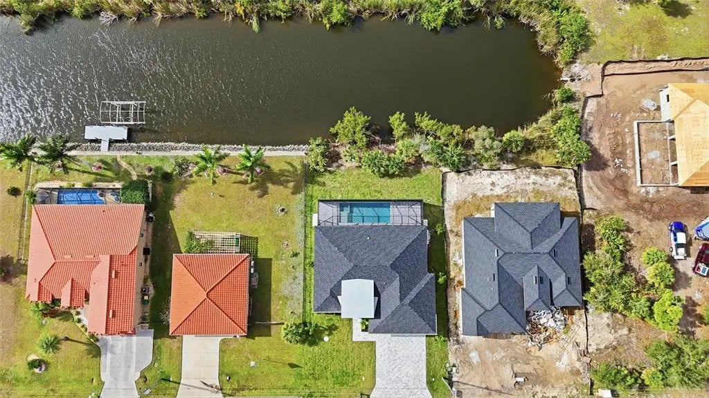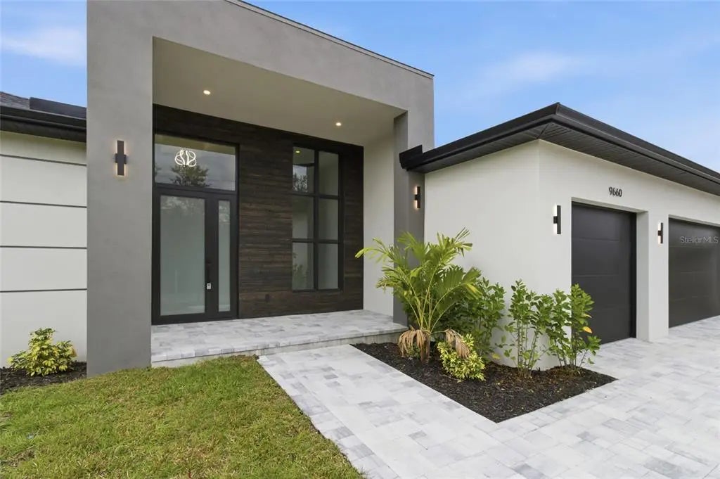 Experience contemporary coastal living at its finest in this newly completed custom home, crafted with exceptional attention to detail and a sleek modern aesthetic. From the moment you arrive, the clean-lined paver driveway, striking facade, and expansive windows set the tone for the refined design that continues throughout the interior. Ideally positioned on a saltwater canal with direct Gulf access, this three-bedroom plus office, three-and-a-half-bath residence is located in the desirable South Gulf Cove community—perfect for boaters and those seeking a relaxed waterfront lifestyle. Step inside and you’ll be greeted by soaring ceilings, eight-foot doors, and stunning 24x48 marble-look tile flooring that elevates the home’s bright, polished ambiance. The great room is highlighted by a tray ceiling, recessed lighting, and a large three-panel slider that opens fully to the covered lanai, creating a seamless connection between indoor comfort and outdoor enjoyment. The primary suite provides a private sanctuary with direct lanai access, dual walk-in closets, and a spa-inspired bathroom featuring quartz countertops, double vanities, and an elegantly tiled shower with dual shower heads. Two guest suites each offer their own ensuite bathrooms, ensuring comfort and privacy for visitors. Designed for both everyday living and entertaining, the chef’s kitchen includes premium stainless steel appliances, a walk-in pantry, tile backsplash, and a waterfall-edge quartz island illuminated by modern pendant lighting. Sleek black hardware adds a bold, contemporary contrast throughout the home. Additional upgrades include hurricane-impact windows and sliding doors for year-round safety and peace of mind. Outside, embrace the essence of Florida living with a resort-style pool and spa overlooking the canal—a tranquil setting ideal for quiet mornings, relaxing afternoons, and entertaining against a peaceful waterfront backdrop.