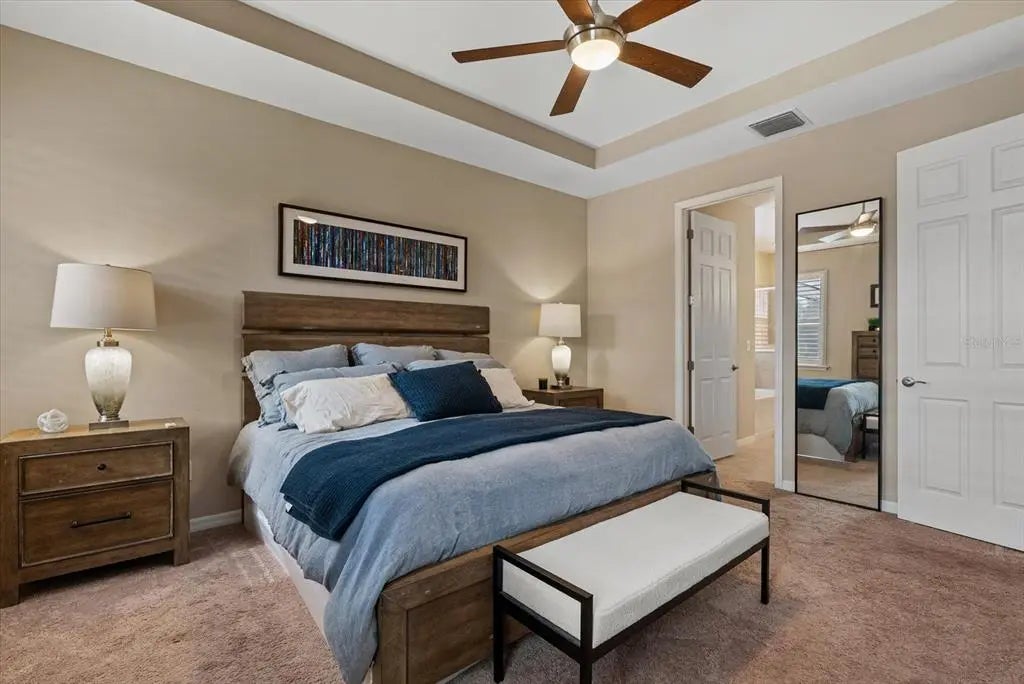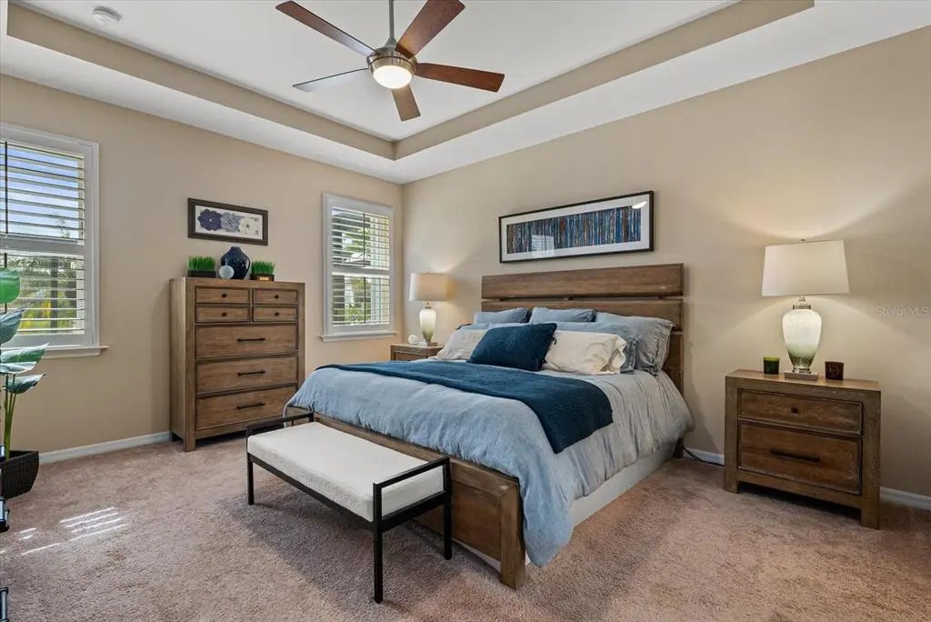 - Interior FeaturesCeiling Fan(s), Coffered Ceiling(s), Crown Molding, High Ceilings, Living Room/Dining Room Combo, Open Floorplan, Primary Bedroom Main Floor, Solid Surface Counters, Split Bedroom, Stone Counters, Tray Ceiling(s), Walk-In Closet(s)