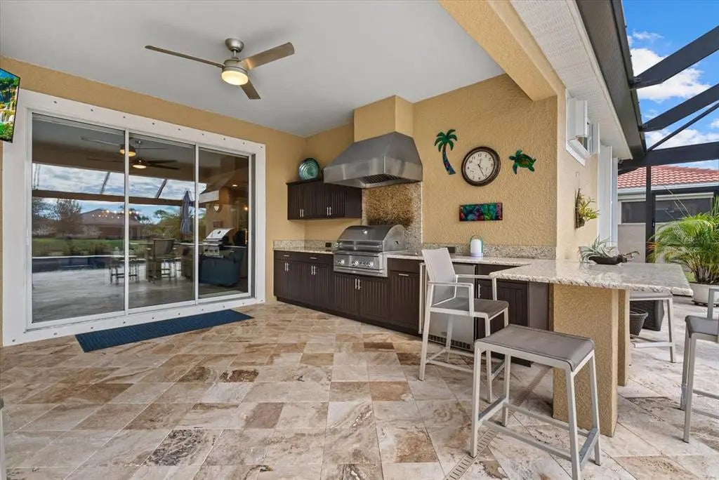 - Exterior FeaturesHurricane Shutters, Irrigation System, Lighting, Outdoor Kitchen, Rain Gutters, Sidewalk, Sliding Doors