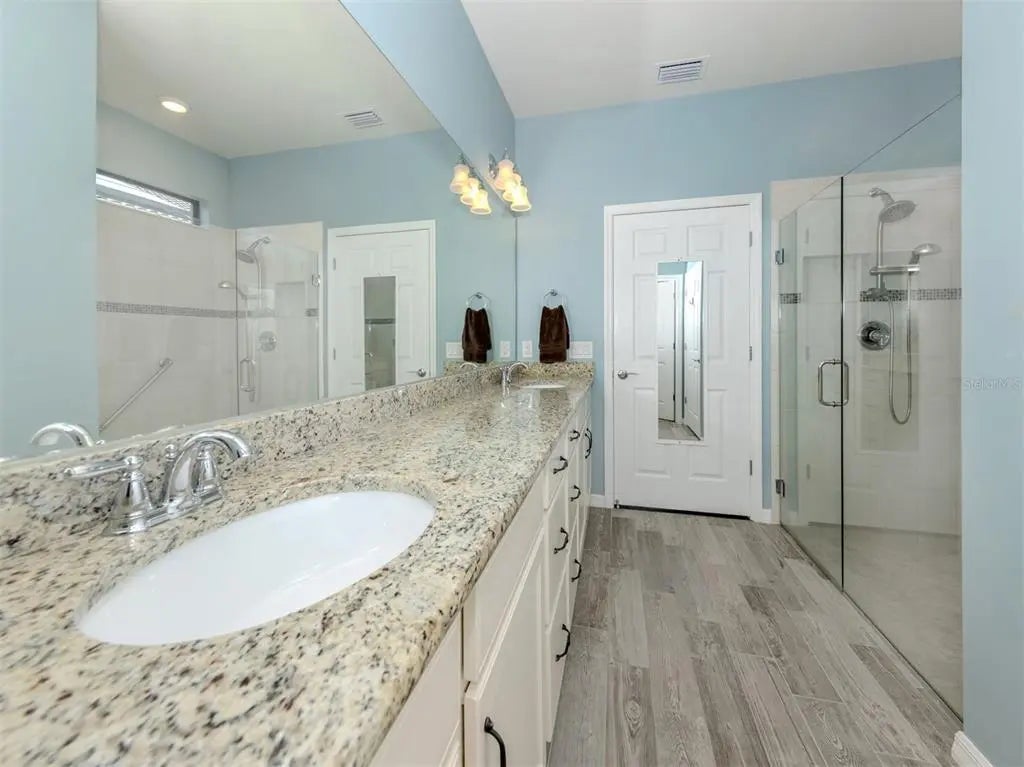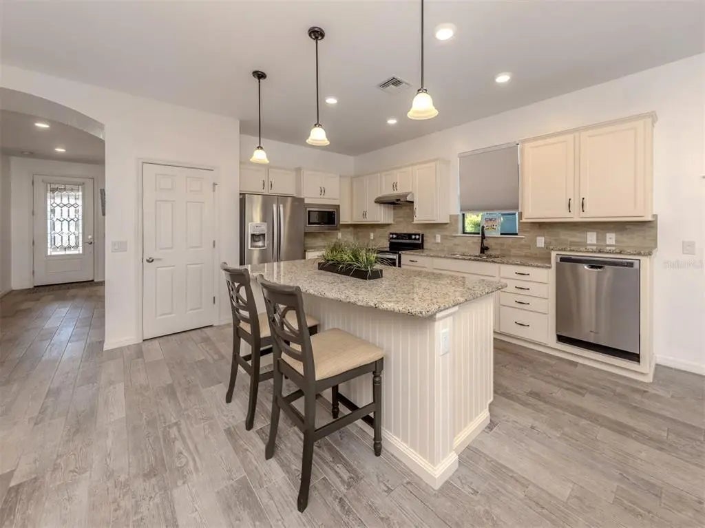 Location truly matters—and Yelma Street delivers. Tucked on a quiet cul-de-sac with a Venetian bridge at the end of the street, this home is just one street from the clubhouse and surrounded by scenic walking paths and expansive lakes. Friendly neighbors and an active community create a welcoming, social atmosphere. This Abbeville model offers beautiful water views, high-wind impact windows and doors, and an extended lanai with clear-view screening—perfect for enjoying morning coffee. A screened front porch, stone facade, and extended brick paver driveway add to the home’s curb appeal. Inside, the home features wood-plank tile flooring, fresh neutral paint, 8-foot doors, and a split floor plan with 2 bedrooms, 2 baths, plus a flex room ideal as a den or optional guest space. The primary suite overlooks the water and includes a large walk-in closet and an en-suite bath with dual granite vanities and a walk-in shower with an infinity glass wall. The kitchen is both stylish and functional, offering 42-inch cream cabinetry, granite counters, a large island with designer lighting, stainless steel appliances, subway tile backsplash, and a closet pantry with a built-in spice rack. The two-car garage includes a water softener, ceiling-mounted storage rack, and an electrical panel ready for a generator. Islandwalk is a gated, resort-style community known for its vibrant lifestyle. Residents enjoy two clubhouses, two resort pools, two lap pools, two fitness centers, pickleball and Har-Tru tennis courts, bocce, a dog park, a community garden, and miles of walking, biking, and golf-cart paths over picturesque Venetian bridges. A full-time paid social director coordinates classes, such as yoga, chair yoga, strength training, and dance, as well as monthly concerts, dances, game nights, card games, and community events. Conveniently located near shopping, dining in Wellen Park, Atlanta Braves Spring Training Stadium, and Venice’s beautiful beaches—this home offers the perfect blend of location, lifestyle, and low-maintenance living. Request your showing today!