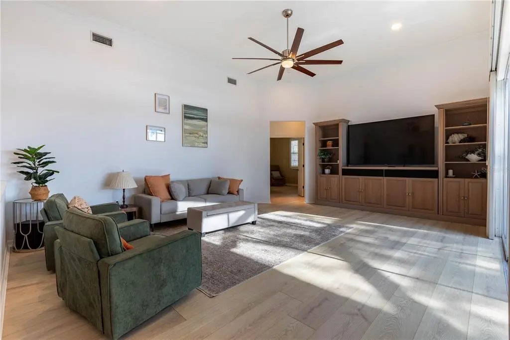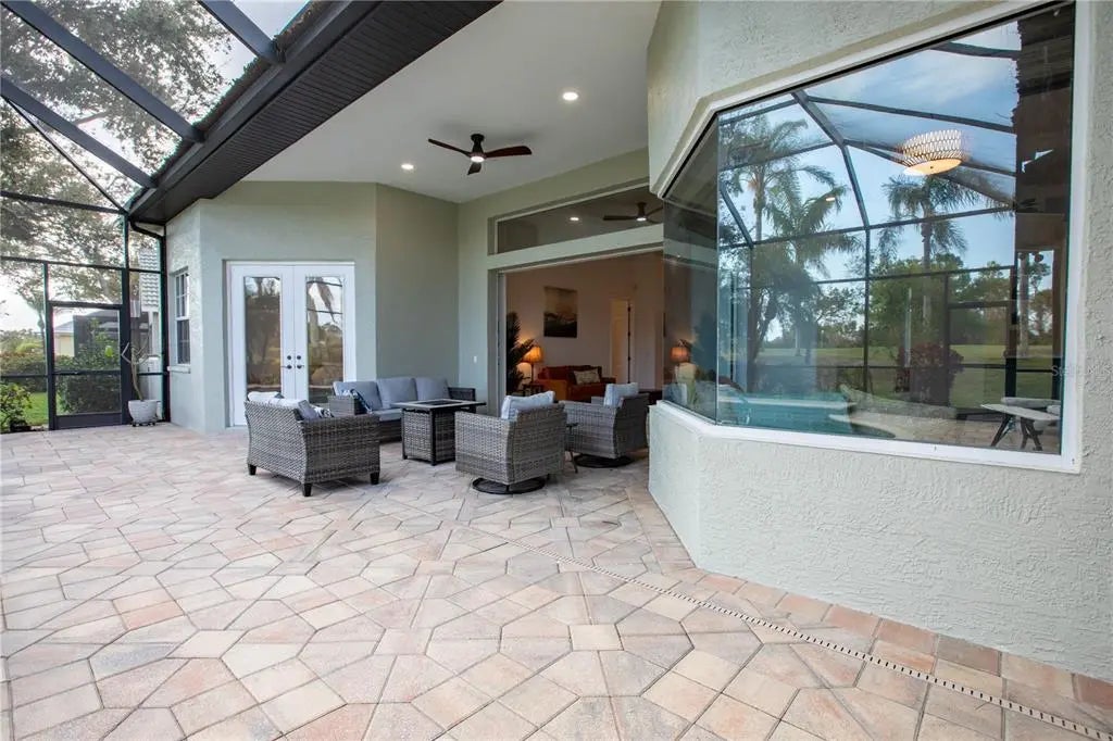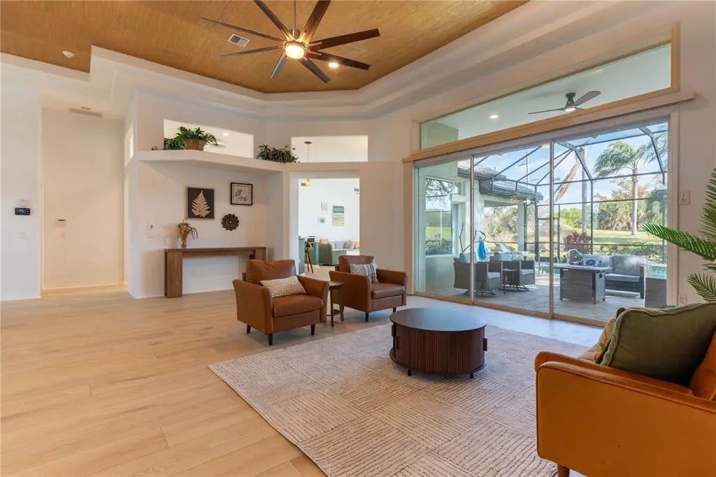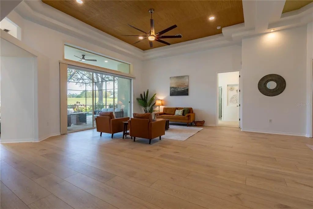 Welcome to your dream home in The Reserve! This newly renovated residence offers 4 bedrooms, a den, and 3,500 square feet of luxurious living space. Nestled on a quiet cul-de-sac and nearly half an acre, this property features sweeping golf course views and an expansive private side yard. Enjoy natural privacy with a portion of the yard planted with native Florida trees and palms, which also helps with drainage during the rainy season. The rest of the lot was elevated prior to construction for enhanced water protection. Inside, you’ll find new 9x78 hybrid oak plank flooring in the main living areas, den, and guest bedrooms. The primary bedroom has new neutral textured carpet throughout the bedroom, linen closet, and two walk-in closets. All three bathrooms have been fully updated with porcelain tile floors, contemporary vanities, and modern tiled showers. Fixtures and plumbing are newly updated as well. The expanded pool bath now includes direct pool access, a changing area, and extra storage. The kitchen is a chef’s delight with custom white shaker cabinets, cove crown molding, quartz countertops, and an extra-large stainless-steel sink. All appliances are less than 5 years old. Both main living spaces feature disappearing triple sliding doors—perfect for entertaining or soaking in the beautiful surroundings. Fresh paint and new lighting throughout create a bright, modern feel. Step outside to a Pebble Tec inground pool, decorative paver lanai, and brand-new screening. Additional highlights include a new roof (2024), a massive 36x22 garage with closet storage, a 2021 hurricane-rated garage door, and a hot-water-return system for instant hot water. The main house AC and water heater are approximately 5 years old, and irrigation is from a private well. This home is being offered with all furniture and decor pictured for the buyer’s convenience, at no additional cost. Sellers are happy to remove all furniture and decor as well, if that is the preference. The Reserve is a highly sought-after gated community known for its beautiful environment and close proximity to golf, shopping, dining, and area beaches. This home is perfect for those seeking space, privacy, and natural surroundings, all while enjoying convenient access to everything the area has to offer.