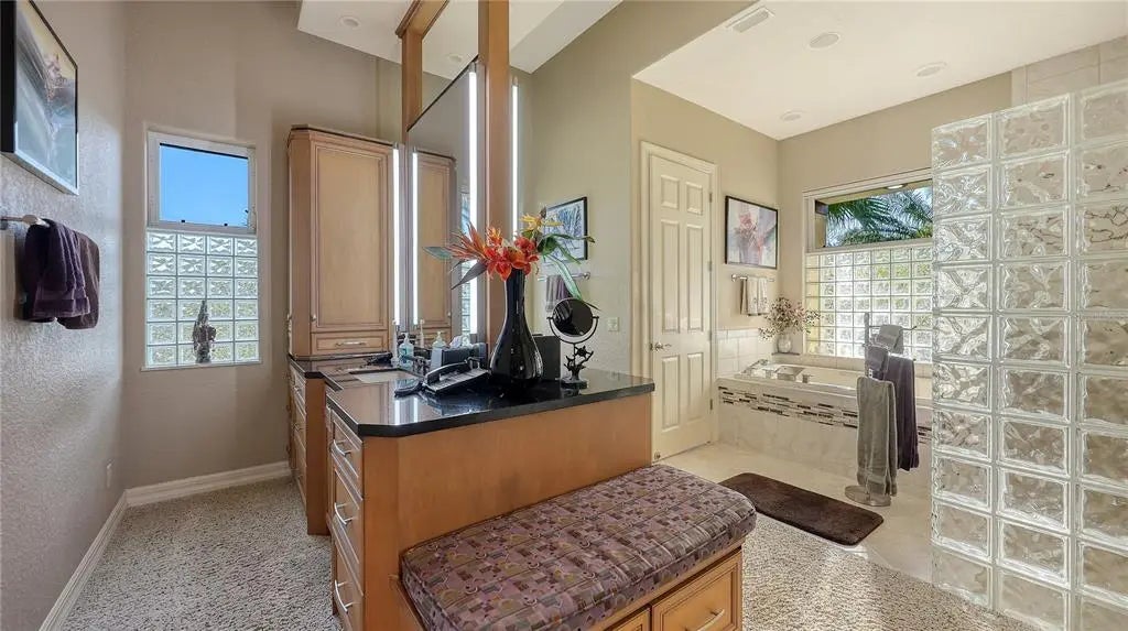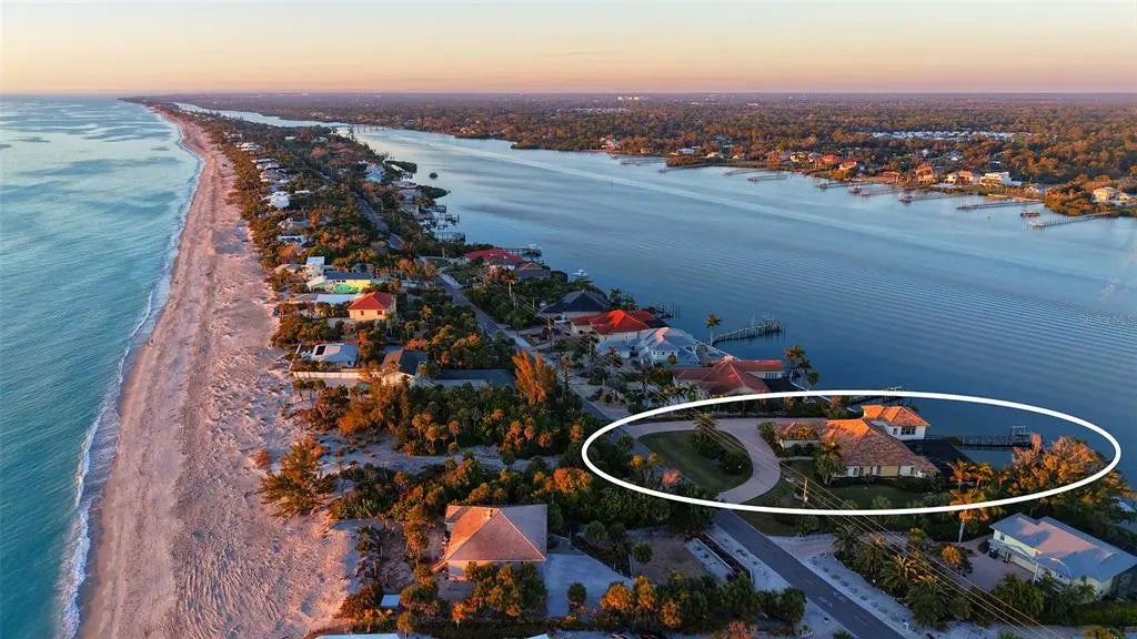 Set on nearly a full acre with 214 feet of direct bay frontage, this Manasota Key waterfront estate offers a rare bay-to-Gulf lifestyle, combining deep-water boating access with deeded beach access just across the street. Positioned along a quiet stretch of Manasota Key Road, the property delivers privacy, scale, and unobstructed water views across Lemon Bay. Built in 2001 by Newport Home Builder, the residence spans more than 5,200 square feet across two living levels and has been meticulously maintained with thoughtful updates, including a new tile roof in 2024 and new impact-rated garage doors serving the oversized four-car garage. Impact glass windows and sliders throughout the home frame the bay while enhancing storm protection and energy efficiency. The main living level is designed for everyday comfort and entertaining. Diagonal tile flooring connects the living room—opening directly to the screened bayfront lanai—with the formal dining area and expansive kitchen. The chef’s kitchen features solid-wood cabinetry, granite countertops, center island, breakfast bar, informal dining space, and walls of glass that open to the covered patio and summer kitchen. The adjacent family room enjoys panoramic bay views and seamless outdoor connection. The primary suite is located on the main level, offering a private retreat with a stone-encased fireplace, morning kitchen, custom walk-in closet, en-suite bath, and direct access to the bayfront patio. Two additional guest suites, a dedicated office or study, and a laundry room complete the first floor. Upstairs, guests enjoy a loft-style sitting area, a spacious bedroom suite overlooking the bay (large enough to also be a primary suite), and a fifth bedroom currently used as an additional office—providing flexibility for multi-generational living, work-from-home needs, or extended stays. Outdoor living is a defining feature. The panoramic screened pool deck, completed with travertine flooring, surrounds a resurfaced PebbleTec pool and raised spa, creating a comfortable setting for waterfront entertaining. Boating enthusiasts will appreciate the deep-water dock, updated in 2016 and equipped with a boat lift, electric, and water—offering no fixed bridges and direct access to open bay waters and the Gulf of Mexico. Beach access is conveniently located just across the street. Ideally positioned on Manasota Key, this estate offers quick access to local waterfront dining, marinas, and nature preserves, while remaining close to Englewood, Venice, and Sarasota’s Cultural Coast. Championship golf courses, shopping, and dining are nearby, with world-class beaches lining both Manasota Key and nearby barrier islands. A rare opportunity to secure a direct bayfront property with beach access, acreage, and deep-water boating—delivering the best of Southwest Florida coastal living.