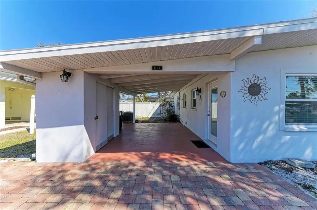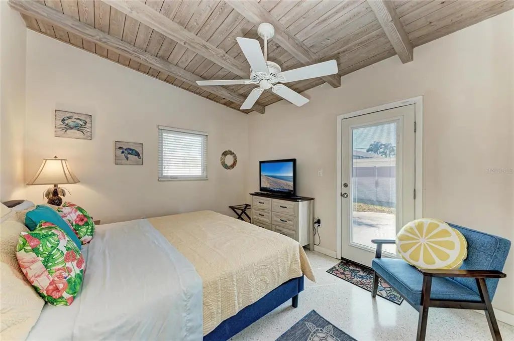 Own a piece of Golden Beach just two blocks from private deeded beach access — all outside the flood zone. Welcome to 817 Harbor Drive S, where Old Florida charm meets thoughtful mid-century modern updates in one of Venice Island’s most coveted neighborhoods. Whether you’re looking for a beach getaway, a vacation rental opportunity, or a prime homesite in Golden Beach, this property offers flexibility, character, and location all in one. Step inside and you’ll immediately feel the warmth — restored original terrazzo floors, vaulted ceilings with exposed wooden beams, and natural light pouring in through the sunroom create a relaxed coastal atmosphere that feels both timeless and inviting. The open living space flows effortlessly, offering room to gather, unwind, or host guests after a day at the beach. The updated kitchen features granite countertops, stainless appliances, and clean finishes that blend seamlessly with the home’s mid-century personality. New interior doors and baseboards elevate the overall feel, while a brand-new roof (2025) and Impact windows adds peace of mind. The primary bedroom offers private patio access — perfect for quiet mornings with coffee under the oak trees. A second bedroom provides flexibility for guests or family. The glass-enclosed sunroom adds additional living space, ideal for a home office, reading nook, or overflow guest area. Outside, the oversized fenced backyard is a rare find on the Island — complete with a large patio for entertaining, mature landscaping for privacy, and two storage options for beach gear and bikes. The carport provides shaded parking and convenient access. Golden Beach residents enjoy private deeded beach access just a few blocks away — meaning peaceful Gulf sunsets without the crowds. Located on Venice Island, you’re also just minutes to Sharky’s Pier, the public beach, boutique shopping, dining, and the charm of Historic Downtown Venice. Whether you preserve and enjoy this classic coastal cottage, generate vacation rental income, or build your custom dream home in one of the Island’s premier neighborhoods — the value here is undeniable. Venice Island living, private beach access, no flood zone, and Golden Beach prestige — this is the opportunity buyers wait for.