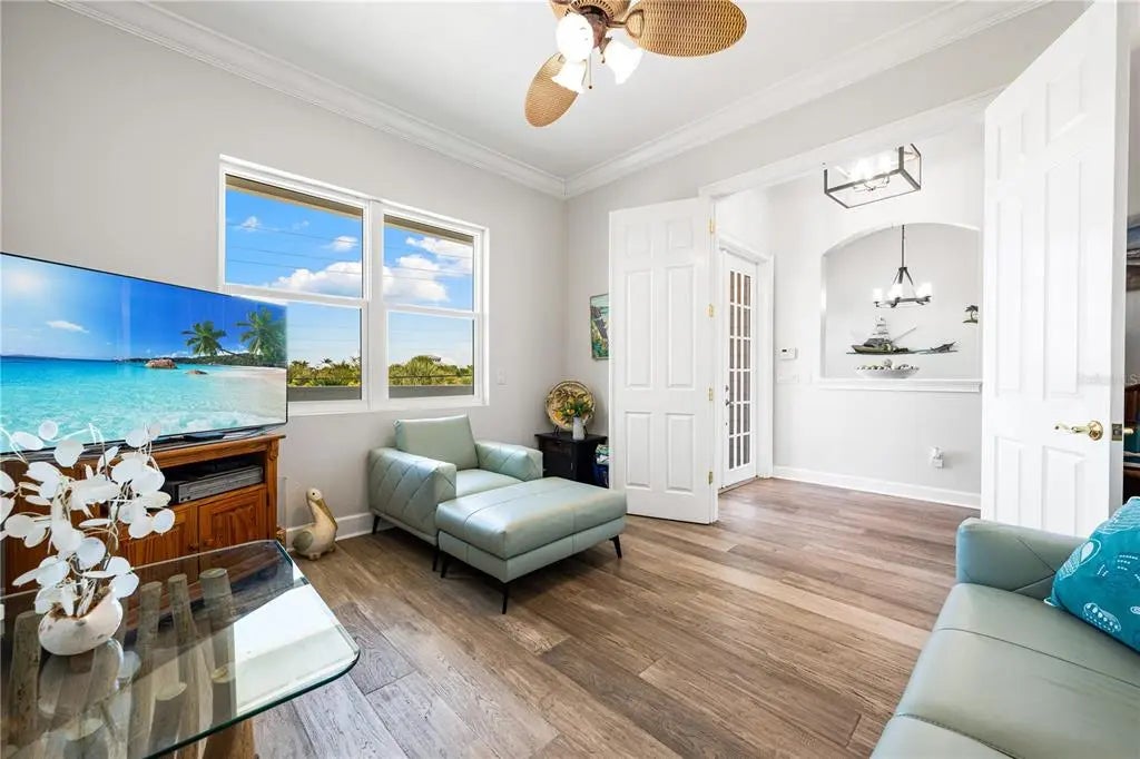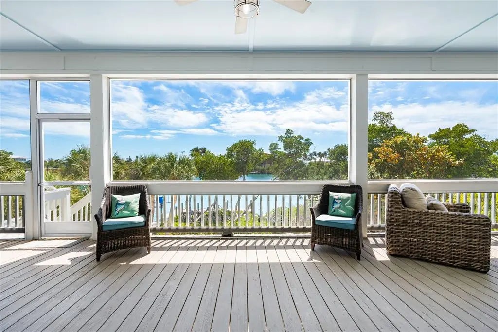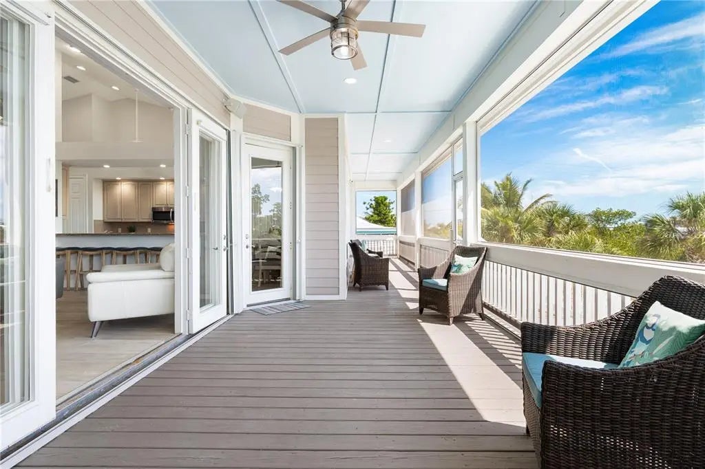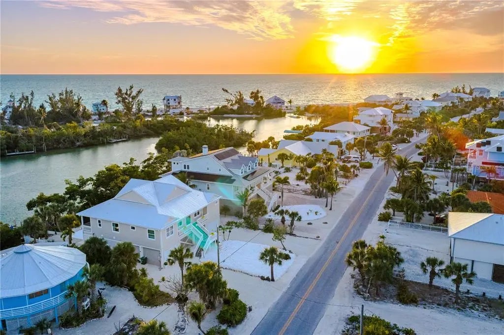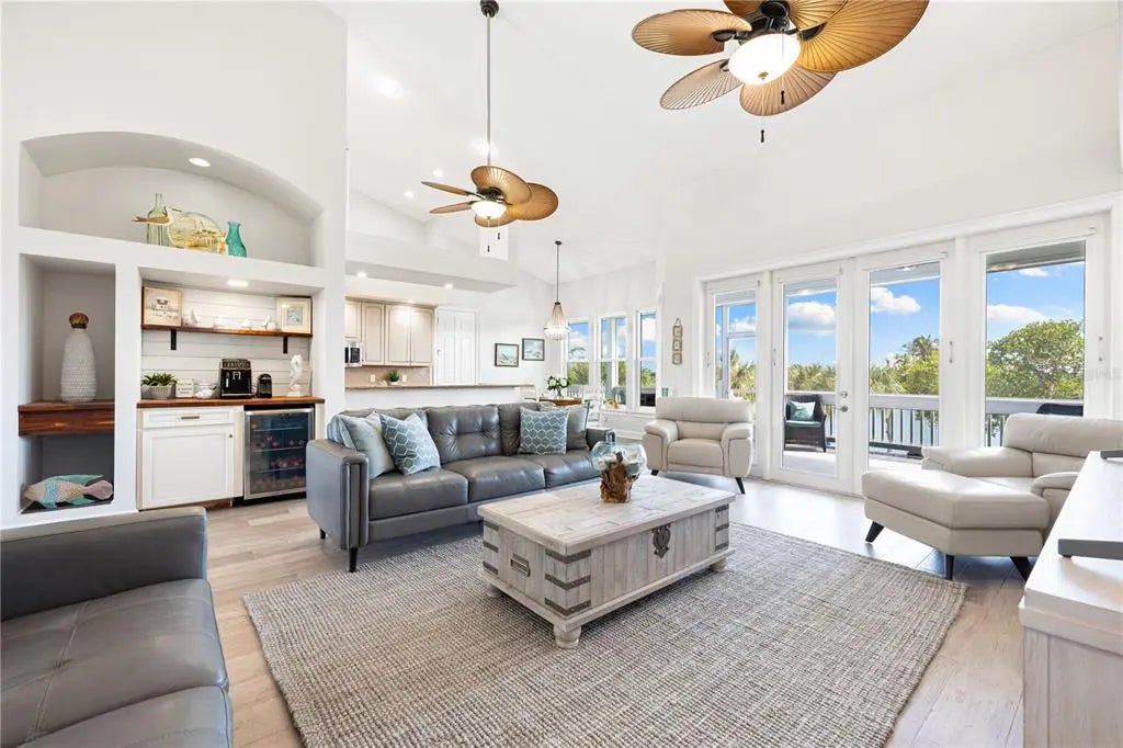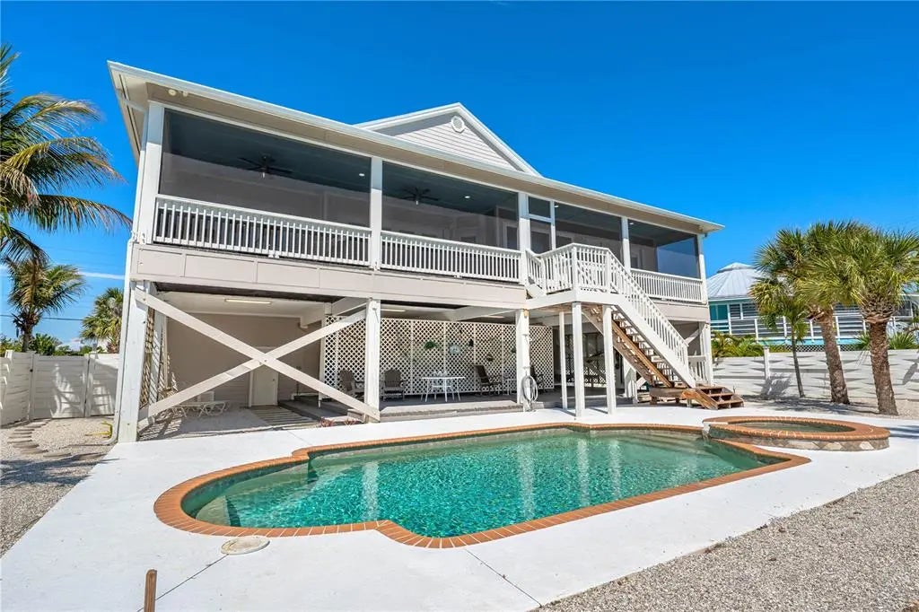 Private island living at its finest—where Old Florida charm, tranquil surroundings, and uncrowded beaches create a lifestyle that feels worlds away from the everyday. Accessible by a quick 5-minute ferry ride accommodating vehicles and running from early morning into the night, Palm/Don Pedro Island offers a rare sense of privacy and seclusion while remaining conveniently connected to the mainland. This elevated 3-bedroom, 3-bath waterfront home offers 2,391 square feet of living space, designed for comfortable, relaxed island living. Set along a peaceful lagoon with a boat lift and direct water access to the Gulf, the property invites kayaking through calm estuary waters and effortless beach days just a short walk or 5-minute golf cart ride away. Inside, soaring ceilings and an open living area create a bright, airy atmosphere, with expansive glass doors leading to a full-width screened rear porch that overlooks the pool and lagoon. The kitchen is centrally positioned with generous counter space, bar seating, and a sunny breakfast nook, complemented by a separate dining room and private den with solid French doors. A split-bedroom layout offers privacy, with a spacious primary suite featuring porch access, a large walk-in closet, and a bath with dual vanities, soaking tub, and separate shower. Guest accommodations include two well-positioned guest bedrooms on the opposite side of the home, one featuring a private ensuite bath with direct access to the porch and pool area, along with an additional guest bath serving the remaining guest bedroom. Outdoor living is a true highlight, with a sparkling pool overlooking the lagoon and an expansive covered and shaded poolside patio that provides a comfortable retreat from the afternoon sun. The patio includes an outdoor shower and offers ample space for entertaining, creating multiple areas designed for easy outdoor living. One of the property’s standout features is the oversized 1,512-square-foot garage with two garage doors, offering exceptional storage, a dedicated workshop area, and room for golf carts—ideal for navigating this golf-cart-friendly island community. Recent improvements include a 2021 roof, 2023 AC, and 2024 hurricane-impact windows, along with full James Hardie siding and exterior paint installed with stainless steel fasteners and fully weather-caulked for enhanced durability and water resistance. Storm shutters protect all doorways. Additional updates include dock boards (2025) and boat lift motors and controllers replaced (2025). Whether used as a full-time residence or seasonal retreat, this property offers a rare opportunity to experience the quiet beauty and relaxed pace of true island living. A virtual tour is available to provide additional perspective on the home and property.