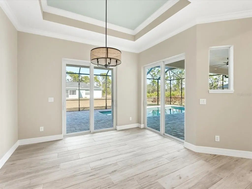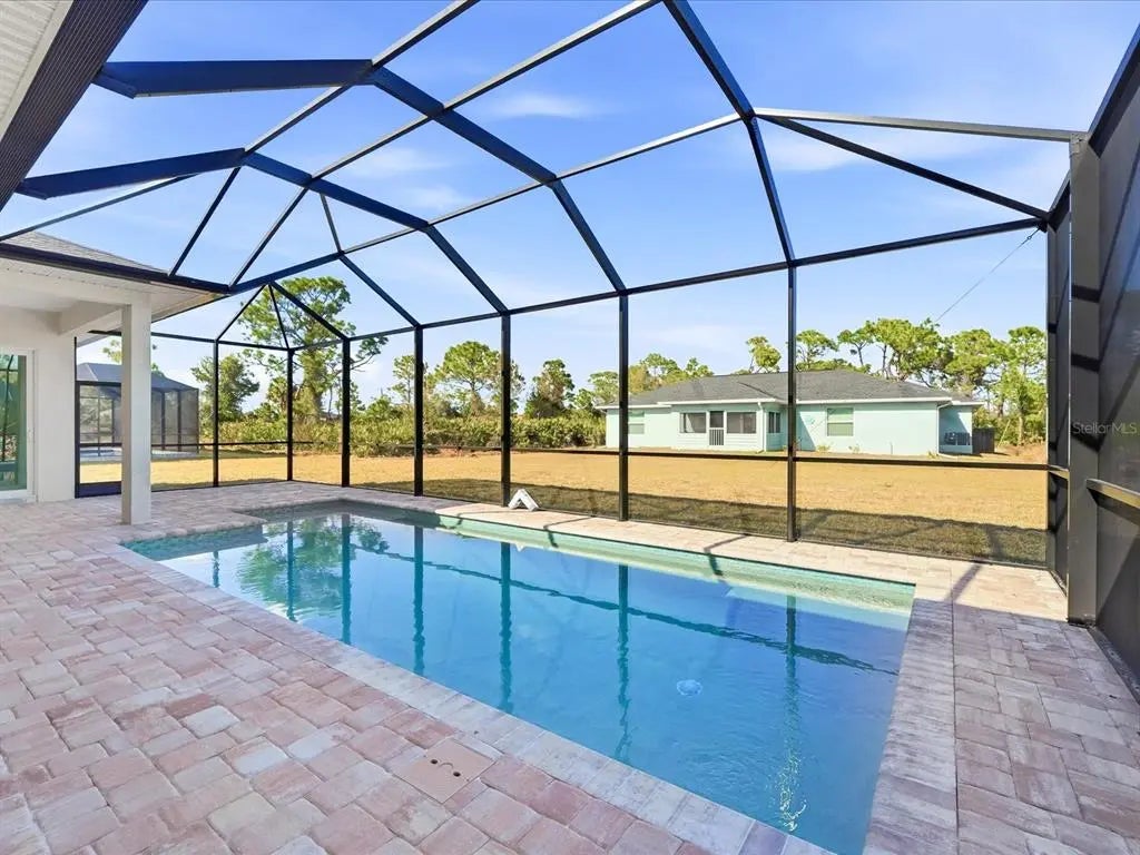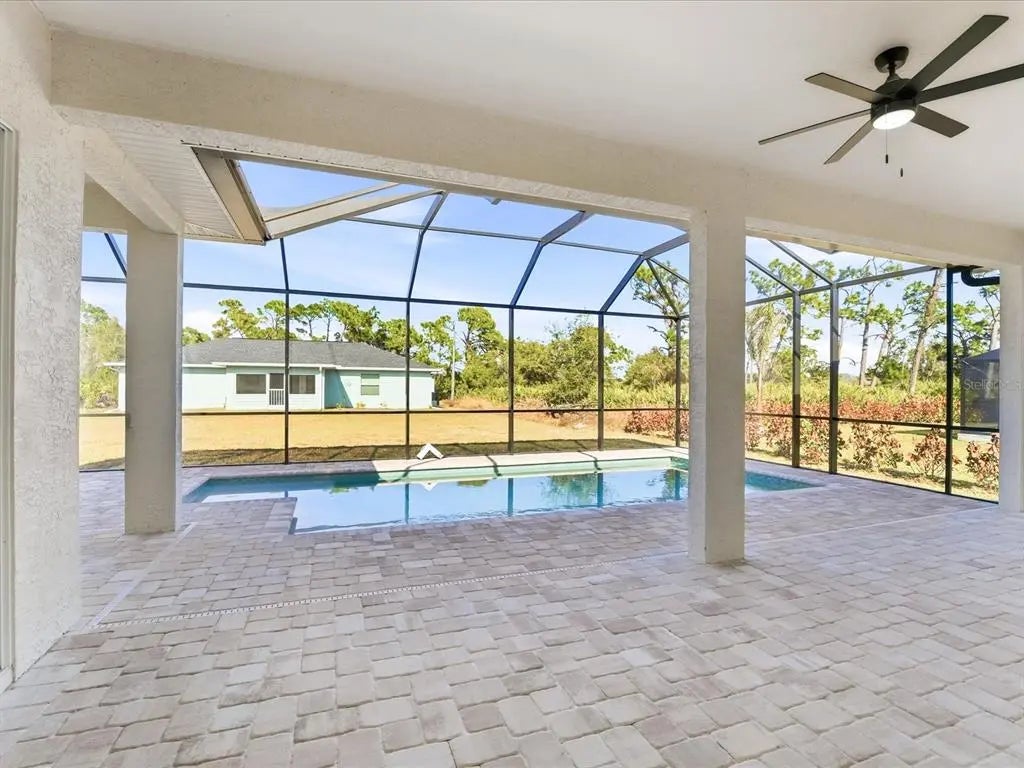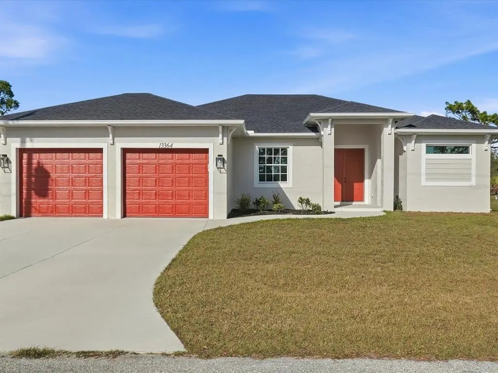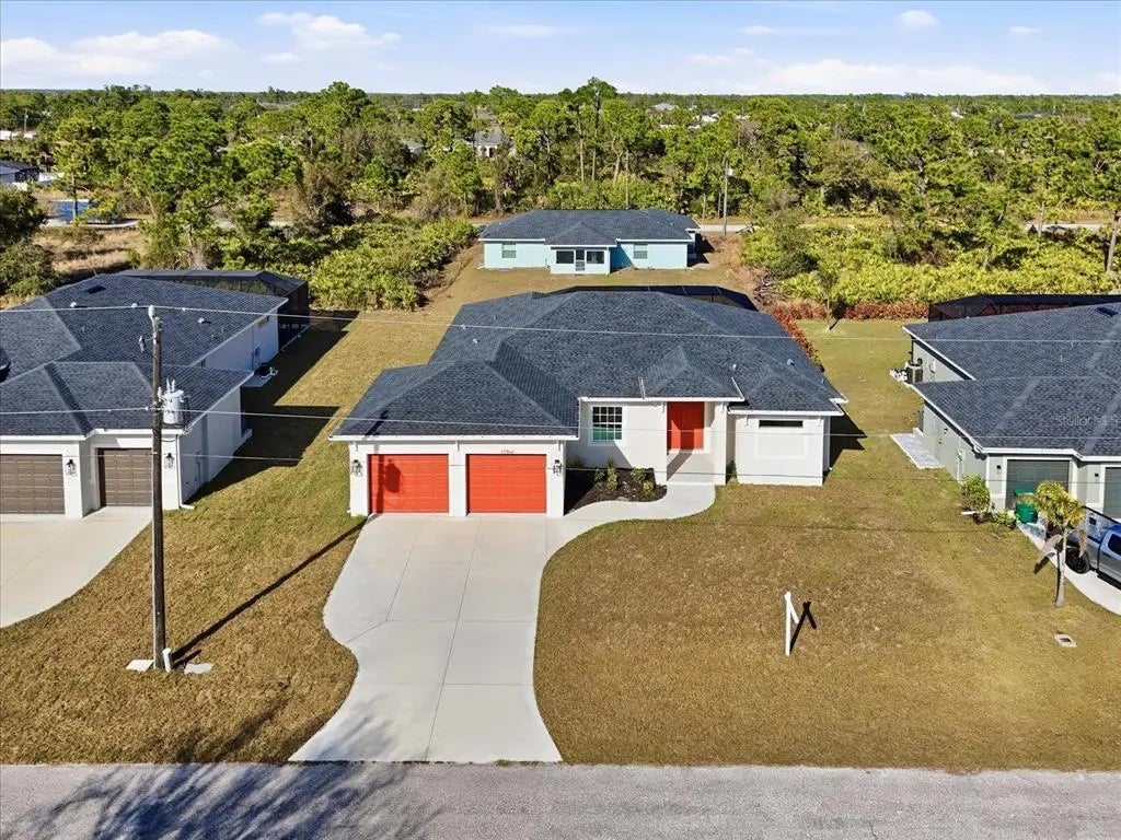 This BRAND-NEW home exudes quality craftsmanship, unmistakable from the moment you arrive in the coach-lite driveway and see the shiplap accented house with welcoming porch and double door entryway! Located in the highly desirable beach community of Englewood, this 3-bedroom, PLUS OFFICE, 2-bathroom, 2.5 car, exquisite home was built with no feature understated! The home boasts soaring volume ceilings and 8-foot doors throughout with the Living room having an immense tray ceiling full of recessed lighting, crown molding, a 6-foot ceiling fan, a 3-paneled sliding glass door connecting to the covered lanai area, providing a sunlit sanctuary. A separate dining area with its two sets of sliding glass door, provides ample room for any sideboard your table may have. Centrally located in this convenience driven designed open floorplan, the chef inspired kitchen with an incredible 9’ island, has TWO, 5’ PANTRIES, high-end Stainless-steel appliances, tile BACKSPLASH, solid wood, SOFT-CLOSE cabinetry, and is the hub for entertainment. Cabinetry has brushed nickel hardware and is topped in incredibly gorgeous veined, QUARTZ countertops. The split floorplan allows for owner privacy with the Primary Suite’s luxury including direct access to the lanai, tray ceiling, transom window to providing privacy along with natural lighting, two walk-in closets, an enormous, walk-in, tiled shower with two time saving shower heads, split vanities covered in luxury QUARTZ countertops, a private water closet, plus a linen closet. The home has a premium lighting package consisting of ceiling fans with lights, pendants over island, chandeliers in foyer and dining room, plus home has easy to upkeep & maintain allergen-free, porcelain plank flooring throughout. Interior Designer’s top pick for 2025 is showcased…shiplap accents on the kitchen island, Living Room & foyer wall. Let’s not forget to mention something you never have to think about, the convenient HURRICANE IMPACT WINDOWS AND SLIDING GLASS DOORS, providing peace of mind especially when you’re out of town. Outside you’ll find TWO LANAIS, one is an incredible 30’ long, and the other is a lovely oasis for your rear bedroom guests! The oversized 25’x22’, 579 square foot 2.5-car garage boasts two 10-foot hurricane rated overhead doors instead of a standard single 16-foot, providing so much more extra parking space between vehicles, plus garage has a handy side yard exterior door for convenience. With no HOA, you can utilize your investment as you see fit…live here yourself, rent it out annually, seasonally, or AirBNB it. Home is 100% Hurricane protected, and constructed by a Floridian builder who knows what has to be built in Southwest Florida for longevity and durability...hip roof design for long-term discounted insurance rates, off-ridge roof venting so peaks won't blow away, and STEM WALL construction which far exceeds monolithic slabs as sand can wash away but not cement blocks! This property is advantageously located near a golfing community, minutes to the beach, marinas, and boat launches. At nearly 2100 square feet under air, this custom designed home feels much bigger with its volume ceilings and is the perfect size for your needs in paradise! This a gem is priced to sell, is waiting for you, so call today for your private tour.