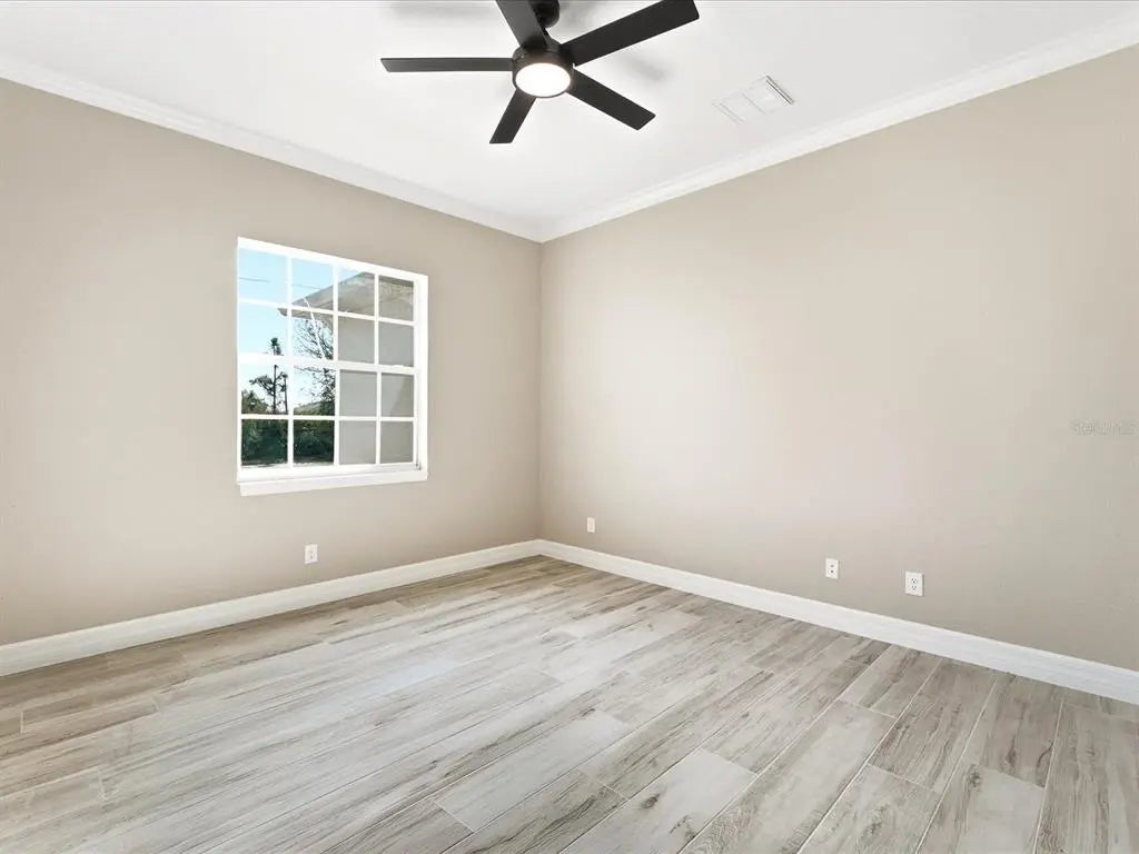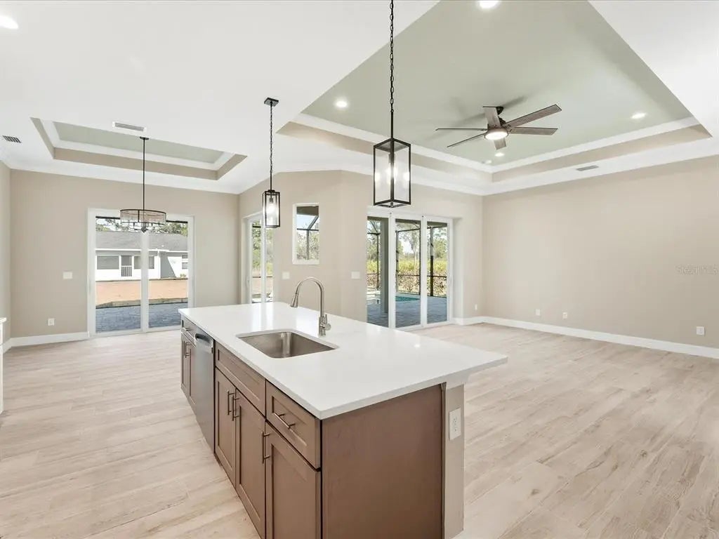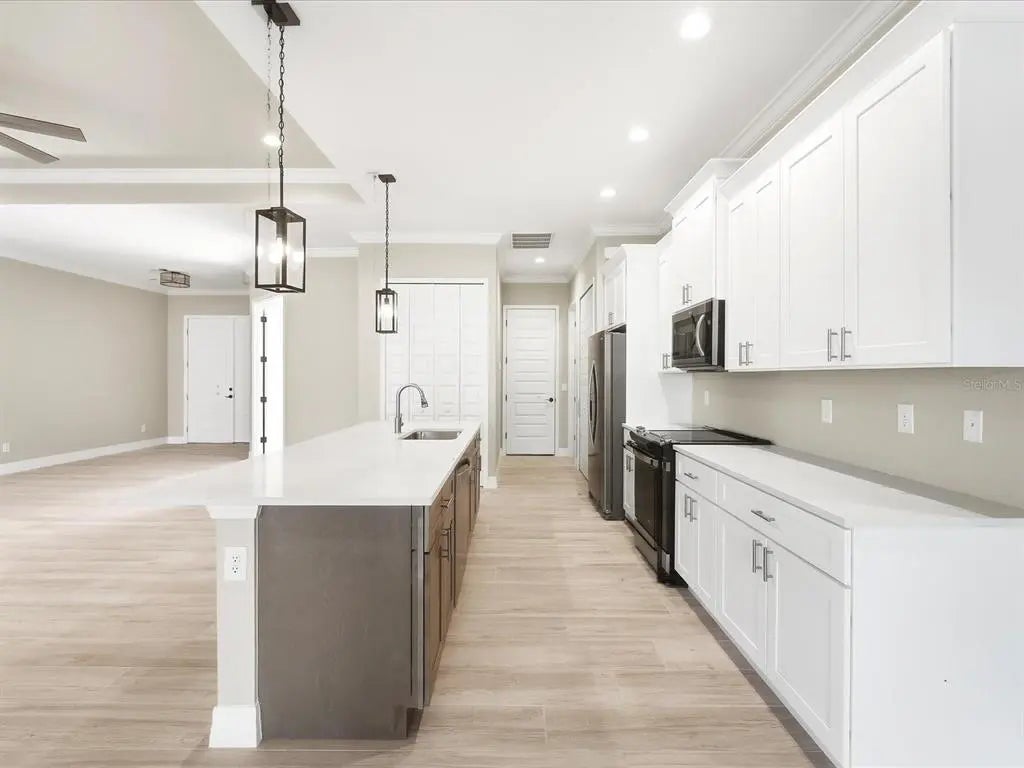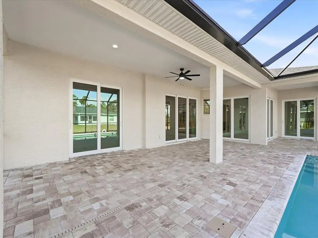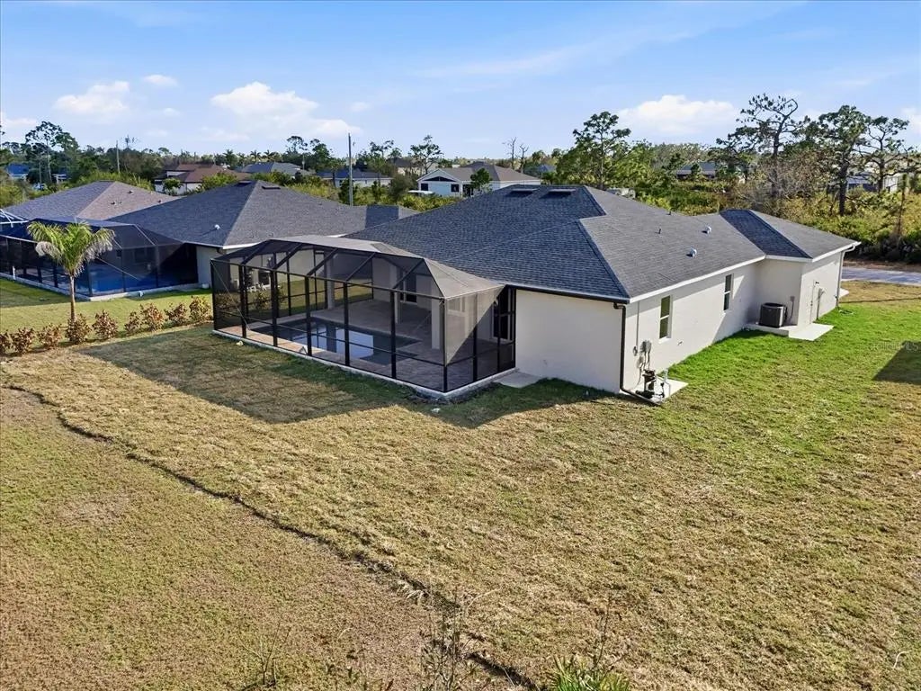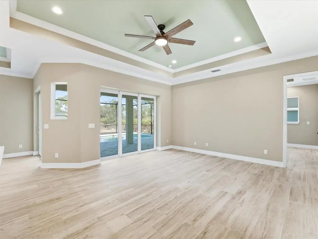 This BRAND-NEW home exudes quality craftsmanship, unmistakable from the moment you arrive in the coach-lite driveway and see the shiplap accented house with welcoming porch and double door entryway! Located in the highly desirable beach community of Englewood, this 3-bedroom, PLUS OFFICE, 2-bathroom, 2.5 car, exquisite home was built with no feature understated! The home boasts soaring volume ceilings and 8-foot doors throughout with the Living room having an immense tray ceiling full of recessed lighting, crown molding, a 6-foot ceiling fan, a 3-paneled sliding glass door connecting to the covered lanai area, providing a sunlit sanctuary. A separate dining area with its two sets of sliding glass door, provides ample room for any sideboard your table may have. Centrally located in this convenience driven designed open floorplan, the chef inspired kitchen with an incredible 9’ island, has TWO, 5’ PANTRIES, high-end Stainless-steel appliances, tile BACKSPLASH, solid wood, SOFT-CLOSE cabinetry, and is the hub for entertainment. Cabinetry has brushed nickel hardware and is topped in incredibly gorgeous veined, QUARTZ countertops. The split floorplan allows for owner privacy with the Primary Suite’s luxury including direct access to the lanai, tray ceiling, transom window to providing privacy along with natural lighting, two walk-in closets, an enormous, walk-in, tiled shower with two time saving shower heads, split vanities covered in luxury QUARTZ countertops, a private water closet, plus a linen closet. The home has a premium lighting package consisting of ceiling fans with lights, pendants over island, chandeliers in foyer and dining room, plus home has easy to upkeep & maintain allergen-free, porcelain plank flooring throughout. Interior Designer’s top pick for 2025 is showcased…shiplap accents on the kitchen island, Living Room & foyer wall. Let’s not forget to mention something you never have to think about, the convenient HURRICANE IMPACT WINDOWS AND SLIDING GLASS DOORS, providing peace of mind especially when you’re out of town. Outside you’ll find TWO LANAIS, one is an incredible 30’ long, and the other is a lovely oasis for your rear bedroom guests! The oversized 25’x22’, 579 square foot 2.5-car garage boasts two 10-foot hurricane rated overhead doors instead of a standard single 16-foot, providing so much more extra parking space between vehicles, plus garage has a handy side yard exterior door for convenience. With no HOA, you can utilize your investment as you see fit…live here yourself, rent it out annually, seasonally, or AirBNB it. Home is 100% Hurricane protected, and constructed by a Floridian builder who knows what has to be built in Southwest Florida for longevity and durability...hip roof design for long-term discounted insurance rates, off-ridge roof venting so peaks won't blow away, and STEM WALL construction which far exceeds monolithic slabs as sand can wash away but not cement blocks! This property is advantageously located near a golfing community, minutes to the beach, marinas, and boat launches. At nearly 2100 square feet under air, this custom designed home feels much bigger with its volume ceilings and is the perfect size for your needs in paradise! This a gem is priced to sell, is waiting for you, so call today for your private tour.
