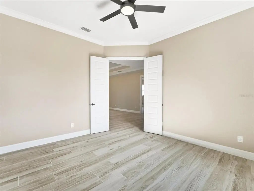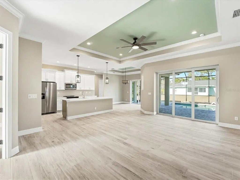 - Interior FeaturesCeiling Fan(s), Coffered Ceiling(s), Crown Molding, High Ceilings, Living Room/Dining Room Combo, Open Floorplan, Primary Bedroom Main Floor, Solid Wood Cabinets, Stone Counters, Thermostat, Tray Ceiling(s)