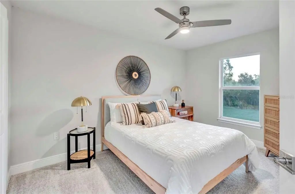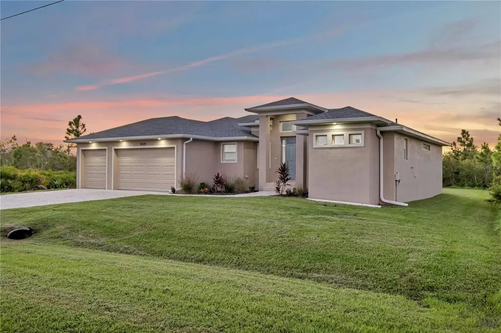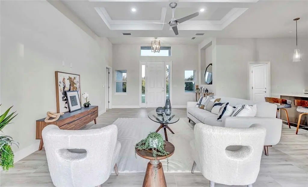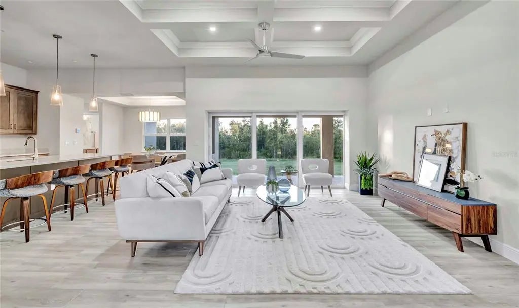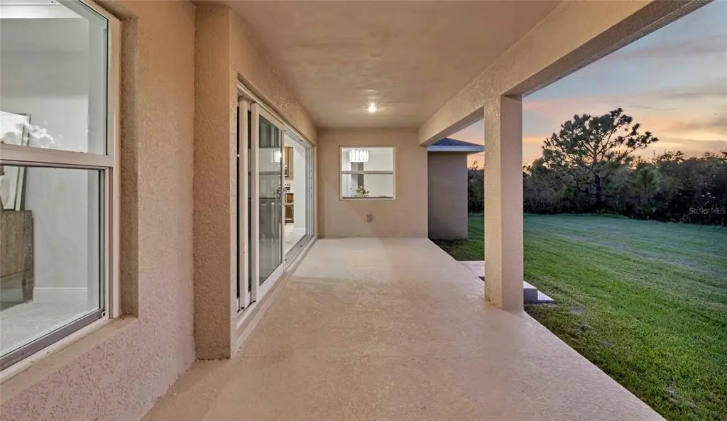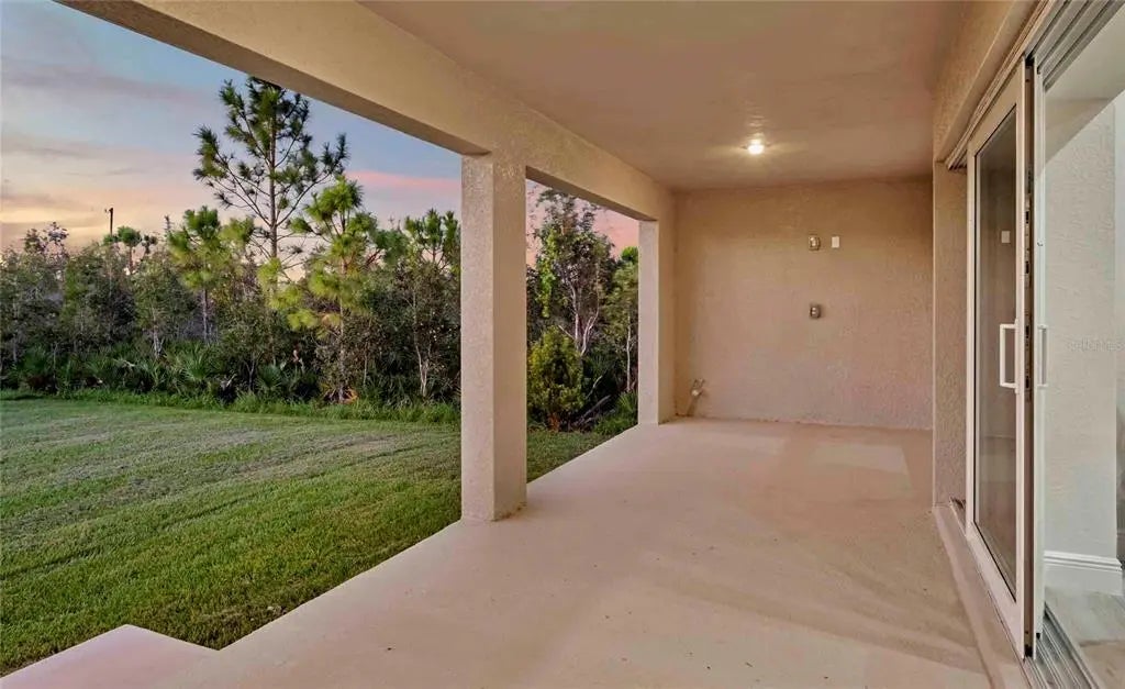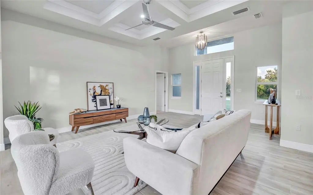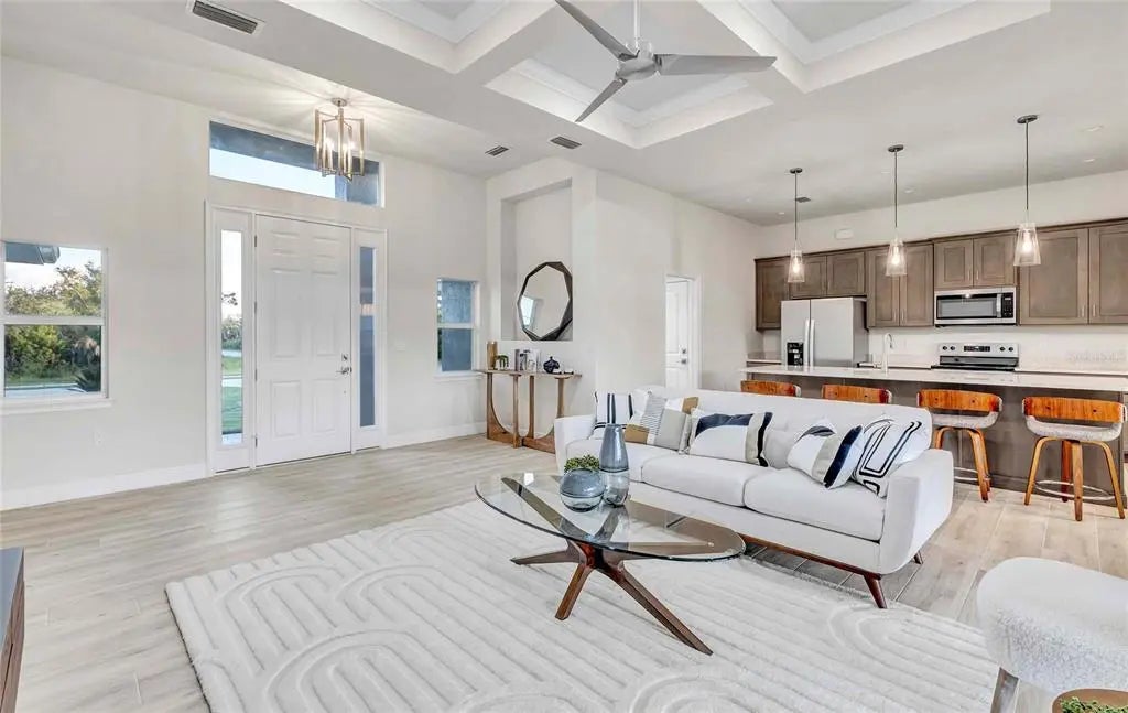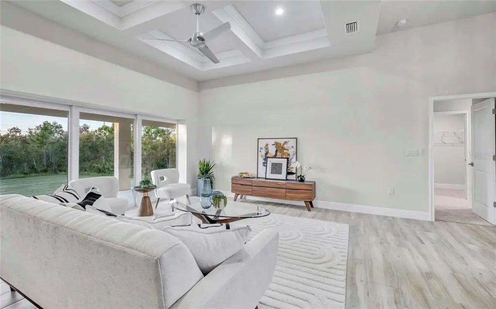 Brand New Move-In Ready Home! Introducing the Turnberry DX model by the award-winning Harbor Home Builders. This beautifully crafted 3-bedroom, 2-bathroom, 3-car garage home welcomes you with a grand 12-foot entryway and elegant coffered ceilings. Enjoy luxury finishes throughout, including impact windows, porcelain plank flooring, solid wood cabinetry with soft-close doors and drawers, quartz countertops, and designer lighting and fans. The spacious primary suite features a tray ceiling with ambient lighting, a transom window, a generous walk-in closet, and an additional storage closet. The primary bath offers dual vanities and a stunning tiled walk-in shower. Step outside to the expansive 27' x 9' lanai, complete with an entertainment wall featuring electrical outlets and provisions for an outdoor kitchen — perfect for relaxing or entertaining. Don’t miss your chance to own this exceptional new home. Schedule your private showing today!