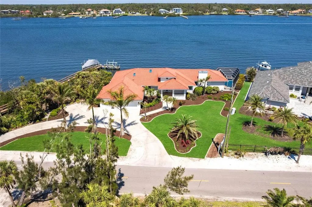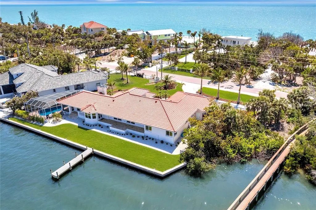 Welcome to 8115 Manasota Key Road—an extraordinary waterfront estate where refined luxury and coastal living converge. Perfectly situated on Lemon Bay with the beach directly across the street, this one-of-a-kind property offers an unmatched lifestyle—sunrise mornings on the bay, sunset walks on the beach, and effortless access to boating, dining, and everything this exclusive island has to offer. From the moment you enter, you're greeted by a grand foyer that sets the tone for the rest of the home. Soaring ceilings and a stunning wood-burning fireplace anchor the expansive living space, creating a warm yet elegant atmosphere. The open-concept layout flows seamlessly into the heart of the home—a spacious, thoughtfully designed kitchen with ample counter space, beautiful cabinetry, and a layout that invites both daily living and upscale entertaining. Nearly every room captures a breathtaking view of the water, bathing the interiors in natural light and offering a constant reminder of the peaceful waterfront setting. With 5 bedrooms—including two luxurious en-suites—2 guest bedrooms, a spacious office plus a formal dining room and a charming breakfast nook, there’s plenty of space to host friends and family. The indoor-outdoor connection is truly exceptional. Step outside to a newly resurfaced, pool surrounded by a private screened-in lanai, where you can relax, entertain, and take in the panoramic water views of Lemon Bay. Whether you're watching dolphins play, casting a line from your dock, or just enjoying the poolside, every moment feels like vacation. The home also features a 156-foot concrete seawall with private dock, providing direct boating access to the Intracoastal and quick trips to Stump Pass and the Gulf of America. Additional upgrades include new wide-plank floors, hurricane-rated windows and doors, fresh interior and exterior paint, a 2022 concrete tile roof, and professional landscaping by Hazeltine. The oversized three-car garage and spacious circular driveway complete this exceptional house. Whether you’re looking for a luxurious retreat or a show-stopping entertaining home, 8115 Manasota Key Road delivers on every level. Schedule your private showing today and experience the coastal lifestyle at its finest.