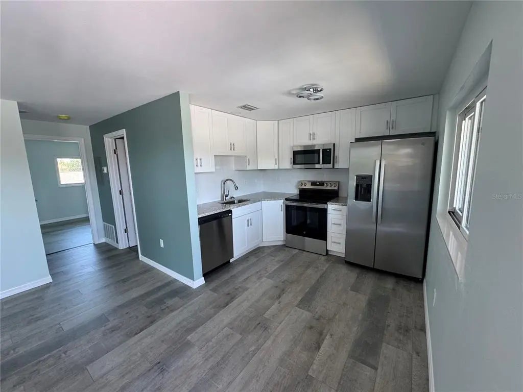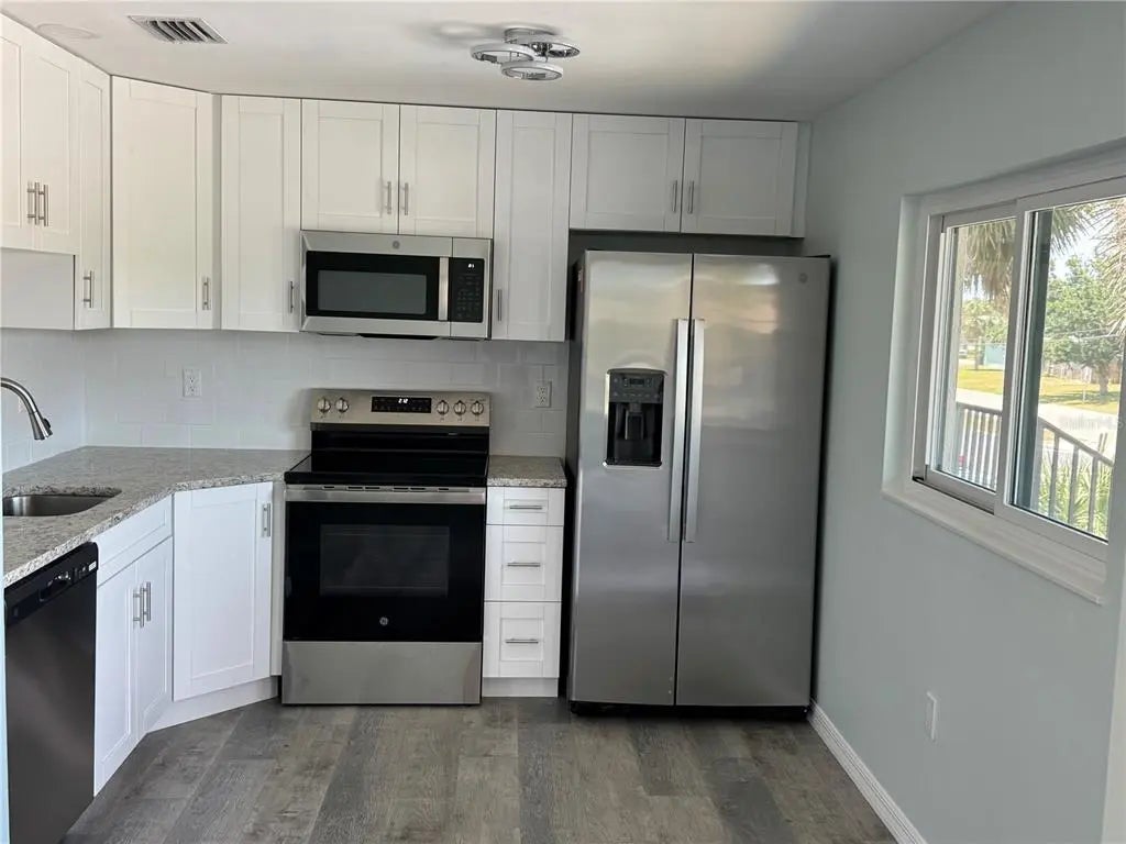 Fully Renovated condominium just 5 Minutes from the Beach! This beautiful unit located only a 5-minute from the beach and is surrounded by everything you need—shops, banks, and restaurants are all just around the corner. Property Highlights: Fully Restored After Hurricane Ian. The renovation was completed by a licensed general contractor. All plumbing drainpipes and connections were replaced, along with the main electrical wiring and panel to meet current code requirements. New Installations: New AC ductwork, Ceiling R-30 and wall R-5 insulation, Hurricane-proof windows, Reinforced floor screeds with premium 12mm waterproof laminate throughout Modern Finishes: Freshly painted walls with a modern color scheme, wooden cabinets in the kitchen and bathroom, Granite kitchen countertop, Stainless steel appliances, Fully renovated bathroom with a new bathtub and tile up to the ceiling Comfort and Efficiency: Modern LED lighting, Ceiling fans with remote control in each bedroom, Brand new 30-gallon water heater. All work has been completed in compliance with current building codes and comes with a guarantee. Don’t miss this opportunity to own a stylish, move-in ready apartment in a prime location near the beach! There is ample parking to include commercial vehicles in back parking lot. You can even have a DOG up to 45lbs as long as it's not higher than 15" high!