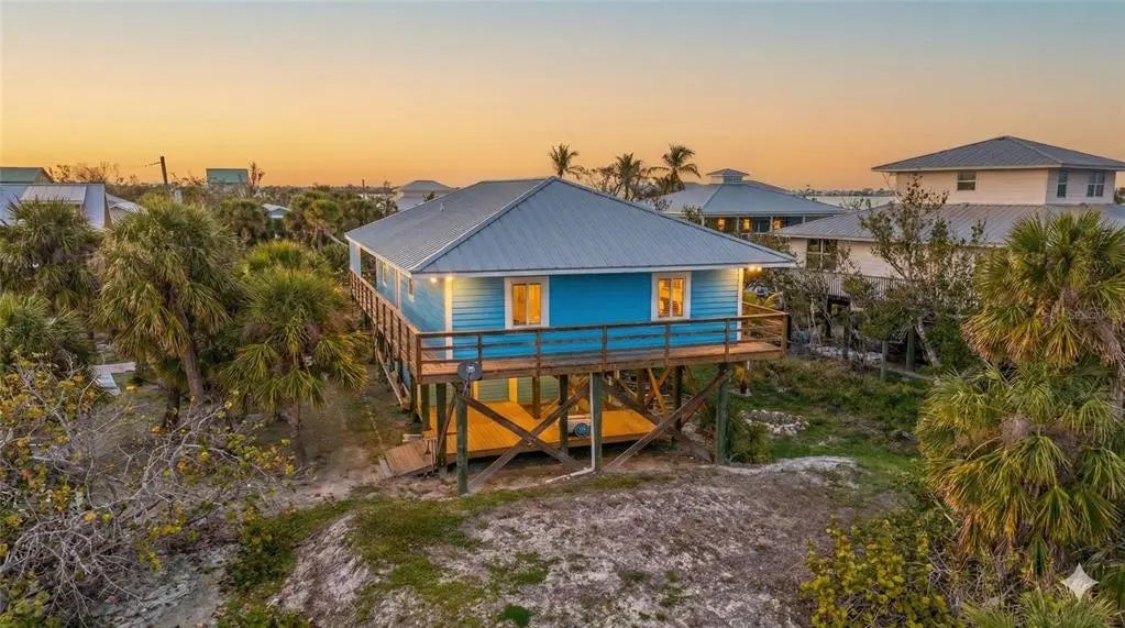 Your Island Paradise Awaits on Little Gasparilla Island Step into your dream beachside retreat! This stunning property at 9390 Little Gasparilla Island, Placida, Florida, is an oasis designed for those who cherish island living. Built in 1998 and featuring 1,400 square feet of inviting indoor-outdoor living space, this three-bedroom, two-bathroom gem is perfect for families, snowbirds, or anyone longing for a vacation lifestyle. The home's coastal charm starts at its striking blue exterior, elevated on stilts. The full wrap-around deck provides breathtaking views of the lush landscape and easy access to the natural beauty surrounding you. With a ceiling design that artfully combines style and function, the back porch is equipped with two ceiling fans, ensuring your comfort while you soak in the stunning views. Venture inside to a sleek, open-concept for living and kitchen area. The vaulted ceilings and soft gray tones create an airy, welcoming atmosphere. The heart of the home is a beautifully appointed kitchen featuring granite countertops, a large island offering additional storage, and country-style sink that adds rustic charm. Stainless steel appliances and soft-close drawers complete the modern look, ensuring every meal is a delight to prepare. In the living area, you’ll find large windows with blinds to control the flood of natural light cascading through. Together with elegant flooring, they provide a seamless transition from relaxing indoors to the world outside. This space isn't just about aesthetics; it's designed for practical, modern living, with a digital thermostat ensuring your comfort year-round. As you explore further, you'll notice thoughtful touches such as the exquisite showers and high-quality granite vanities in both the guest and master bathrooms. Ceiling fans in every bedroom enhance comfort while adding to the refined elegance of the home. Step outside the sliding glass doors, and you'll be transported to your private outdoor paradise. The deck, with its natural wood planking, invites you to unwind, entertain, or enjoy al fresco dining under the stars while ceiling fans maintain a gentle breeze. This prime location offers easy access to the best of what the area has to offer—unparalleled fishing in Charlotte Harbor and the Gulf, and miles of sandy beach to explore. With a short walk to both the beach and community dock, the opportunities for adventure are endless. Whether swimming, fishing, biking, kayaking, or boating are your passions, Little Gasparilla Island provides the ultimate lifestyle backdrop. Set a mere 10 minutes from the mainland marina, getting here is a breeze, making it the perfect escape for those who crave a balance of island seclusion and modern convenience. Don’t miss your chance to own a slice of paradise, where every day feels like a vacation. This is the best value on the island—and it’s waiting for you.