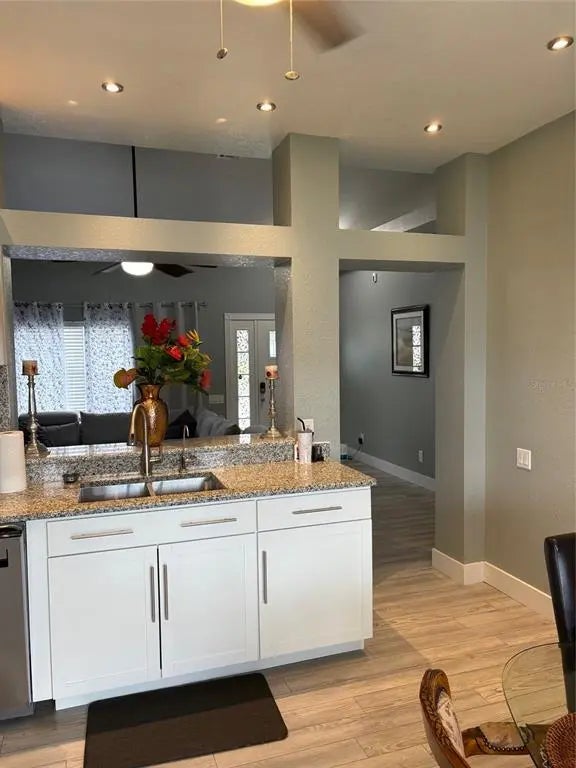 - Interior FeaturesCathedral Ceiling(s), Ceiling Fan(s), High Ceilings, Stone Counters, Vaulted Ceiling(s), Window Treatments