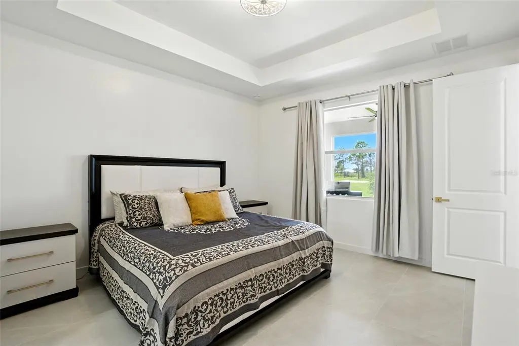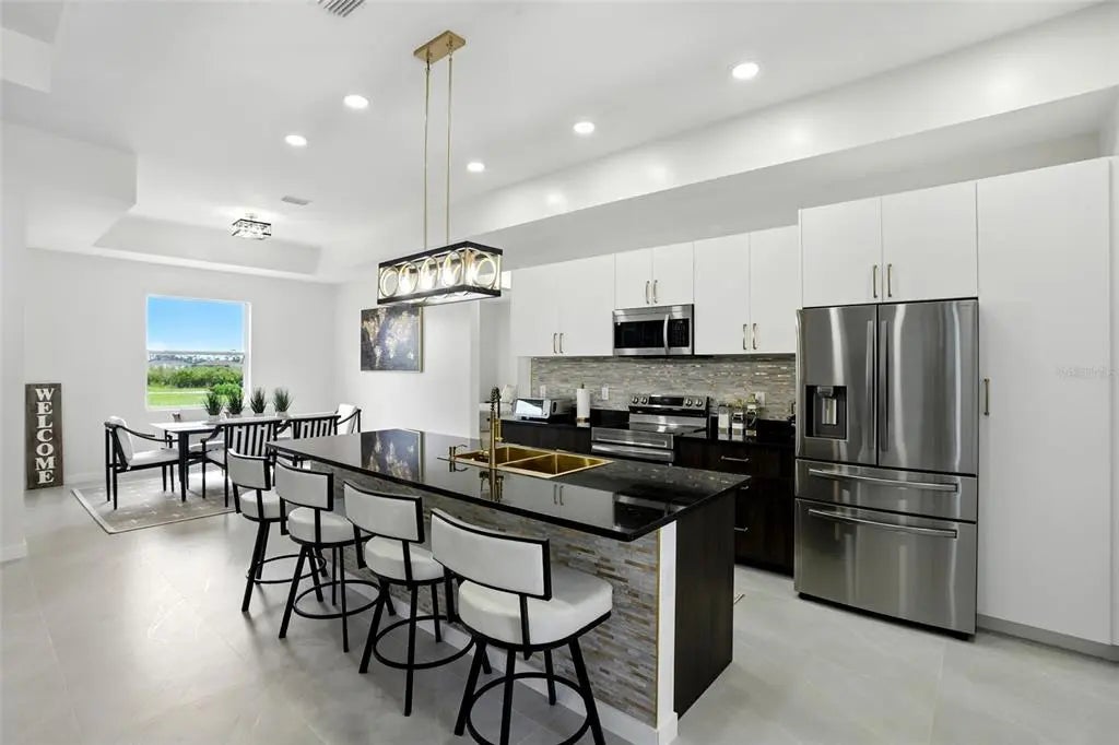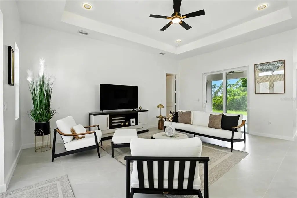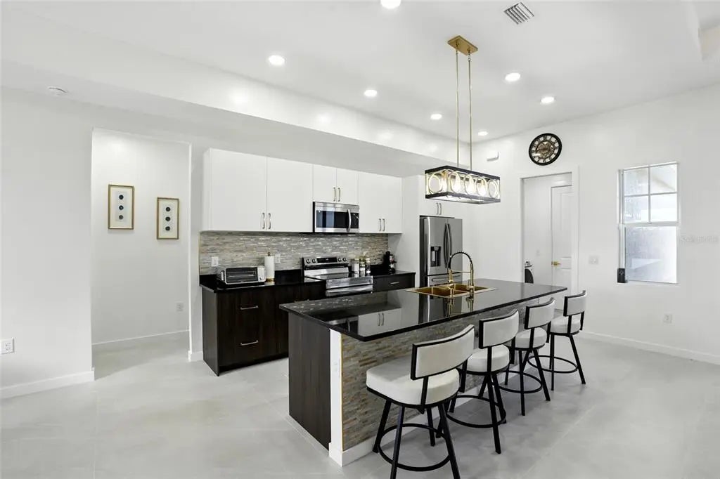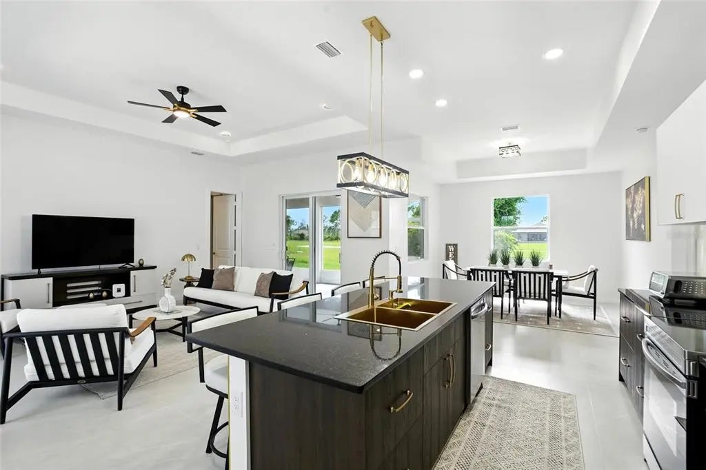 Welcome to your brand-new 3-bedroom, 2-bath home located in the desirable Rotonda Sands subdivision. This beautifully designed residence features a covered double-door entry leading into an open floor plan with tile flooring throughout, tray ceilings, and an abundance of natural light. The eat-in kitchen shines with a center island adorned with a tile accent, stainless steel appliances, backsplash, modern light fixtures, and luxurious gold finishes including a gold sink and cabinet handles. The kitchen opens up to a spacious dining area, equipped with large window. This open concept living area leads directly out to a covered, screened-in lanai—perfect for indoor-outdoor living. The primary suite offers a tranquil retreat with a spa-like bathroom that includes a large standing shower with modern tile and wood paneling, double vanity with gold fixtures, and a custom walk-in closet with built-ins. Additional features include a separate laundry room, hurricane-impact windows, and a lush backyard space. Rotonda Sands is a peaceful, deed-restricted community with scenic walking areas, lakes, canals, and greenbelts, located near Boca Grande and Englewood beaches, top-rated golf courses, and the Cape Haze Pioneer Trail. With low HOA fees and a serene, well-maintained setting, this home combines modern elegance with Florida’s laid-back lifestyle. You don’t want to miss this one!
