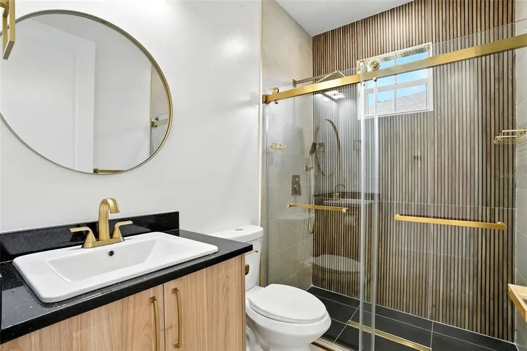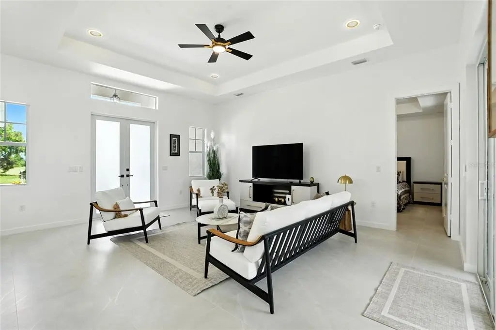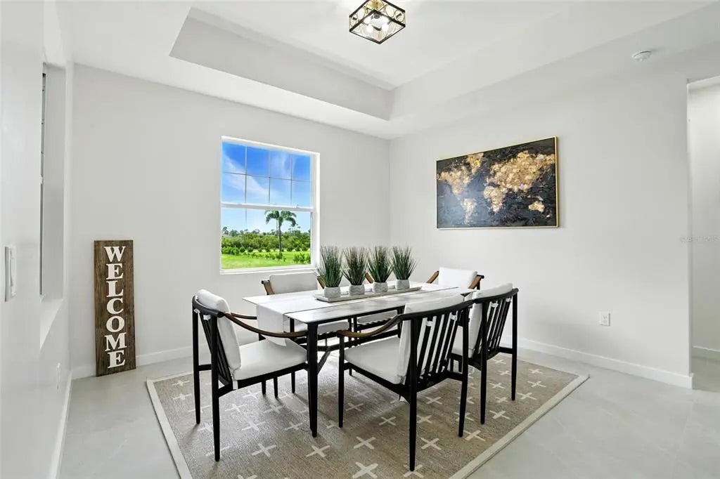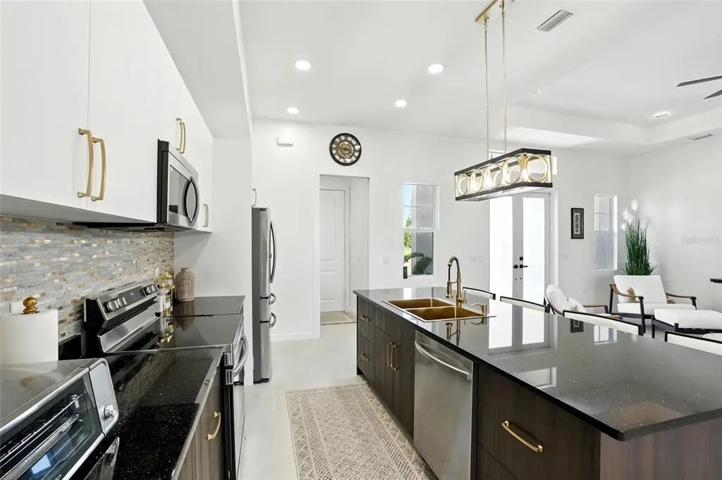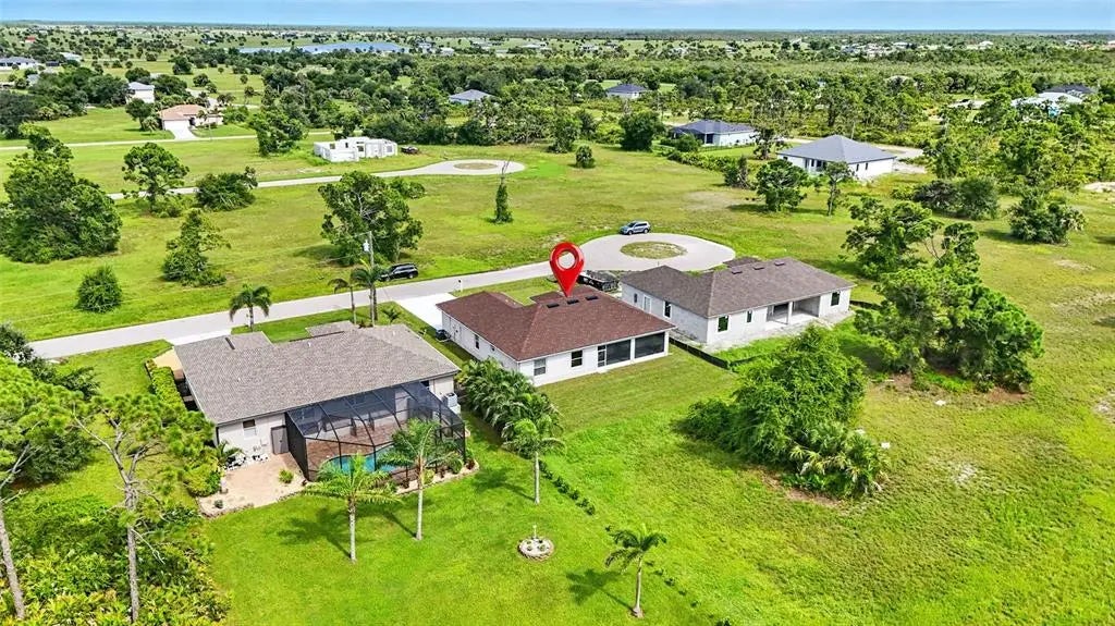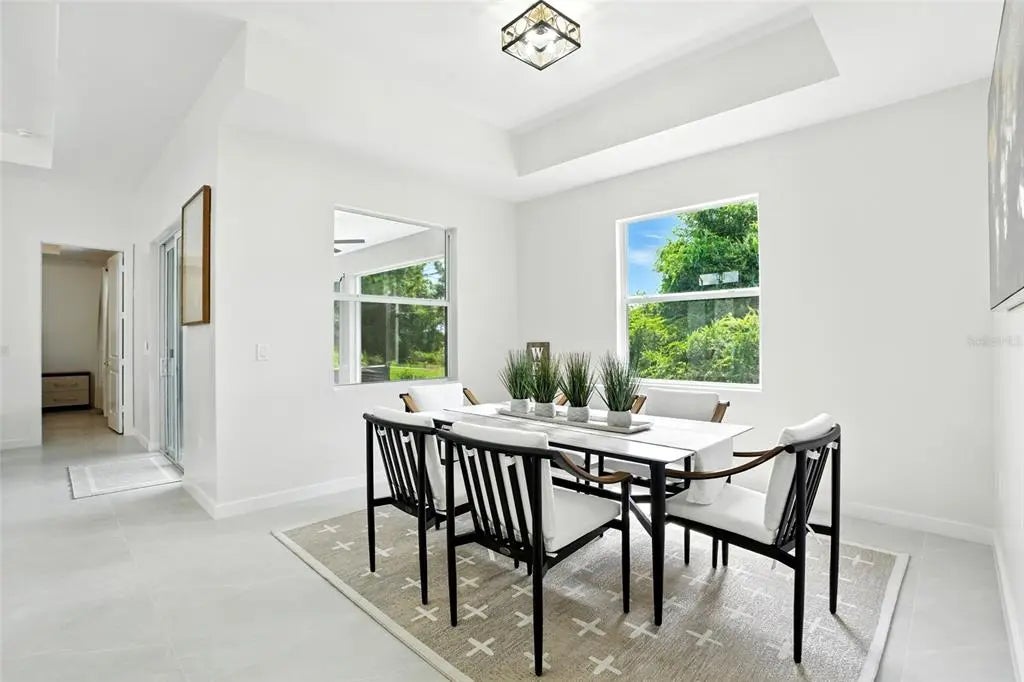 Welcome to your brand-new 3-bedroom, 2-bath home located in the desirable Rotonda Sands subdivision. This beautifully designed residence features a covered double-door entry leading into an open floor plan with tile flooring throughout, tray ceilings, and an abundance of natural light. The eat-in kitchen shines with a center island adorned with a tile accent, stainless steel appliances, backsplash, modern light fixtures, and luxurious gold finishes including a gold sink and cabinet handles. The kitchen opens up to a spacious dining area, equipped with large window. This open concept living area leads directly out to a covered, screened-in lanai—perfect for indoor-outdoor living. The primary suite offers a tranquil retreat with a spa-like bathroom that includes a large standing shower with modern tile and wood paneling, double vanity with gold fixtures, and a custom walk-in closet with built-ins. Additional features include a separate laundry room, hurricane-impact windows, and a lush backyard space. Rotonda Sands is a peaceful, deed-restricted community with scenic walking areas, lakes, canals, and greenbelts, located near Boca Grande and Englewood beaches, top-rated golf courses, and the Cape Haze Pioneer Trail. With low HOA fees and a serene, well-maintained setting, this home combines modern elegance with Florida’s laid-back lifestyle. You don’t want to miss this one!
