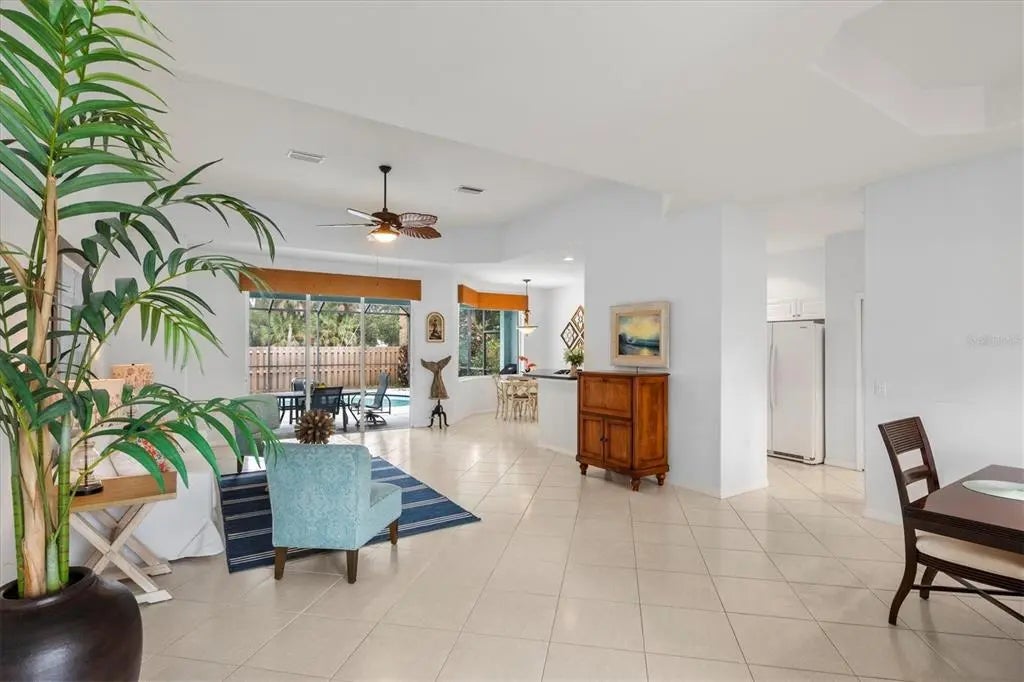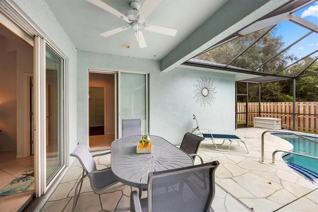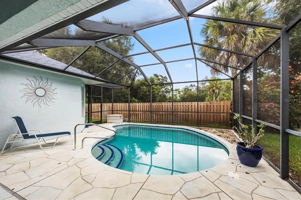 One or more photo(s) has been virtually staged. Relax, entertain, and enjoy it all! This 3-bedroom, 2-bath pool home is beautifully designed and ready to fit your lifestyle offering the perfect balance of indoor and outdoor living. From the charming front porch and double-door entry, step inside to a spacious open-concept layout with volume ceilings, abundant natural light, and a thoughtful split-bedroom design. The living room flows seamlessly to the lanai through oversized sliders, while the formal dining room boasts a tray ceiling that adds elegance to every gathering. The kitchen is a true centerpiece, featuring a breakfast bar, a built-in desk, a large pantry, and a breakfast nook framed by an aquarium window overlooking the sparkling pool. Ceramic tile flooring extends through the main living areas for easy maintenance and timeless appeal. The primary suite offers a generous 19x14 bedroom with tray ceiling, walk-in closet, and a spacious bath with dual sinks, a walk-in shower, and private slider access to the pool. Guests will enjoy their own wing with two additional bedrooms and a full bath, ensuring comfort and privacy. Beyond the living spaces you’ll appreciate the large laundry room with storage and folding counter, plus an oversized 2+ car garage with a dedicated 13x10 workshop/storage area, pull-down attic stairs, and drop-down shelving. Step outside to your private backyard oasis, complete with a screened lanai and a sparkling pool. It’s the perfect area for lounging or entertaining. The fenced yard provides peace of mind and added privacy. Recent updates add confidence with a brand-new roof (June 2025), new pool pump, 2024 hot water heater, and 2024 pool cage screens. Low HOA fee of just $889 per year (covering irrigation) and no CDD fee make this home affordable and stress-free. All of this in a prime Venice location, just minutes from Downtown Venice, Gulf beaches, golf courses, shopping, dining, and entertainment. Plus, it’s not located in a flood zone. This home checks every box: style, space, updates, and location. Don’t miss the opportunity to make it yours!