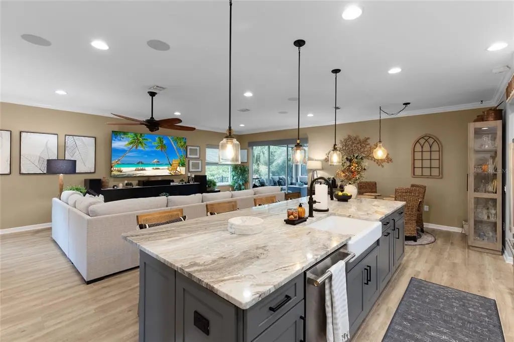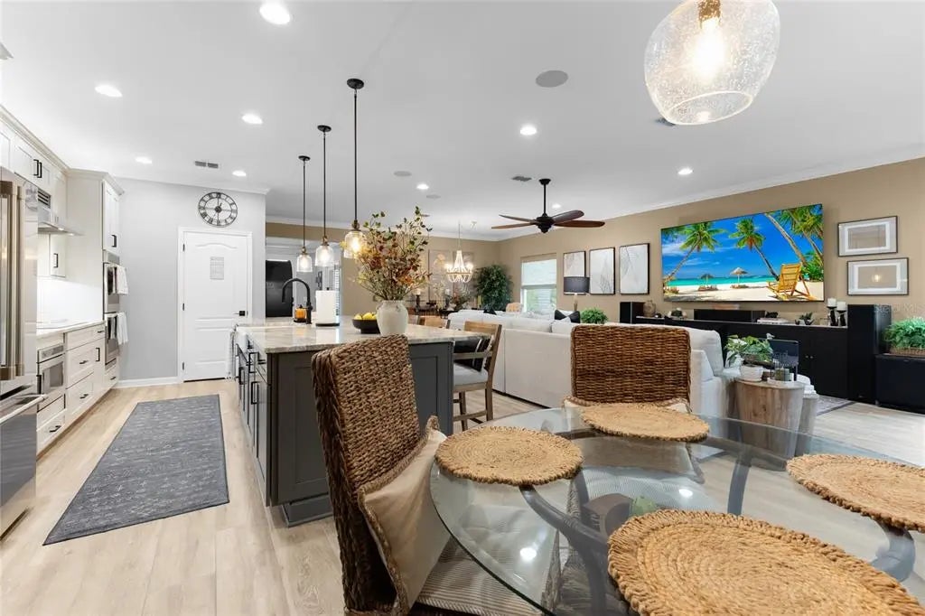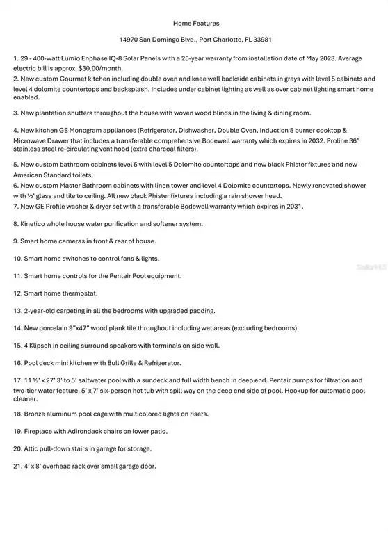 Welcome to this fully remodeled 4-bedroom, 3-bathroom plus den, 3-car garage pool home, perfectly situated in the coveted Section 93 of South Gulf Cove—one of Southwest Florida’s most desirable waterfront communities. Designed for those seeking both elegance and ease, this home offers 55 miles of navigable canals with access to Charlotte Harbor and the Gulf of Mexico, optional HOA, community boat ramps, parks, and a friendly neighborhood feel, all just minutes from Boca Grande, Englewood Beach, and Manasota Key. The gourmet kitchen is a chef’s dream with level 5 cabinetry, dolomite countertops and backsplash, GE Monogram appliances with transferable warranties, induction cooktop, microwave drawer, double oven, Proline vent hood, and smart under/over-cabinet lighting. The owner’s suite features custom cabinetry, dolomite counters, a linen tower, walk-in closets with custom built-outs, and a spa-inspired shower with rain head, glass enclosure, and sleek black fixtures. Interior upgrades include plantation shutters, woven wood blinds, porcelain plank tile, upgraded carpet, Klipsch surround sound, GE Profile washer and dryer with warranty, whole-house Kinetico water purification, and full smart-home integration controlling lighting, fans, thermostat, pool equipment, and cameras. Outdoors, the screened paver lanai offers a resort-style retreat with outdoor bar, Bull grill, refrigerator, fire pit, saltwater pool with sundeck, waterfall, full-width bench, six-person spa with spillway, LED riser lighting, fenced yard, and a bronze aluminum cage—all smartphone controlled. Additional highlights include attic storage, a garage overhead rack, equipped with a dedicated generator hookup and safety interlock, ensuring seamless power backup without the risk of backfeeding, transferrable flood insurance, and 29 Enphase IQ-8 solar panels installed in 2023 that will be paid off at closing, keeping the average electric bill at just $30 per month. Please note: garage cabinets and slat wall do not convey. With world-class boating, fishing, golf courses, shopping, dining, and pristine beaches nearby, this home offers the ultimate Florida lifestyle in a premier location. NOTE: The SGC HOA is voluntary. Even if the previous owner was a member, the new owner has no obligation to join. Be aware, however, that everyone must comply with the community deed restrictions, even non-members.
