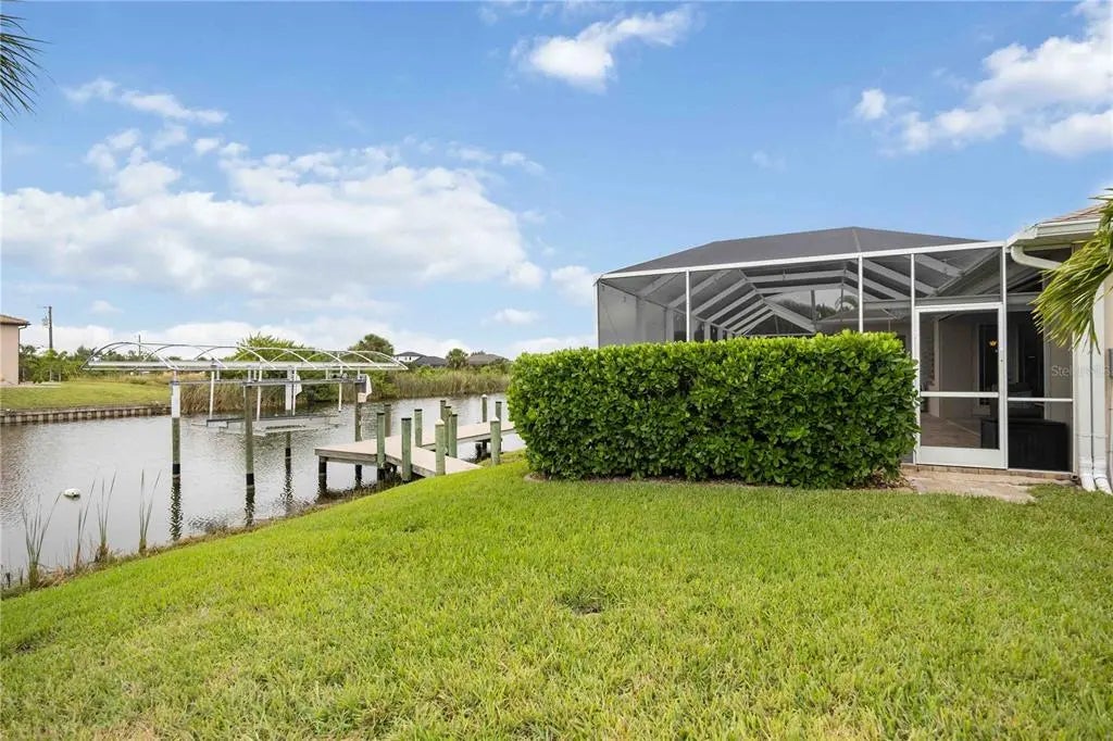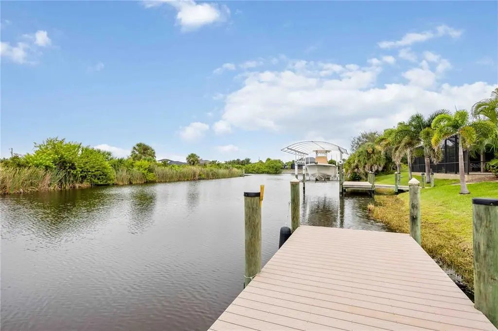 $50,000 PRICE REDUCTION! Rare opportunity to own a double waterfront lot with 168 feet of canal frontage and a former builder model pool home in the highly desirable South Gulf Cove. This beautifully maintained 3-bedroom + den residence offers exceptional privacy, spectacular water views, and stunning Southwest Florida sunsets. Enter through elegant double glass doors into a bright, open floor plan featuring porcelain tile throughout, tray ceilings, and plantation shutters on impact windows and doors. The great room, primary suite, guest bedroom, and breakfast nook all open through triple sliders and French doors to the expansive paver lanai with a heated pool and spa, creating seamless indoor-outdoor living that’s perfect for relaxing or entertaining. The gourmet kitchen showcases stainless steel appliances, solid wood cabinetry with pantry, rollout shelving in all kitchen and bathroom cabinets, and a striking 10-foot Quartz island with sink. A private den with double doors provides the ideal home office or hobby space. The spacious primary suite offers tranquil water views and features a walk-in closet, dual granite vanities, a soaking tub, and a tiled Roman shower. Boaters will appreciate the 30-ft dock (2020) with a 7,000-lb covered boat lift, along with electric hurricane roll-down shutters and screens (2023) and a large pool deck designed for enjoying the waterfront lifestyle. The home is wired for a generator, with a portable Generex generator available separately. Numerous recent upgrades provide peace of mind, including a new 50-circuit electrical panel with surge protection (2025), new blown-in insulation (2024), new hot water heater (2024), exterior paint (2023), and a new irrigation pump (2022). The adjoining lot offers additional flexibility to build a detached garage, guest house, or future family compound, or it may be held or sold separately for added value. Residents of South Gulf Cove enjoy 57 miles of navigable canals, a unique lock system that helps control water levels, and an optional HOA with access to a private boat ramp. Conveniently located near the beautiful Gulf beaches of Boca Grande and Englewood Beach, as well as shopping and dining, this home offers the best of coastal living with a peaceful, private feel. No flooding and no hurricane insurance claims. A truly rare chance to own a double-lot waterfront retreat in one of Southwest Florida’s premier boating communities.