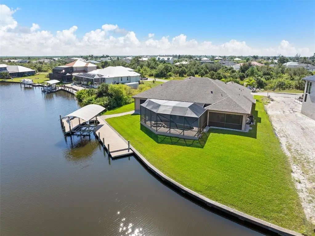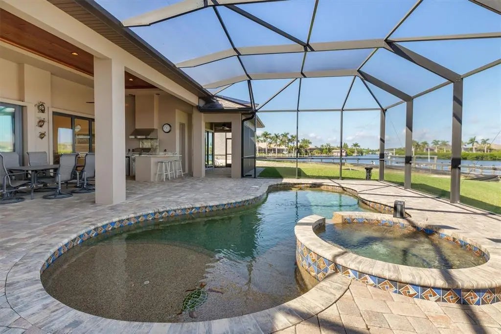 WATERFRONT LUXURY LIVING – “LUKE BROTHERS” CUSTOM MINI ESTATE HOME IN SOUTH GULF COVE! This spectacular 3-bedroom, 3.5-bath, 3-car garage waterfront pool home offers the ultimate blend of luxury, comfort, and Florida coastal charm. Sitting proudly on almost a half-acre sailboat water tip lot with 149 feet of concrete seawall and mesmerizing views of intersecting canals! This property has one of the closest locations to the lock with immediate access to the river! From your covered composite dock with water and electric, a 10,000 LB boat lift, and a lower deck perfect for kayak access, you’ll have quick access to Charlotte Harbor and the Gulf of Mexico. Step inside and feel the elegance immediately. With over 3,200 sq ft of meticulously designed space, this home features two master suites, each with its own private ensuite bath and lanai access. Volume ceilings soar high above with lighted double tray details in the great room, dining room, and both master suites—adding brilliance to every gathering. The porcelain plank tile flooring, plantation shutters, and crown molding create a polished and timeless appeal throughout. The grand center island kitchen is a chef’s dream, complete with rich wood cabinetry, under-cabinet lighting, and Cambria quartz countertops that flow seamlessly through the entire home. Enjoy a built-in pantry with pull-out drawers, slow-close cabinets, and a lighted quartz bar that makes entertaining effortless. Every glance from the kitchen, dining area, and great room leads your eyes to the sparkling pool and wide canal views. Each bedroom is generously sized with walk-in closets, lighted tray ceilings, and spa-inspired bathrooms featuring quartz counters, dual sinks, and tiled walk-in showers with glass enclosures. The oversized three-car garage offers epoxy flooring, a built-in workshop, and a central vacuum system. The brick paver driveway and double leaded-glass entry doors set an impressive tone, while the paver pool deck, under-fascia lighting, and lighted dock path make evenings magical. With sprayed attic insulation, your home stays cool and efficient year-round. Located in the highly desirable South Gulf Cove waterfront community, this property offers convenient access to shopping, dining, Town Center Mall, Boca Grande beaches, and the beautiful Gulf waters. Whether boating, fishing, or relaxing by the pool and spa, every day feels like paradise in this high-quality, custom-built home. Schedule your private showing today and experience waterfront luxury at its finest!