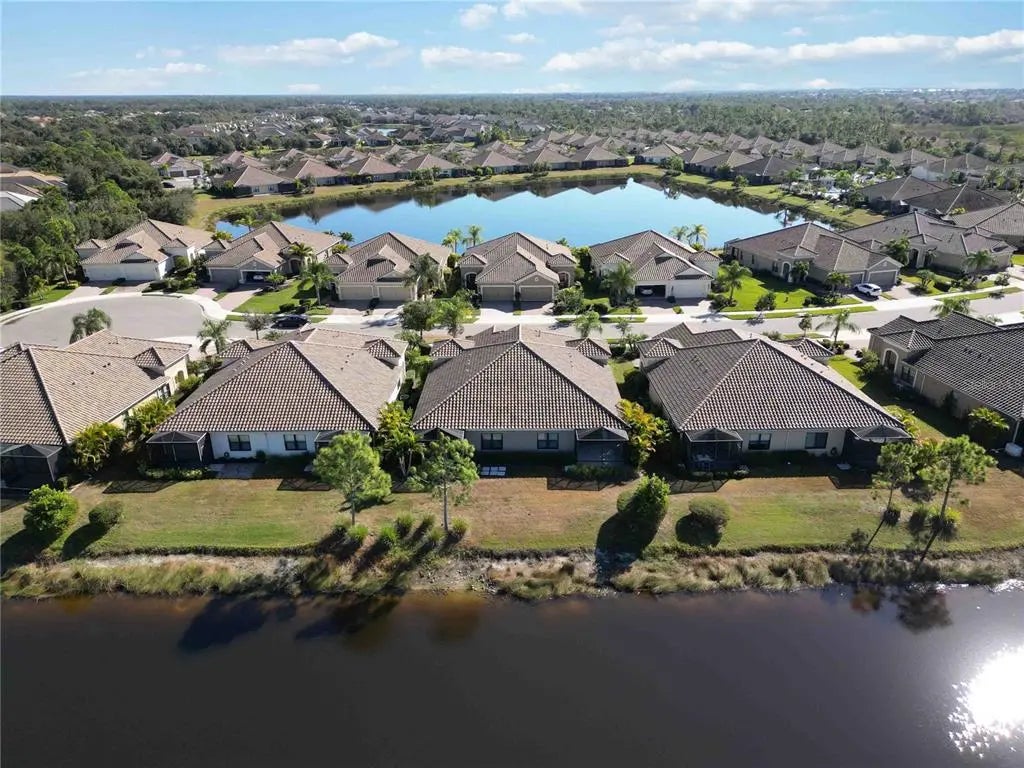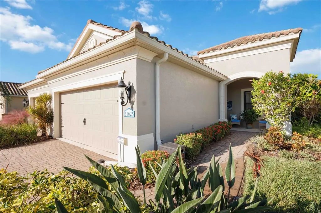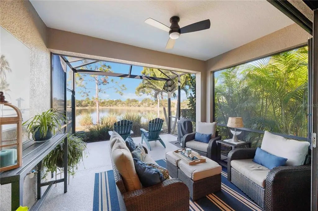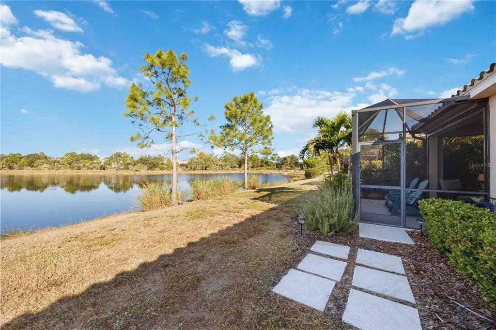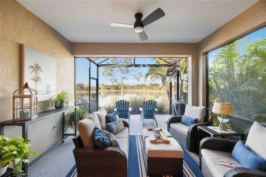 Under contract-accepting backup offers. Welcome home to this beautifully maintained Tidewater Villa featuring 2 bedrooms, 2 baths, and a spacious den/office that can easily function as a third bedroom, located in the highly sought-after community of Grand Palm in Venice. Set on a serene waterfront lot, this residence offers west-facing sunset views from the extended screened lanai, complete with an epoxy-finished floor, picture-window screen cage for unobstructed lake vistas, lush tropical landscaping, and an SPF electric sunshade for added comfort and privacy. A retractable front door screen adds extra convenience and airflow. Inside, you'll appreciate the thoughtful upgrades throughout, including tile flooring in both bedrooms, luxury vinyl plank flooring in the den, coffered ceilings and crown molding in the living room, and custom lighting and fans. The kitchen boasts 42” cabinetry, a country-style sink, natural gas stove, tile backsplash, under-cabinet lighting, and a new garbage disposal. Smart-home features include a smart thermostat and Ring doorbell for added efficiency and security. The primary suite includes dual sinks and a walk-in shower, while the laundry room offers upper cabinets and shelving—and the washer and dryer are included in the sale. Additional conveniences include included window treatments, accordion hurricane shutters, whole-home surge protection, and a garage with elevated storage shelving. Best of all, this property is not in a flood zone, providing peace of mind. Residents of this Tidewater Villa neighborhood enjoy their own private pool and spa just steps away, in addition to the three other community pools in Grand Palm. HOA fees include lawn and landscape care, extensive recreational amenities, and a full calendar of social events. Grand Palm is renowned for its active lifestyle and natural beauty, offering a full-time activities director, state-of-the-art fitness center, pickleball, tennis, bocce, basketball, volleyball, dog parks, fishing piers, and miles of walking and biking trails, plus The Social Club and Exploration Park—all accessible by golf cart. Conveniently located near Downtown Wellen Park and the Atlanta Braves Spring Training facility, you’ll enjoy easy access to dining, shopping, entertainment, festivals, and community events. This Tidewater Villa combines comfort, convenience, and resort-style living in one of Venice’s most desirable neighborhoods.