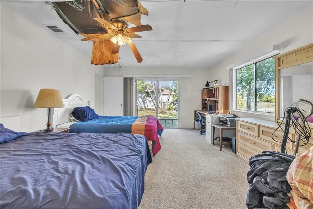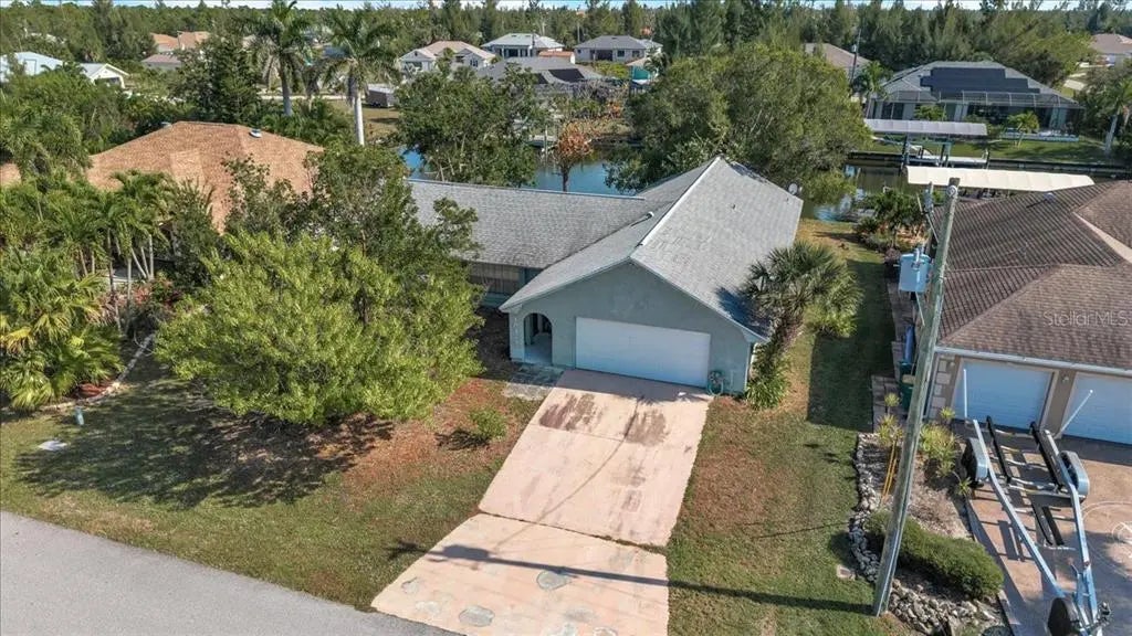 Gulf Access 4-bedroom, 3-bath waterfront home located in the highly sought-after South Gulf Cove community. This property offers 80 feet of waterfront along the Riverside Waterway with true sailboat access to the Myakka River, Charlotte Harbor, and the Gulf of Mexico. Great opportunity for an ideal primary residence or investment property—being sold AS IS with abundant potential. Inside, you enter through the combined living and dining room area, which features sliding doors leading out to the backyard. The space flows into a galley-style kitchen that is open and bright, overlooking the living/dining area and offering plenty of counter and cabinet space, a breakfast bar, and raised-panel white cabinetry. The layout continues into the spacious family room, which also includes sliders opening to the outdoor area. On one side of the home, you’ll find a primary bedroom with a built-in closet and an attached bathroom featuring an additional mirrored closet, a walk-in tiled shower, and an extended vanity with a single sink. The second primary bedroom is located on the opposite side of the home and has extensive ceiling damage. This room also includes an attached bathroom with a walk-in closet and a walk-in shower. Two additional guest bedrooms share a full bathroom, providing comfortable accommodations for family or visitors. Additional features include a 2-car garage and a dedicated laundry room, A/C (2016), and plenty of storage space. The home offers 1,920 square feet of living area and a mix of tile and carpeted flooring throughout. The South Gulf Cove community is well-known for its excellent fishing and proximity to golf courses, with plenty of nearby shopping, dining, and entertainment options. Please note: the home has experienced interior ceiling damage from past hurricanes and will require repairs, offering a great opportunity to customize and update to your preferences. **PLEASE ENJOY THE 3D INTERACTIVE VIRTUAL TOUR ASSOCIATED WITH THIS LISTING**