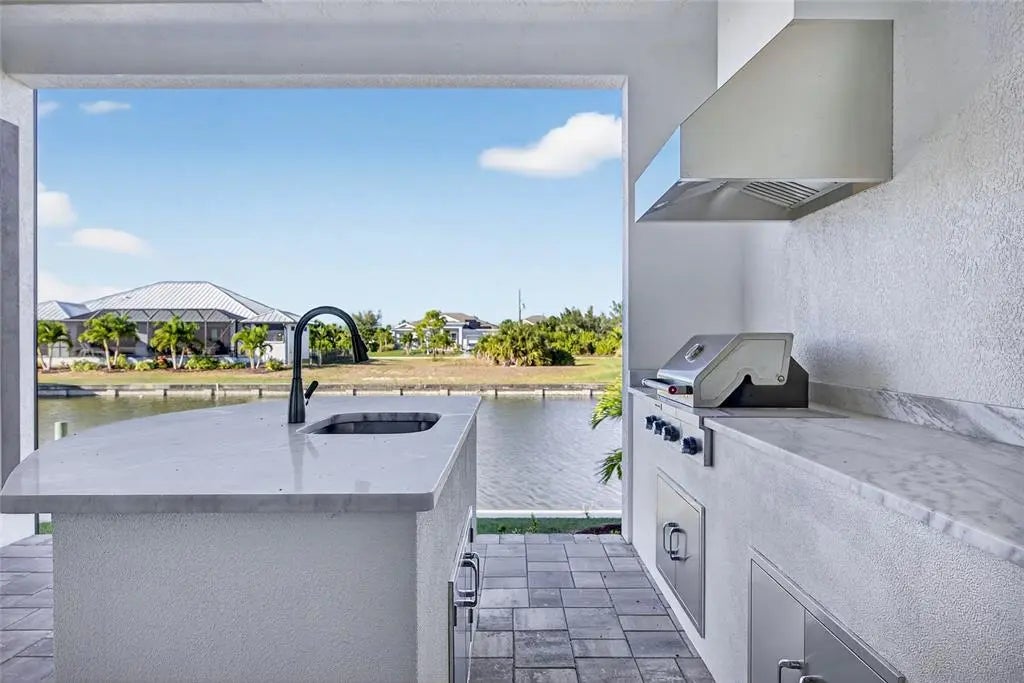 One or more photo(s) has been virtually staged. SOUTH GULF COVE! BUILT IN 2024! ONE-OF-A-KIND CUSTOM-BUILT 3 BEDROOM, 2 BATH, 2-CAR GARAGE WATERFRONT POOL HOME WITH SAILBOAT ACCESS TO CHARLOTTE HARBOR LEADING TO THE GULF! 84’ of waterfrontage with concrete seawall and 40’ dock. DOUBLE ENTERTAINING SPACES featuring double door entry into a spacious front courtyard with saltwater pool, pavers and plenty of room for entertaining plus backyard lanai to grill, relax and enjoy the water views. Step inside to contemporary styling featuring high ceilings with tray and custom accents, crown molding, large pocketing slider to water views in great room, private office and luxury vinyl flooring. Modern kitchen features European-style cabinetry, high-end Samsung appliances, leathered granite countertops, subway tile backsplash and casual dining area with huge aquarium window to enjoy panoramic water views. Generous primary suite offers lighted tray ceiling, access to back lanai, large walk-in closet with custom organizers and private bath with dual vanities, custom-tiled walk-in shower. Split floor plan provides privacy for all as guests enjoy their own wing including two bedrooms with walk-in closets and full bath. Spacious back lanai features wood ceiling details and outdoor full outdoor kitchen with granite counters, island with sink, mini-fridge and gas grill with range hood-great space for entertaining guests. Impact windows and roll-down hurricane protection on lanai provide peace of mind. Additional special features include indoor laundry room, tankless hot water heater, solid core custom interior doors, multi-zone irrigation system, epoxy garage floor, impact garage door and exterior with tropical landscaping giving exceptional curb appeal. South Gulf Cove community offers voluntary HOA with clubhouse for special events, four parks nearby including South Gulf Cove Park and Boat Ramp and close to fine dining, shopping, parks, numerous golf courses, boating, and a short drive to Boca Grande and Don Pedro Island beaches. Don’t miss the opportunity to make this unique property your new Florida retreat! Schedule your private showing today!