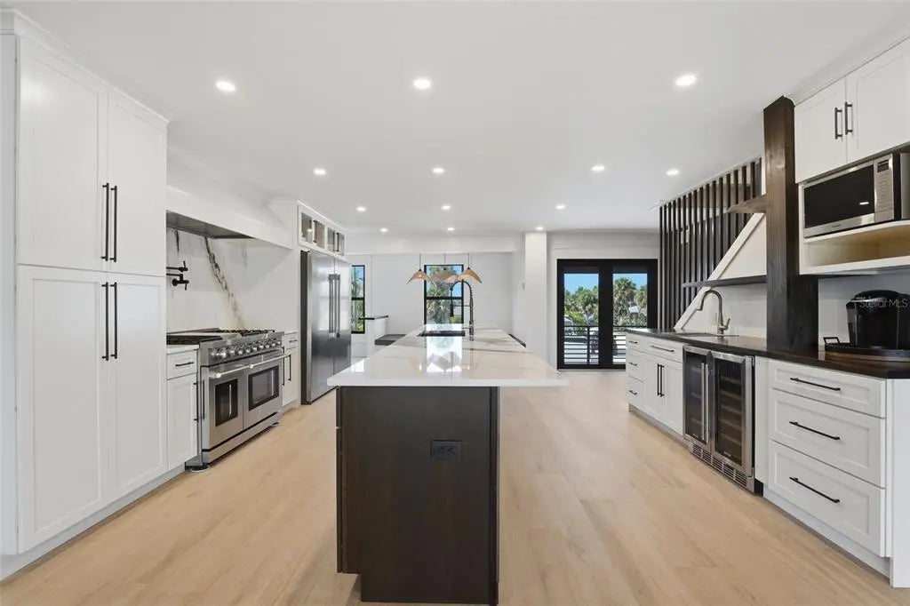 One or more photo(s) has been virtually staged. A rare opportunity to own a thoughtfully reimagined grand coastal waterfront estate on the highly coveted barrier island of Manasota Key, where peaceful coastal living meets exceptional flexibility and long-term value. This nearly new-construction home was taken down to the frame and meticulously rebuilt from the ground to the top, including new electrical and plumbing, blending a Modern Beach House aesthetic with elegant coastal influences and designer finishes throughout. Set along the tranquil waters of Lemon Bay with panoramic bay views, the property remains privately tucked away while offering DEEDED BEACH ACCESS shared by only five neighbors—just steps to the Gulf and a short golf cart ride to dining, live music, and public beaches. Designed to accommodate a primary residence, seasonal retreat, or high-end short-term rental investment, the home offers over 4700 sq. ft. of total space across multiple levels, including an expansive, fully enclosed ground floor ready for future customization. The seller continues to enhance the property with additional finishes, and the sale includes a NEW SEAWALL AND HEATED SWIMMING POOL, further elevating both lifestyle and investment appeal. The main living level features an open-concept design anchored by a chef-inspired kitchen with a commercial-grade gas range, 14 foot center island, commercial refrigerator, beverage coolers, and abundant storage. Living and dining areas open seamlessly to a full-length screened waterfront balcony overlooking Lemon Bay—ideal for relaxed entertaining and sunset evenings. A secondary balcony off the kitchen provides an additional peaceful outdoor retreat. The home is well-suited for large or multi-generational living, offering three expansive primary suites with luxurious en-suite baths, along with a flexible fourth sleeping area designed for bunk beds and pre-wired for TVs. Spa-inspired bathrooms feature floating vanities, accent lighting, walk-in showers, freestanding tubs, and custom closets with built-ins. The third-floor primary suite serves as a private retreat with its own open-air terrace, oversized closet, private laundry, and breathtaking views of the bay and Gulf Coast skies. An additional flex room with a full bath provides versatility as a bedroom, office, or den. The concrete-constructed ground level is a blank canvas with impact doors and windows, opening to a covered paver patio prepped for an outdoor kitchen—perfect for future living space, guest quarters, a game room, or theater. Additional highlights include impact-rated windows and doors with privacy tinting, sound-dampening wall systems, luxury plank tile flooring, new HVAC systems, tankless gas water heaters, a buried propane tank with generator readiness, a full RV hookup, and public water and sewer. A large front parking area was originally designed for a garage with an apartment and even a pickleball court, offering further expansion potential. Plans are also available for a dock, boat lifts, and a kayak launch. Quiet, private, and thoughtfully designed, this Manasota Key estate offers a rare blend of serenity, craftsmanship, and possibility. Whether you envision a refined personal retreat or a premier coastal investment, this exceptional waterfront property stands ready to deliver.